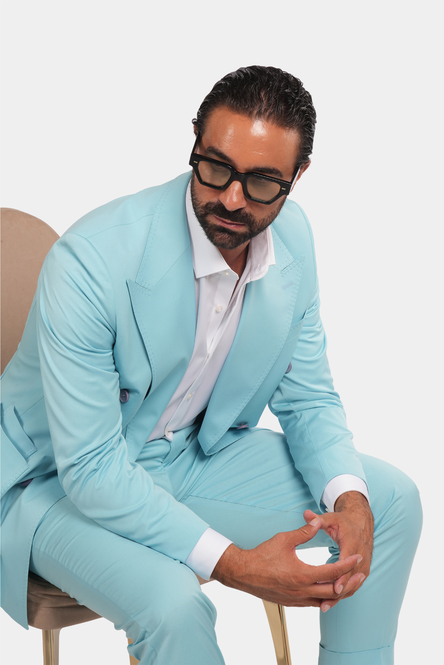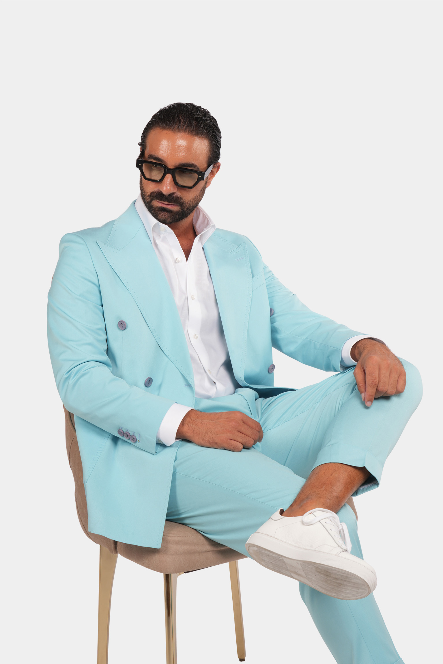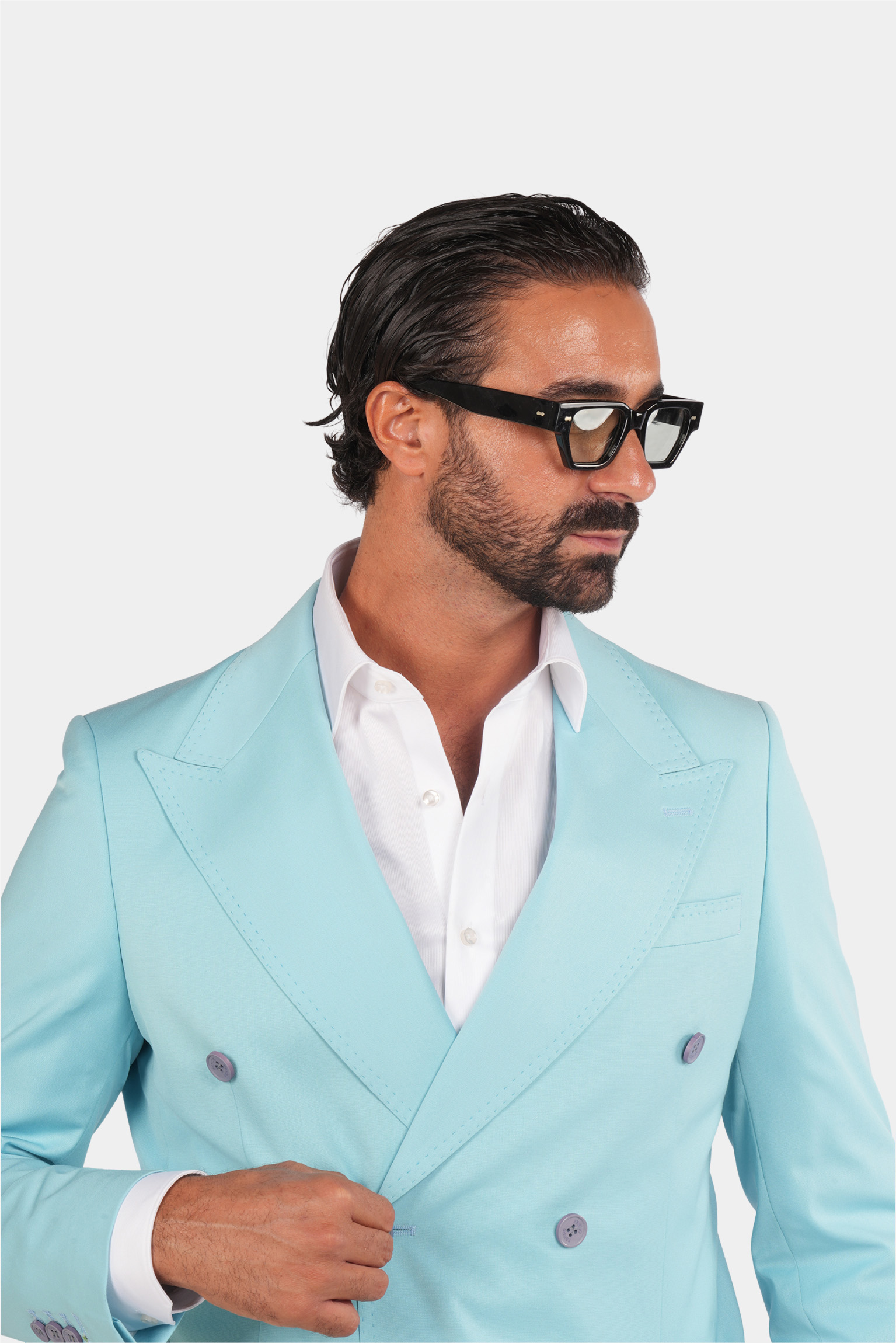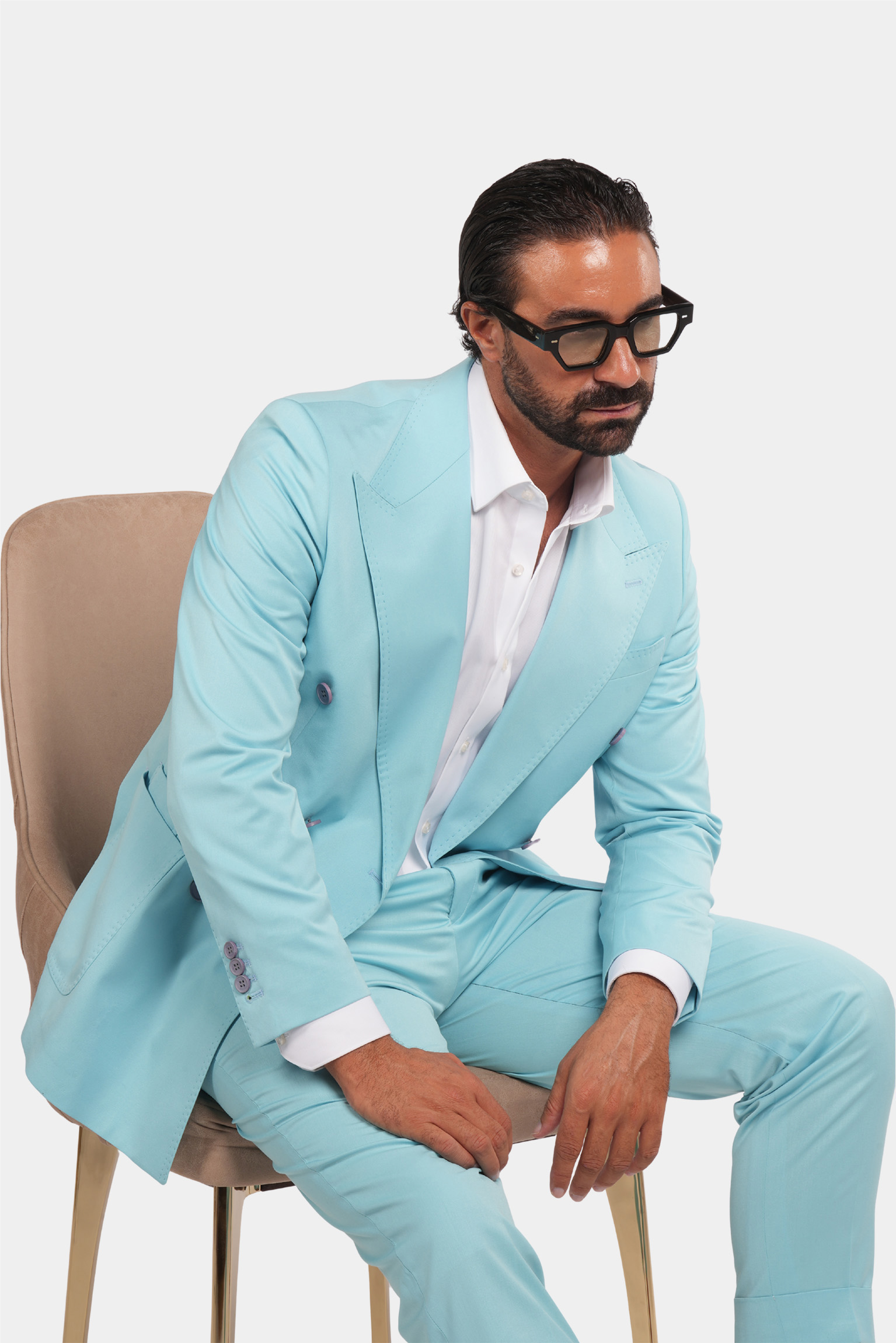 Dieser türkisfarbene Zweireiher ist ein stilvolles und formelles Produkt mit italienischem Design und hochwertigem Stoff. Sowohl der Blazer als auch die Hose dieses Produkts sind sehr schön und haben ausgezeichnete und präzise Nähte.