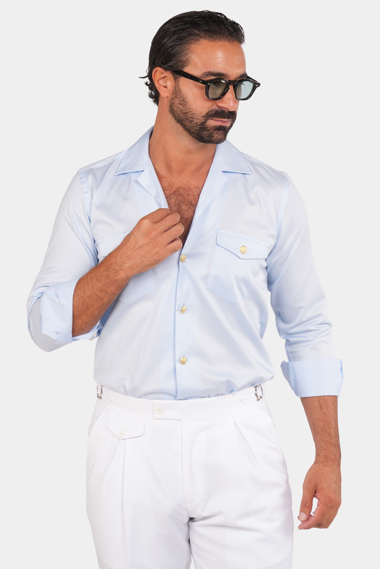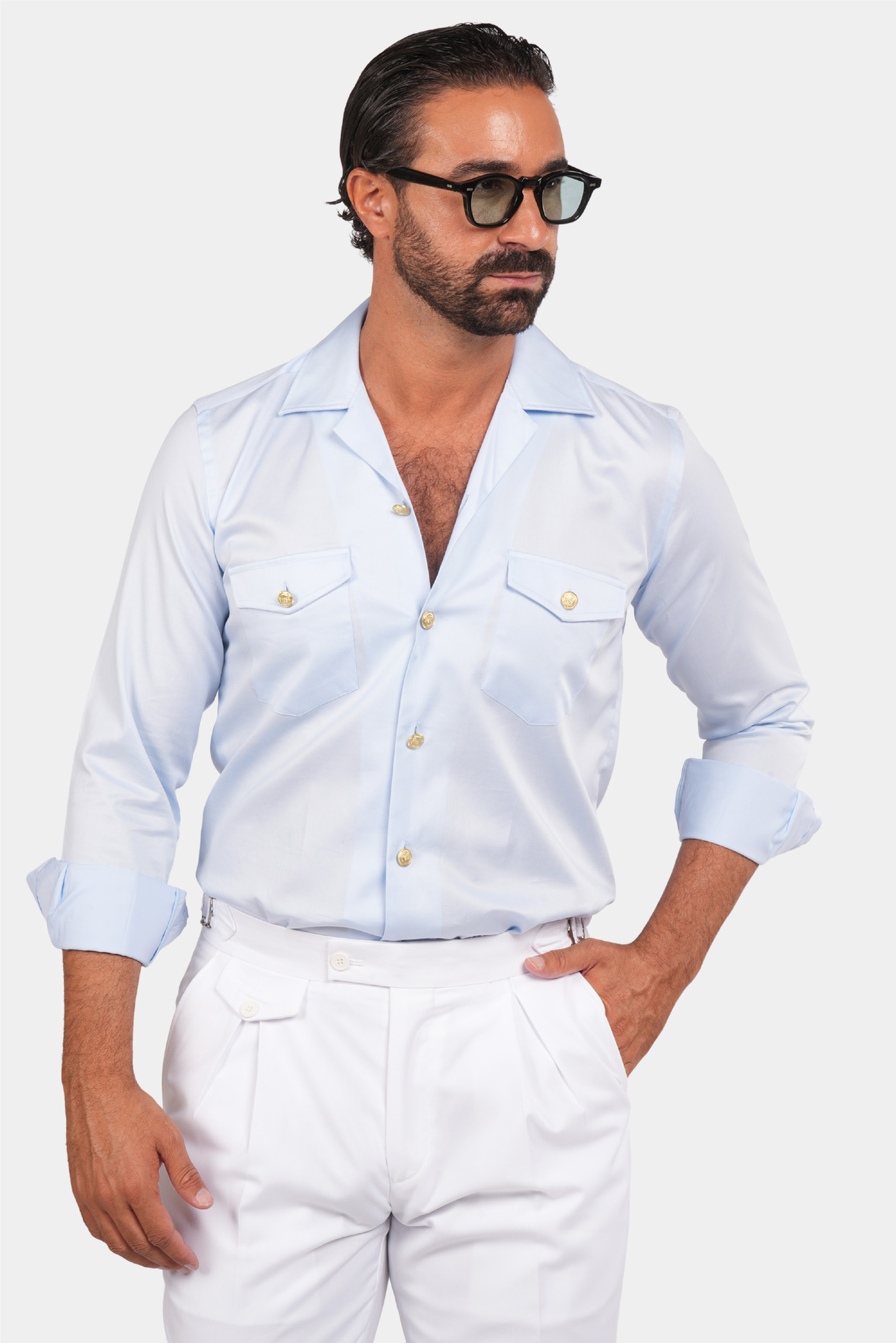 Wenn es darum geht, stilvoll zu kleiden, machen Details den Unterschied. Inspiriert vom klassischen italienischen Stil, wurde das hellblaue Safari-Hemd so designt, dass es Eleganz, Komfort und Funktionalität in einem Kleidungsstück vereint. Es hat einen modernen Schnitt und goldene Knöpfe, die seinen Charme noch verstärken. Dieses Hemd wird nicht nur Eleganz zu deinem Stil hinzufügen, sondern dich auch mit seinem cleveren Design in jeder Situation hervorstechen lassen.