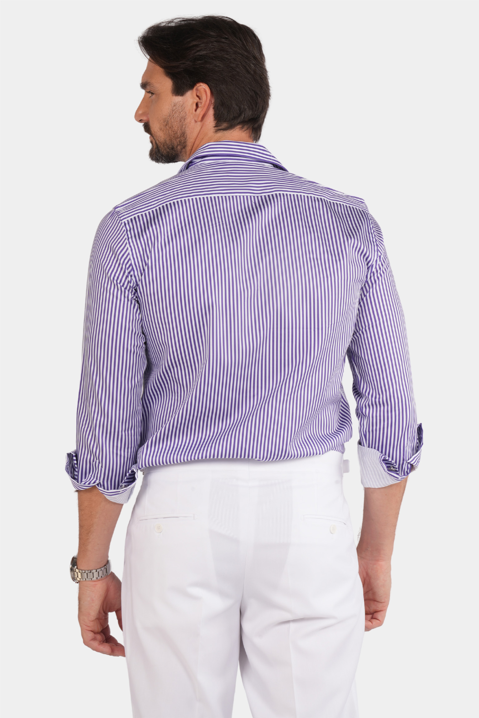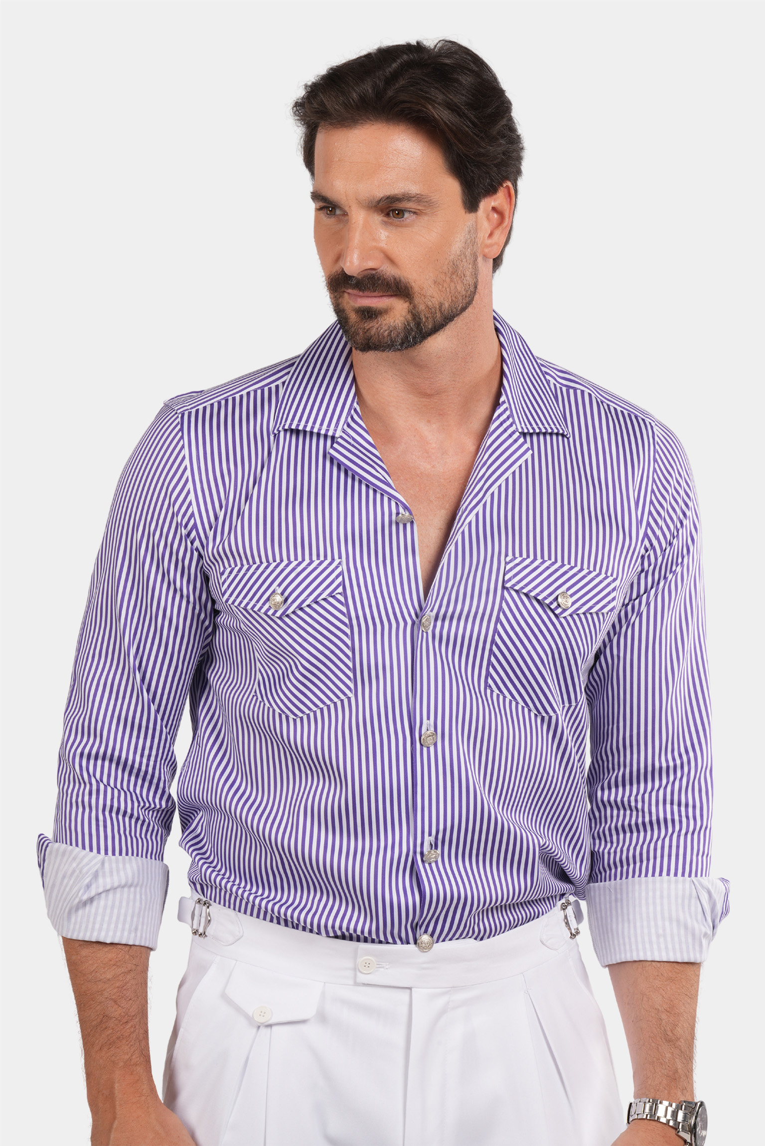 Dieses Safari-Hemd für Herren mit einem schmalen lila und weißen gestreiften Design ist eine großartige Wahl für sowohl legere als auch formelle Styles. Der 100 % Baumwollstoff sorgt für hohen Komfort und Atmungsaktivität. Das Kragen-Design, zusammen mit eleganten silberfarbenen Knöpfen und den geknöpften Klappentaschen auf der Brust, schafft eine Kombination aus klassischem und modernem Stil. Dieses Hemd ist eine ausgezeichnete Wahl für formelle und informelle Partys, spezielle Arbeitsstile und freundschaftliche Zusammenkünfte.