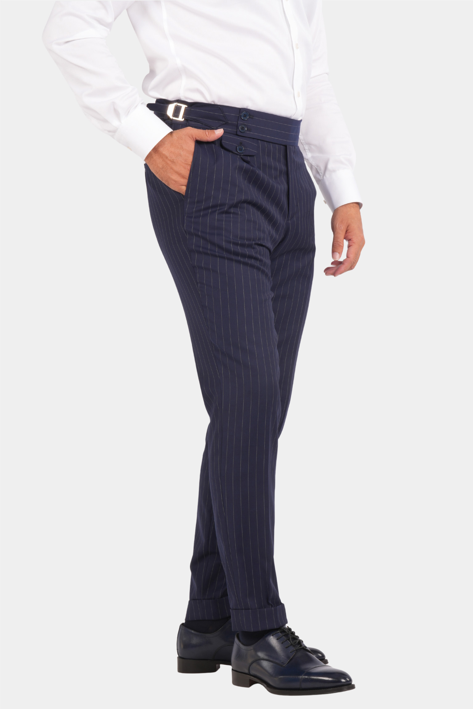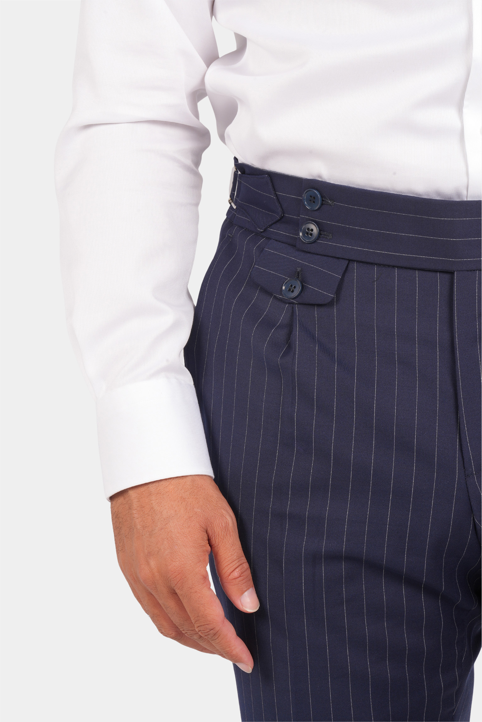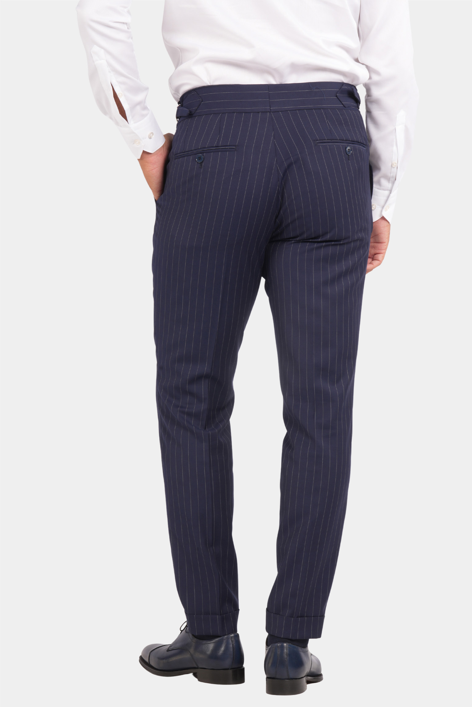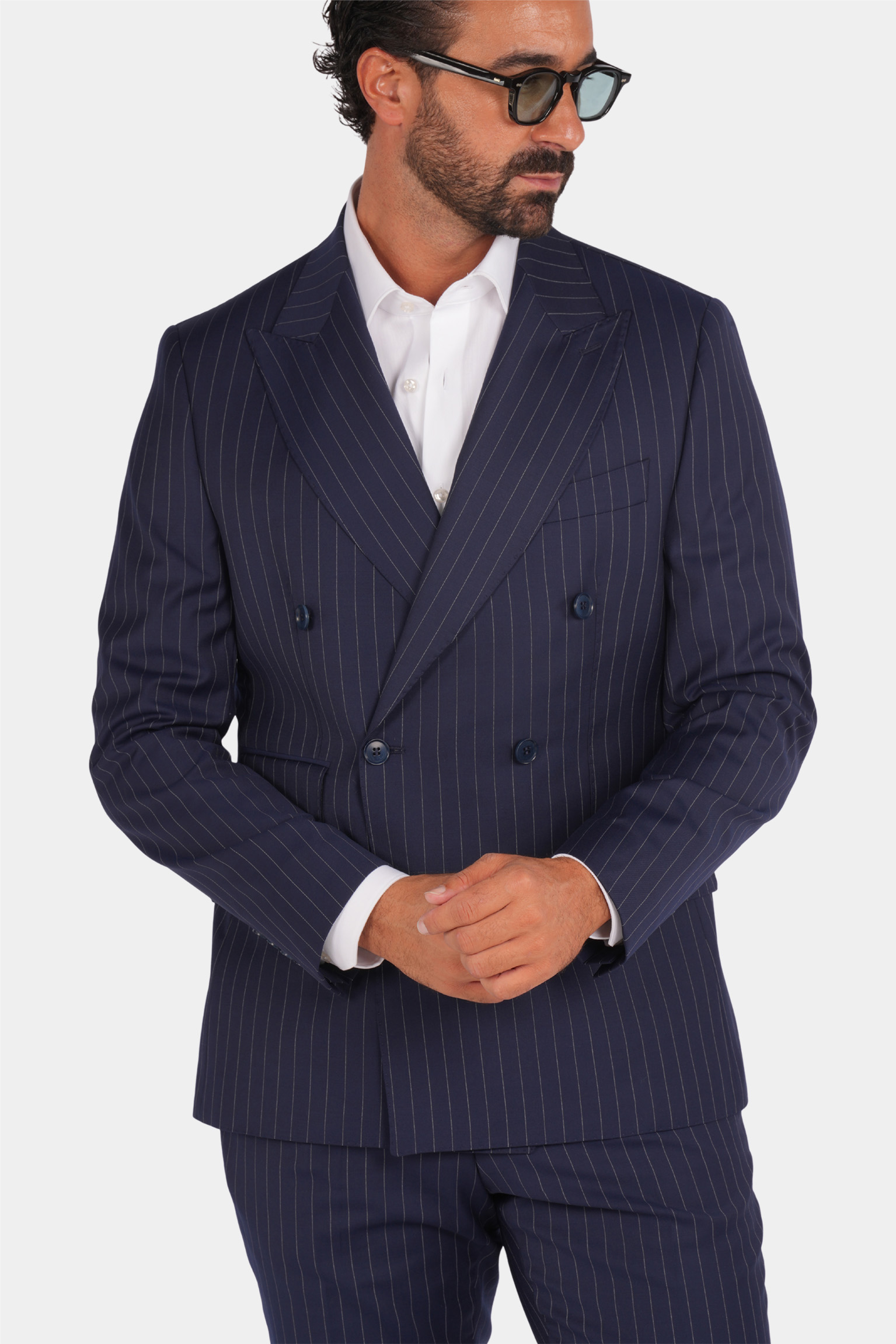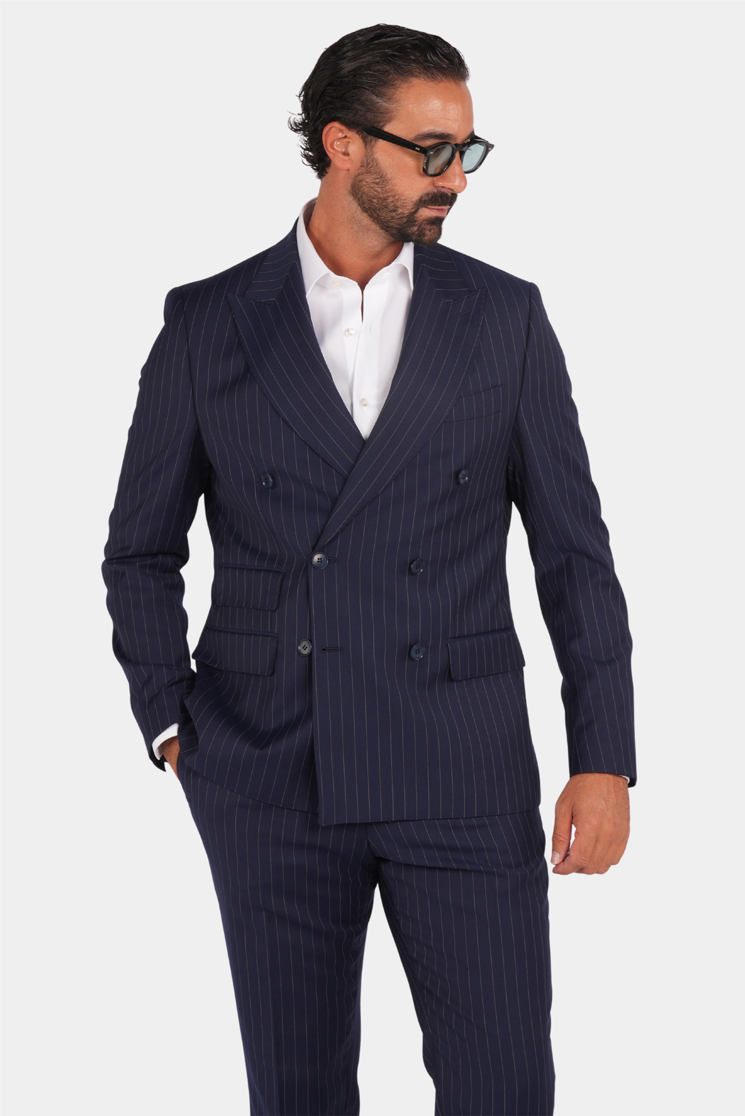 Dieser marineblaue Slim-Fit-Zweireiher mit feinem Nadelstreifenmuster vereint italienische Eleganz mit einer modernen Silhouette. Gefertigt aus 100 % Super 120s-Wolle von Vitale Barberis Canonico, besticht der Anzug durch ein edles Streifendessin, das dem klassischen Design Tiefe und Charakter verleiht. Das steigende Spitzrevers unterstreicht den strukturierten, selbstbewussten Look, während die Halb-Canvas-Konstruktion für Langlebigkeit und einen natürlich fließenden Fall sorgt. Vollständig mit Viskose gefüttert, bietet der Anzug ein glattes, komfortables Tragegefühl und ein luxuriöses Finish.