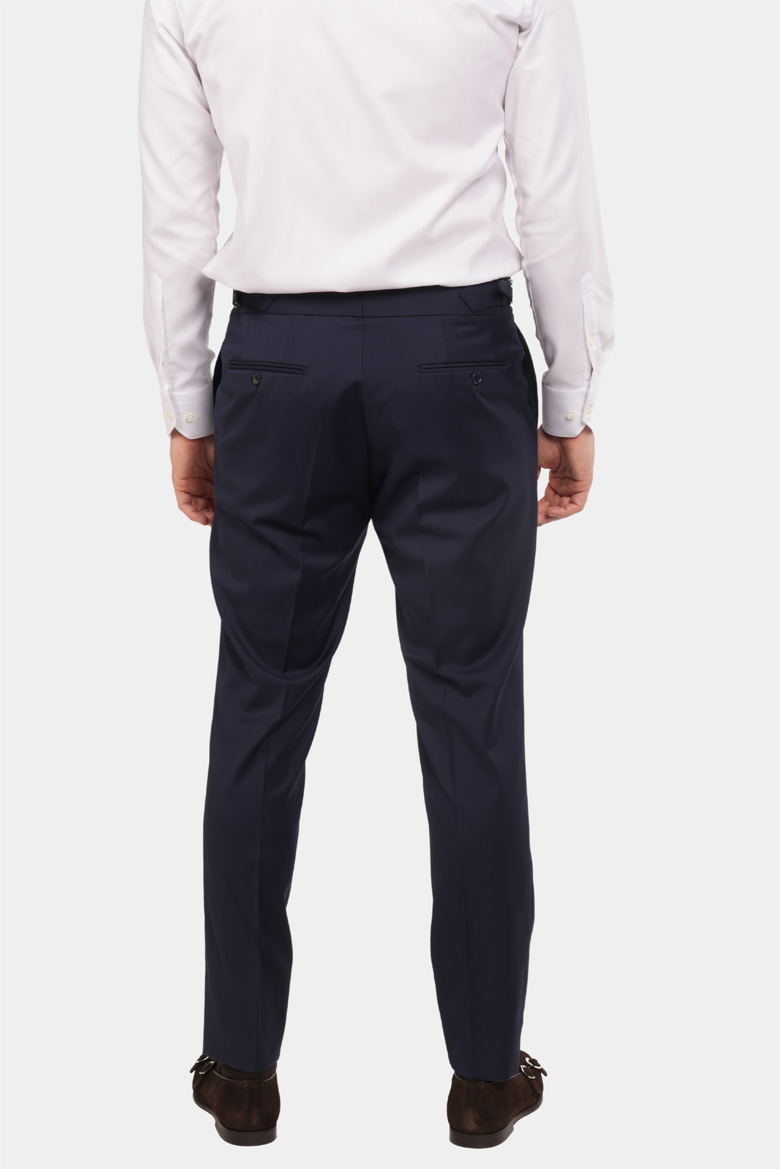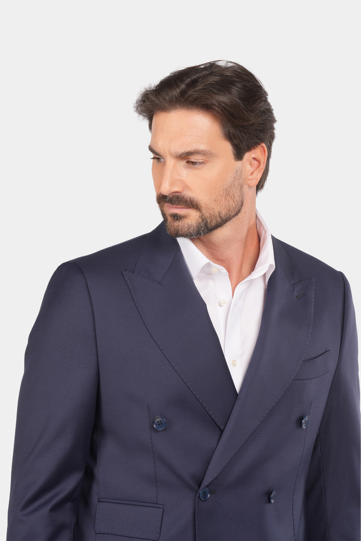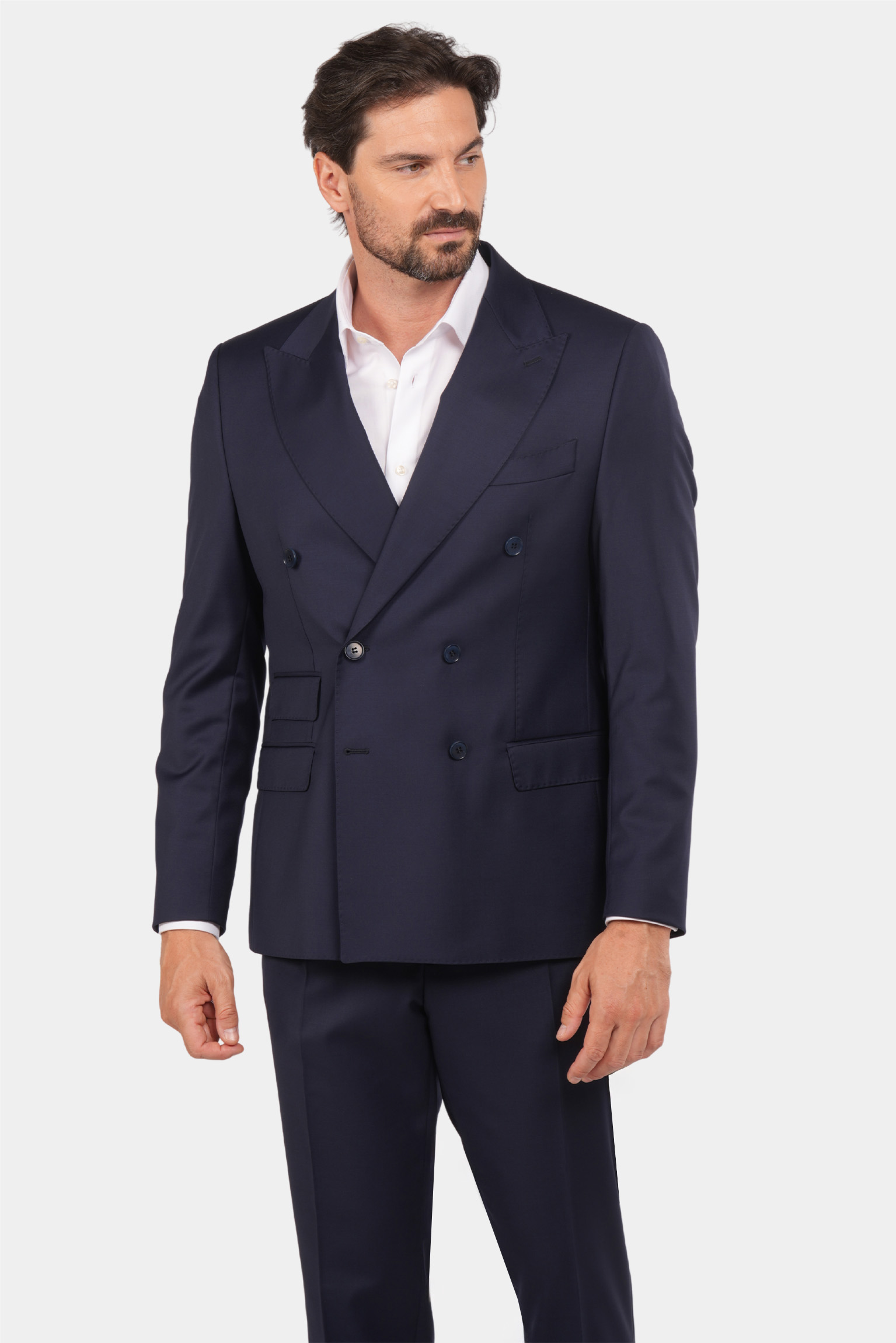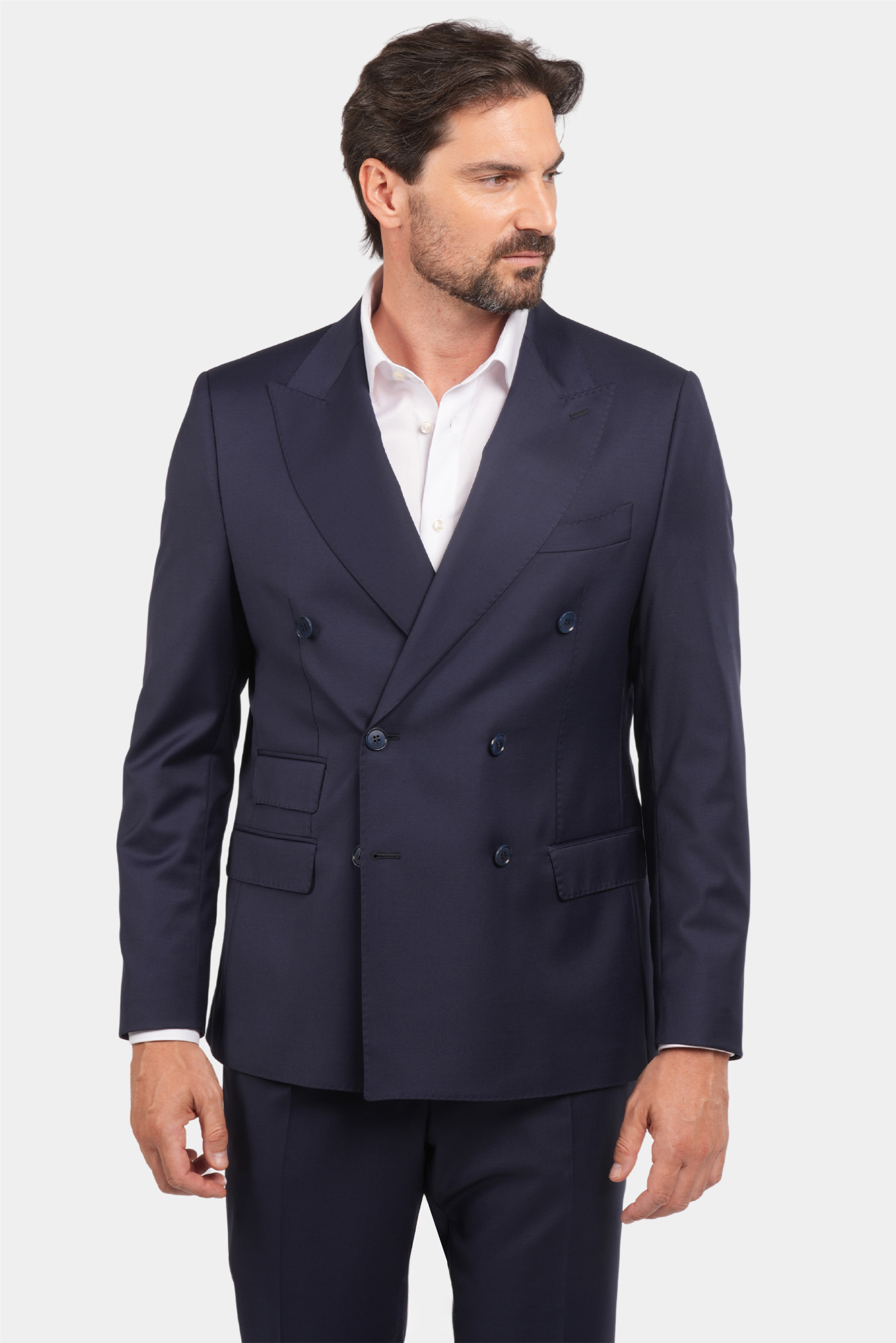 Dieser marineblaue Slim-Fit-Zweireiher vereint zeitlose italienische Schneiderkunst mit einem modernen, raffinierten Stil. Meisterhaft gefertigt in Italien aus 100 % Super 120s-Wolle von Vitale Barberis Canonico, überzeugt er durch seine glatte Textur, elegante Struktur und dauerhaften Tragekomfort. Das steigende Spitzrevers und die Halb-Canvas-Konstruktion sorgen für eine markante, ausgewogene Silhouette, während das vollständige Viskosefutter ein luxuriöses Innenfinish bietet.