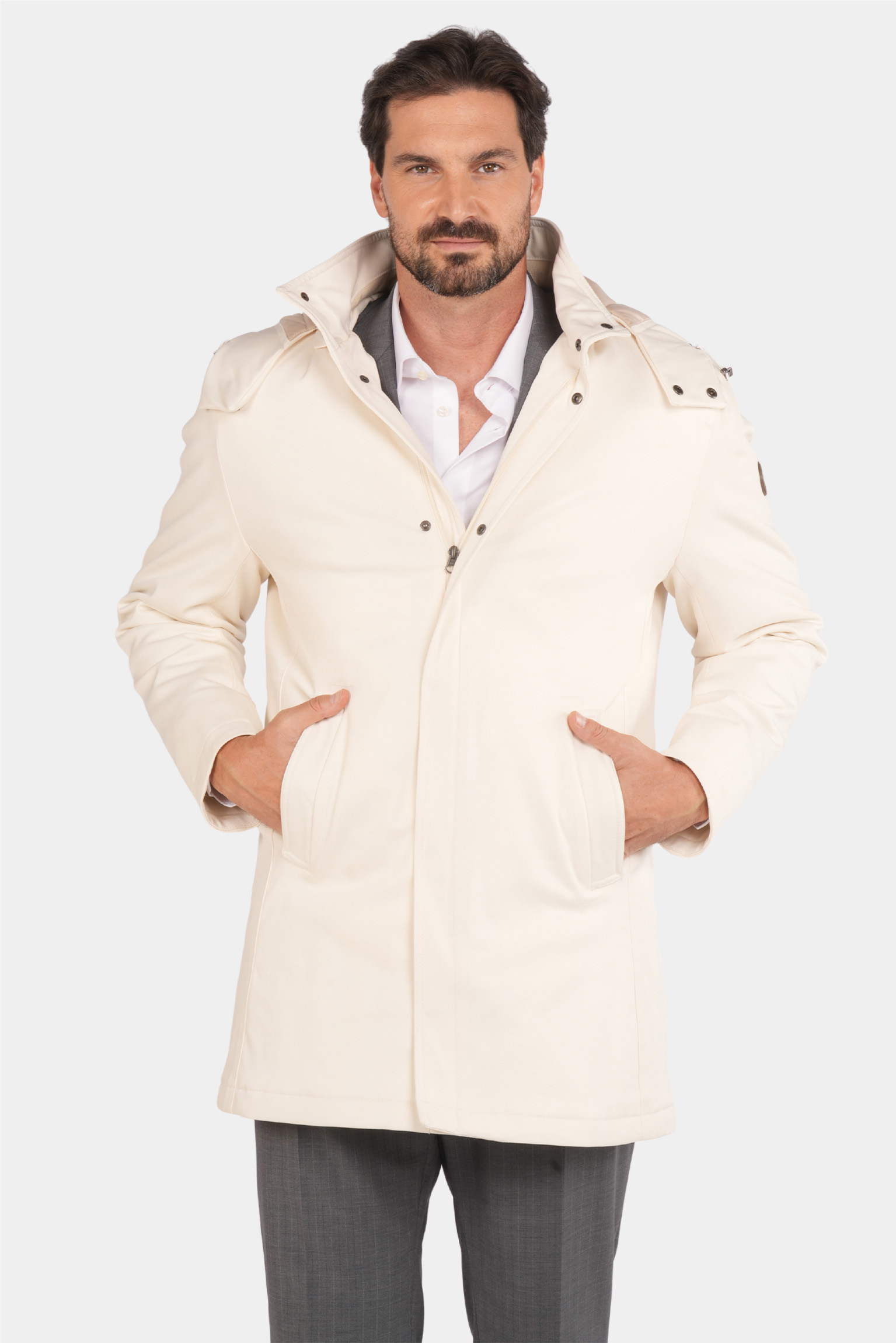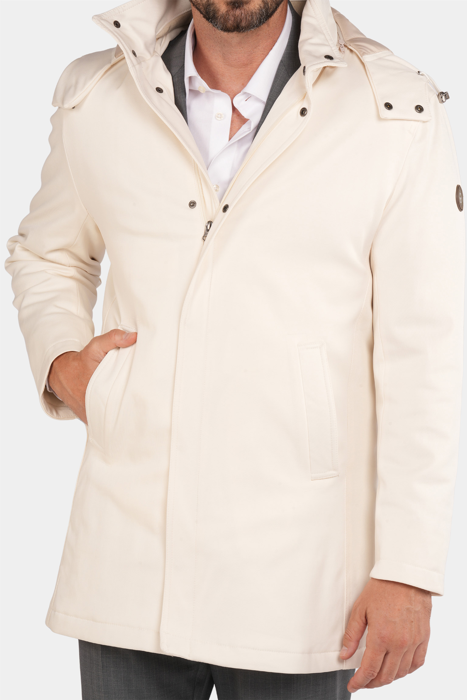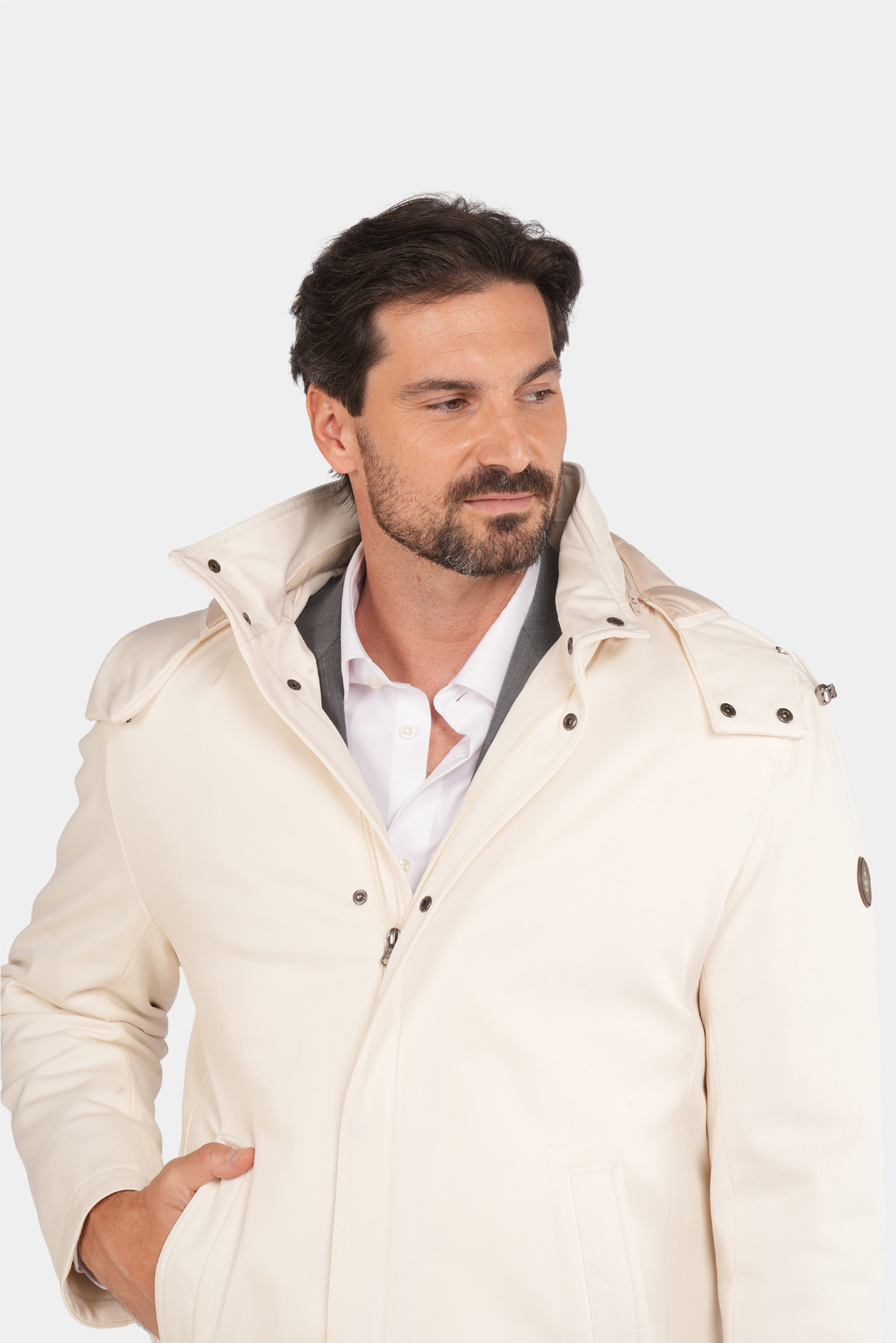 Diese off-white Jacke ist aus einer hochwertigen Mischung von 53% Polyester, 44% Baumwolle und 3% Elastan gefertigt, was sowohl Komfort als auch Langlebigkeit bietet. Das Design ist italienisch und zeichnet sich durch eine moderne und anspruchsvolle Ästhetik mit einer vielseitigen Passform aus, ideal für kältere Jahreszeiten. Die elegante Struktur des Mantels wird durch praktische Details wie den verstellbaren Kragen und die Taschen ergänzt, was ihn sowohl funktional als auch stilvoll macht.