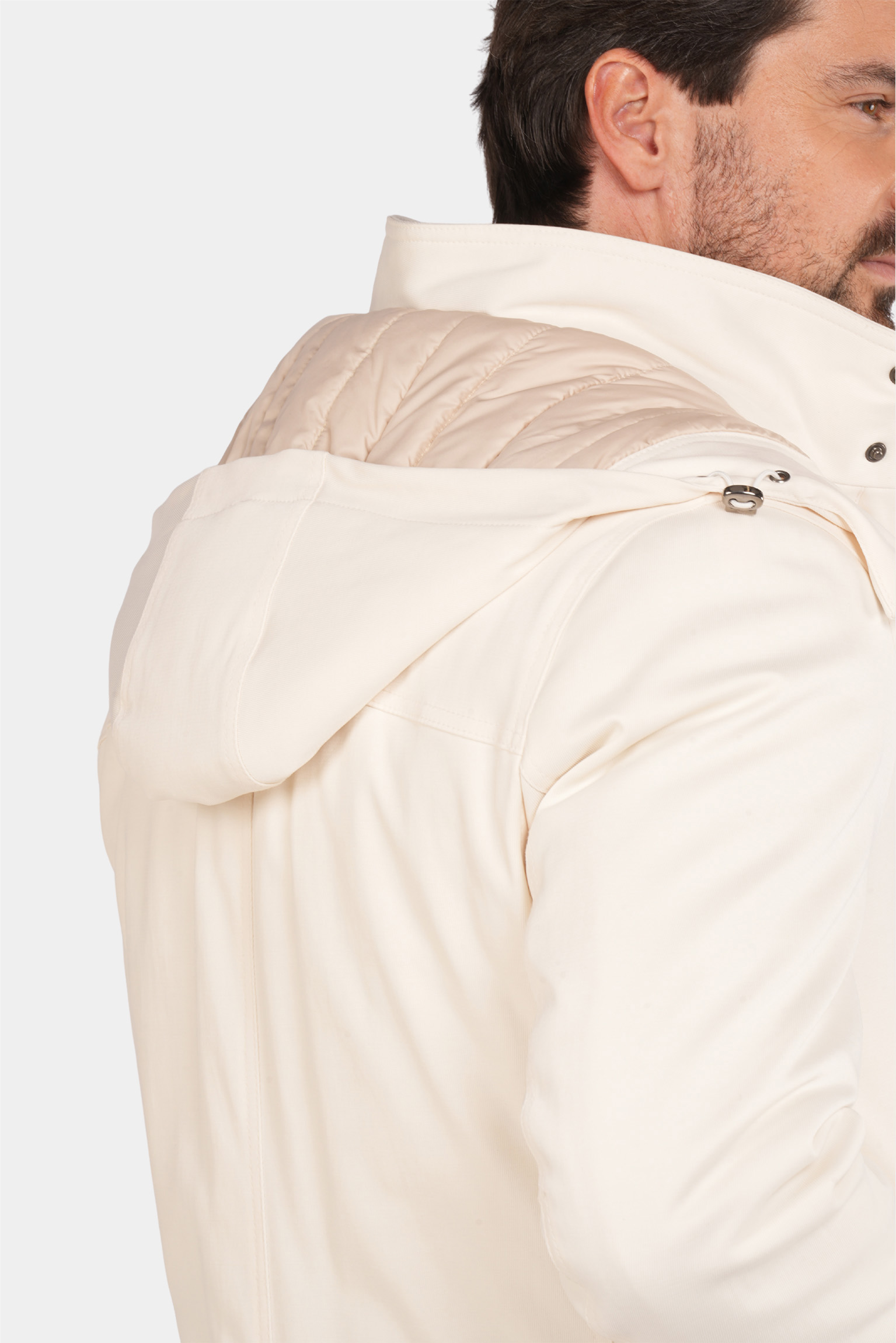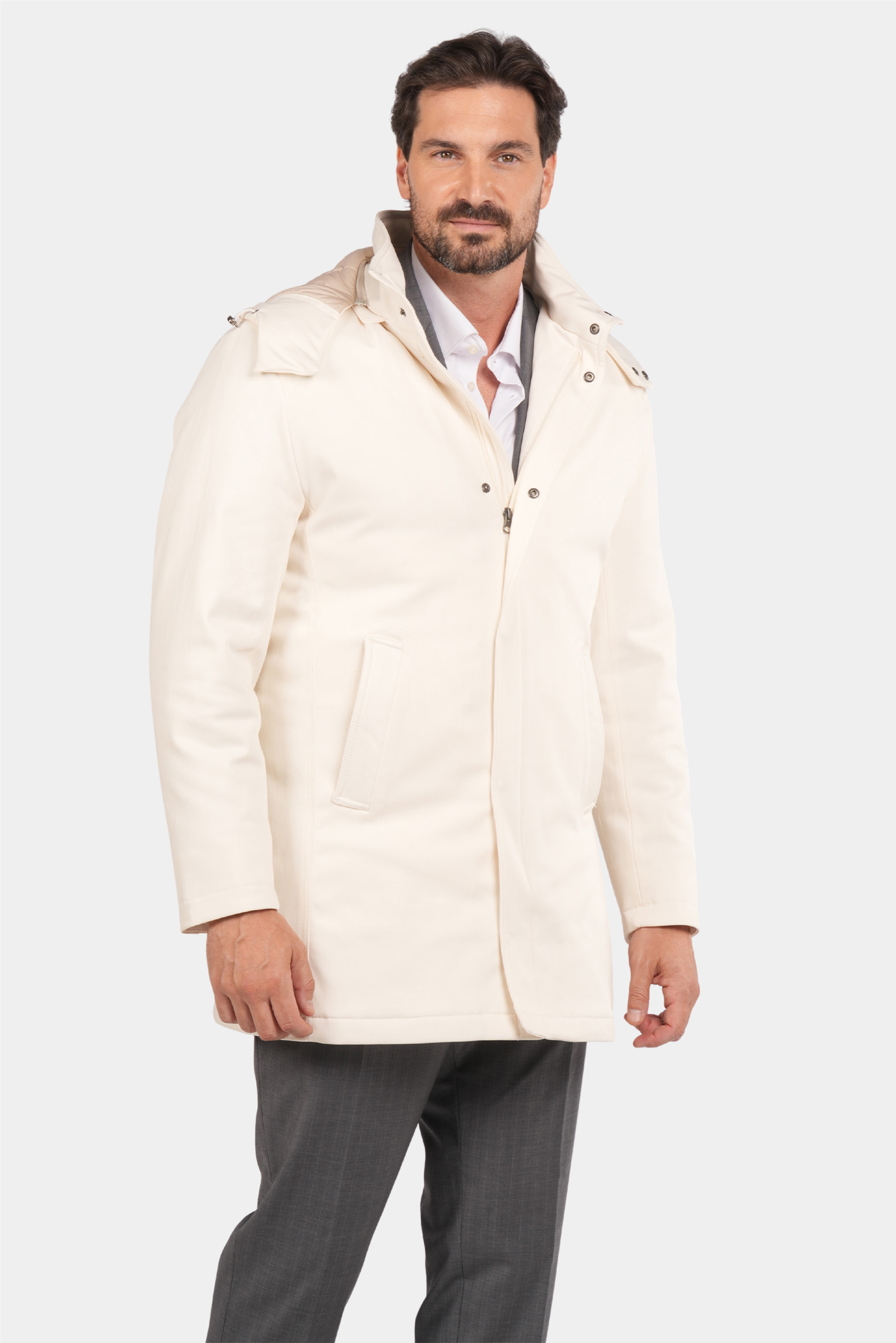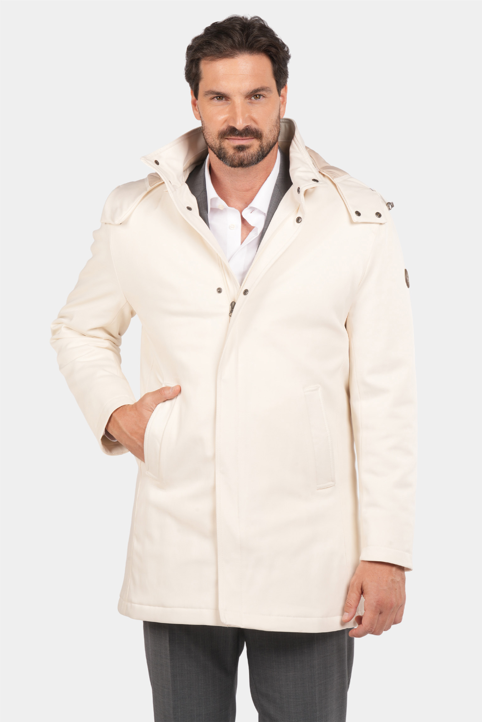 Diese off-white Jacke ist aus einer hochwertigen Mischung von 53% Polyester, 44% Baumwolle und 3% Elastan gefertigt, was sowohl Komfort als auch Langlebigkeit bietet. Das Design ist italienisch und zeichnet sich durch eine moderne und anspruchsvolle Ästhetik mit einer vielseitigen Passform aus, ideal für kältere Jahreszeiten. Die elegante Struktur des Mantels wird durch praktische Details wie den verstellbaren Kragen und die Taschen ergänzt, was ihn sowohl funktional als auch stilvoll macht.