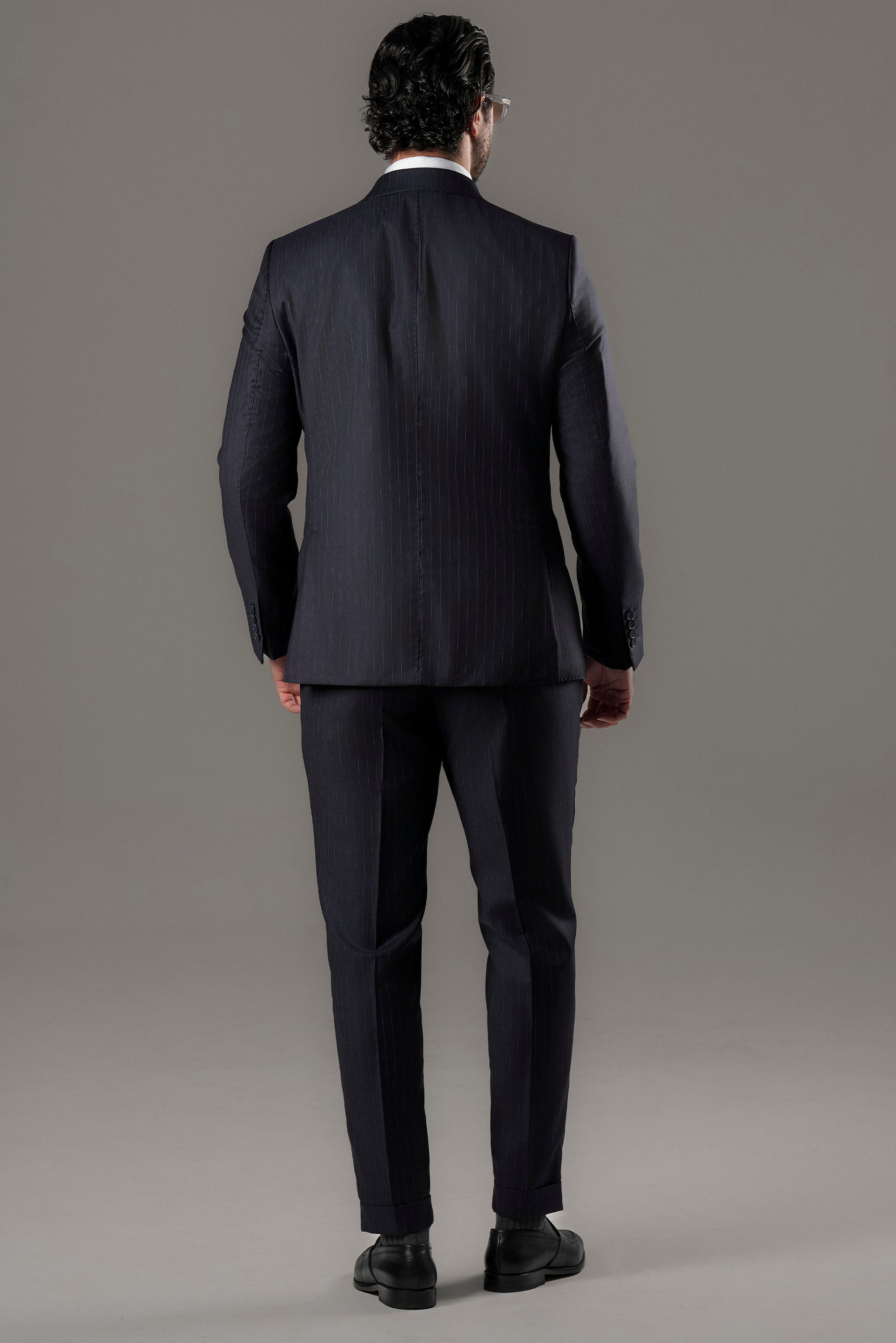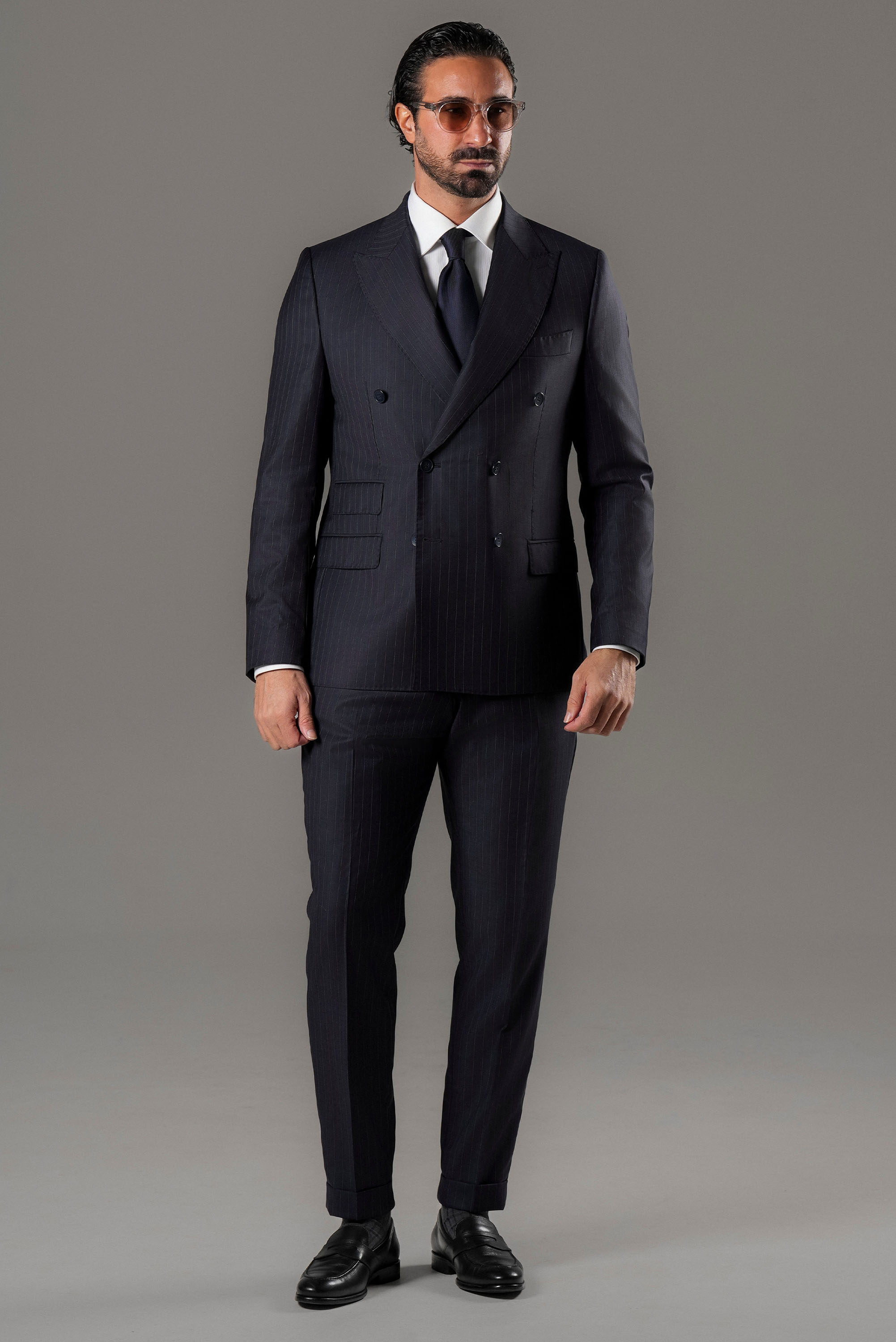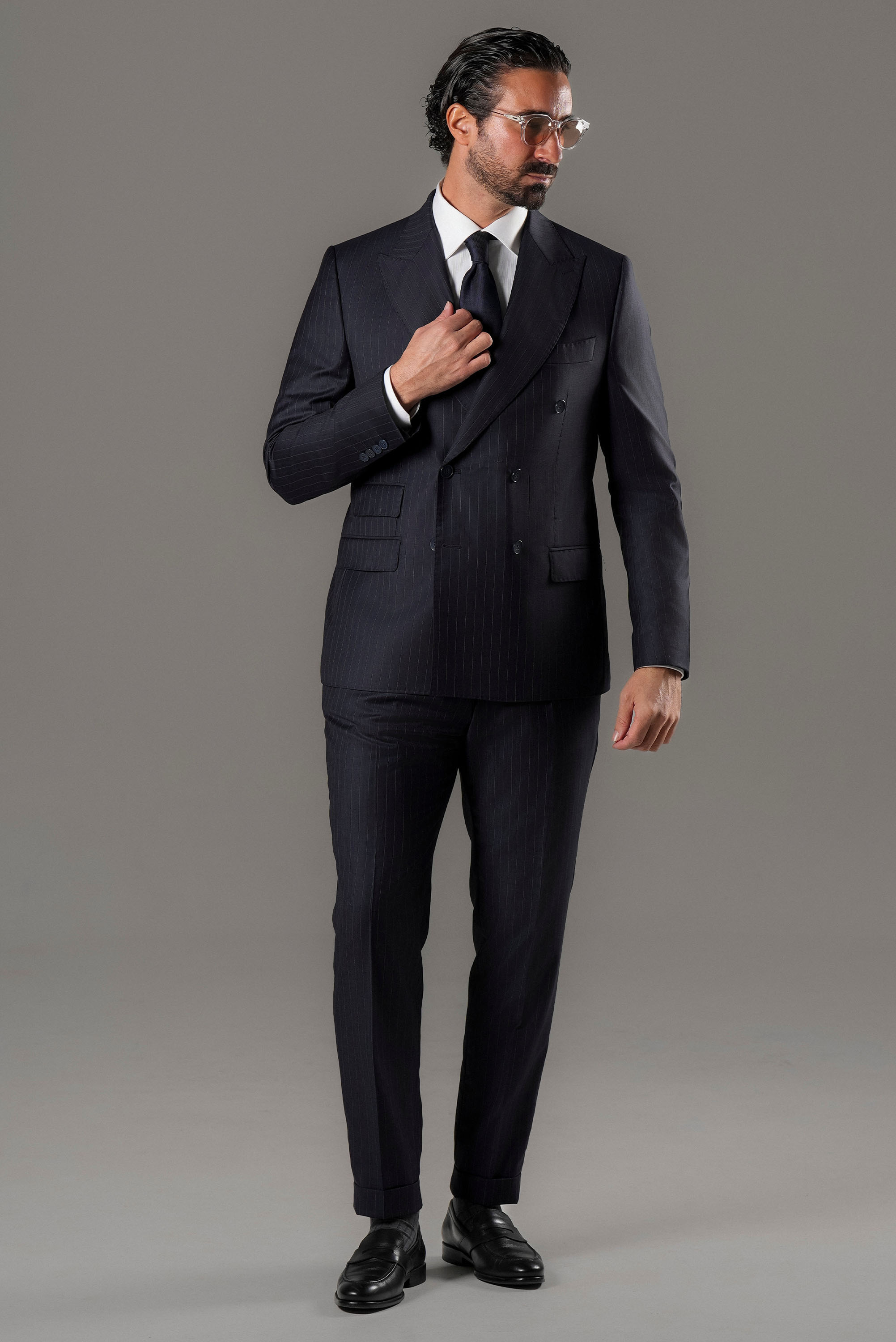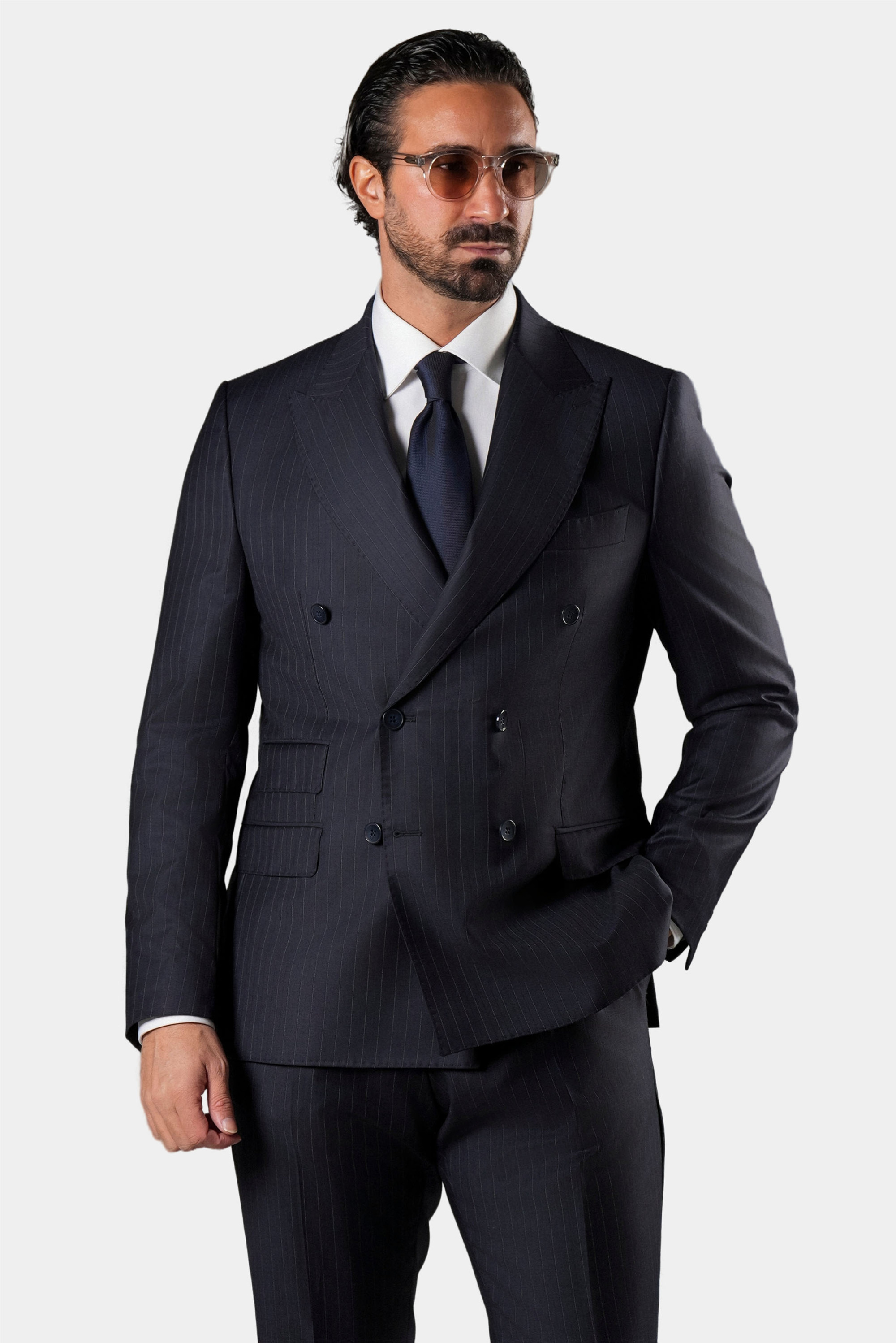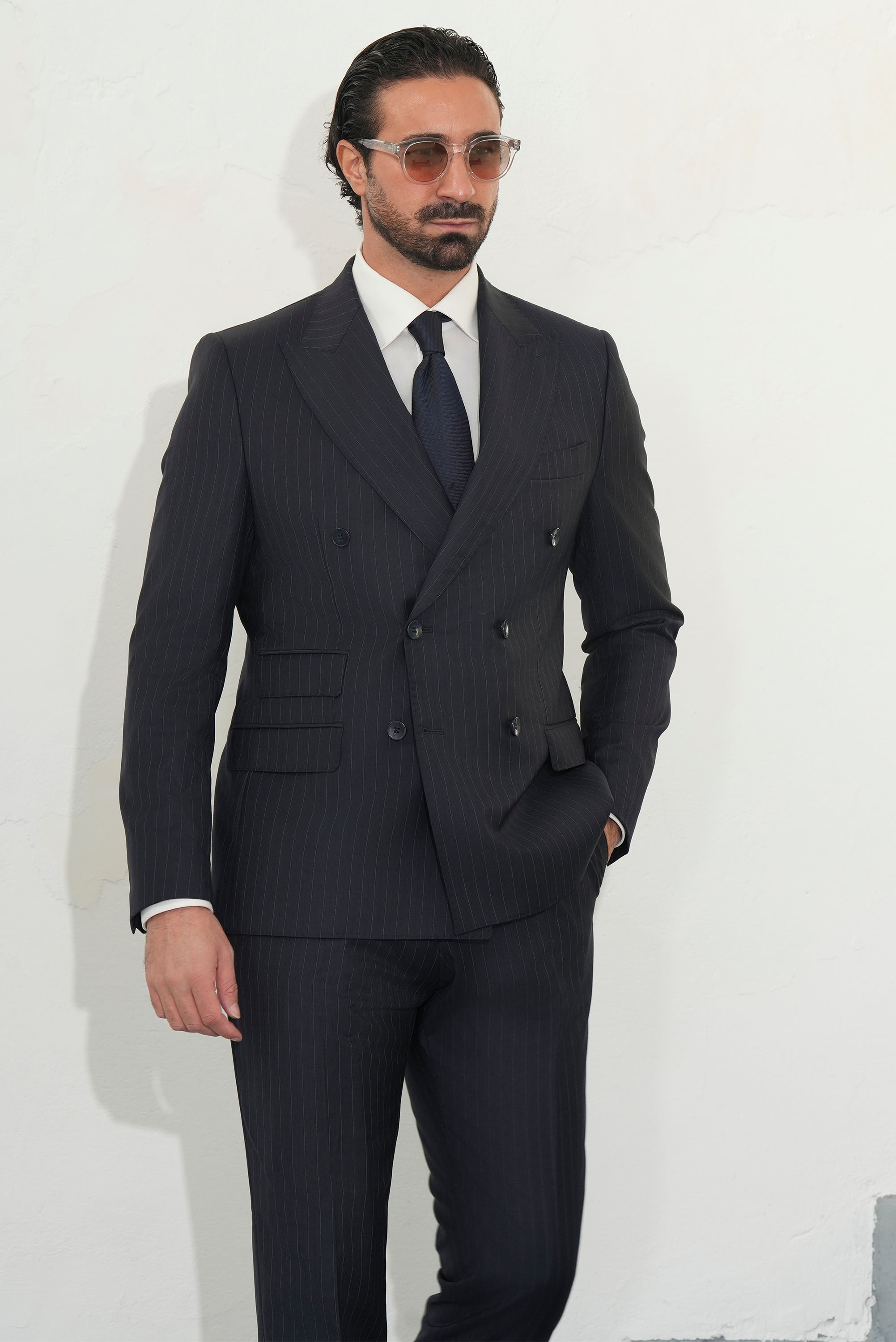 Dunkelblauer Nadelstreifen-Slim-Fit-Zweireiher aus wolle