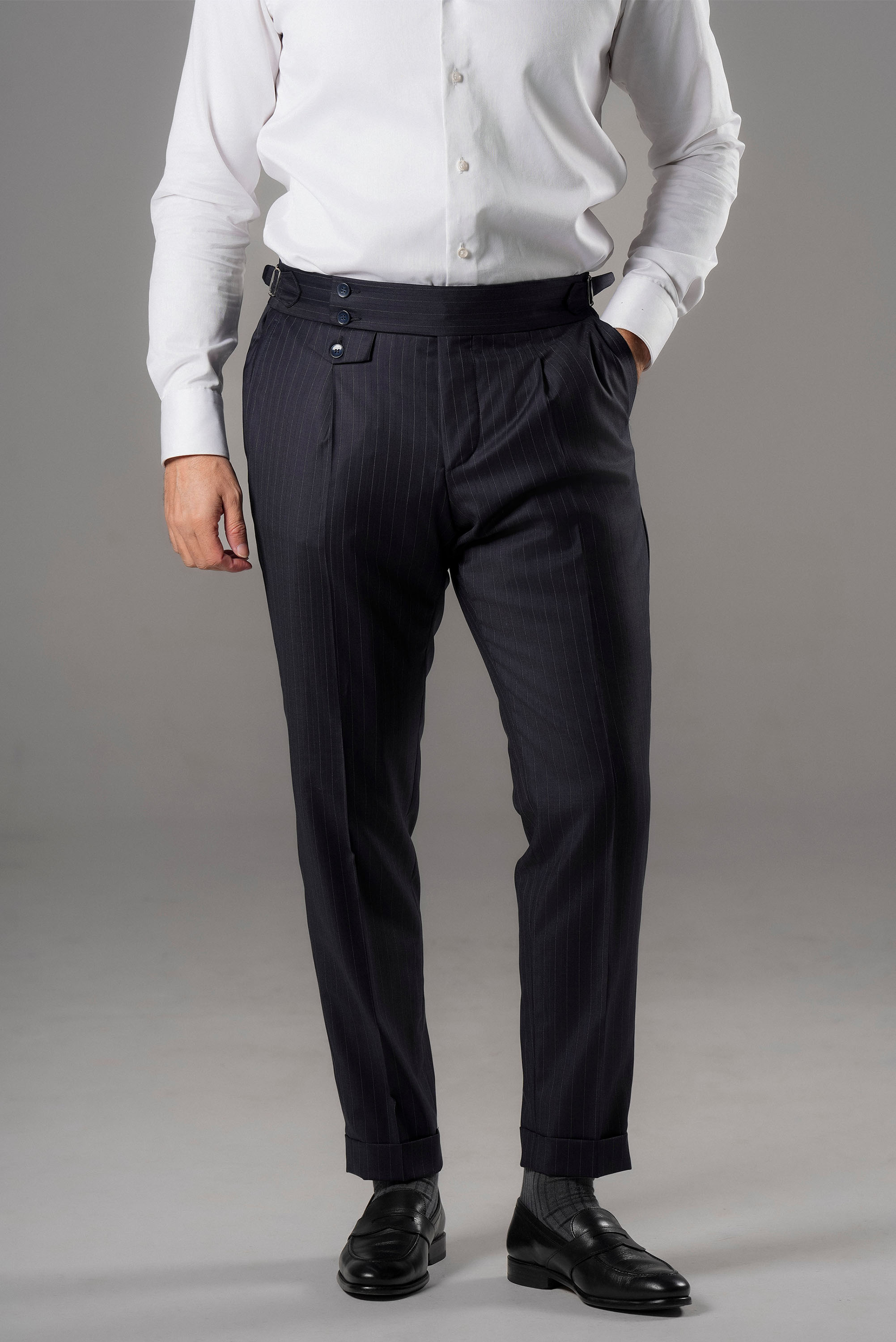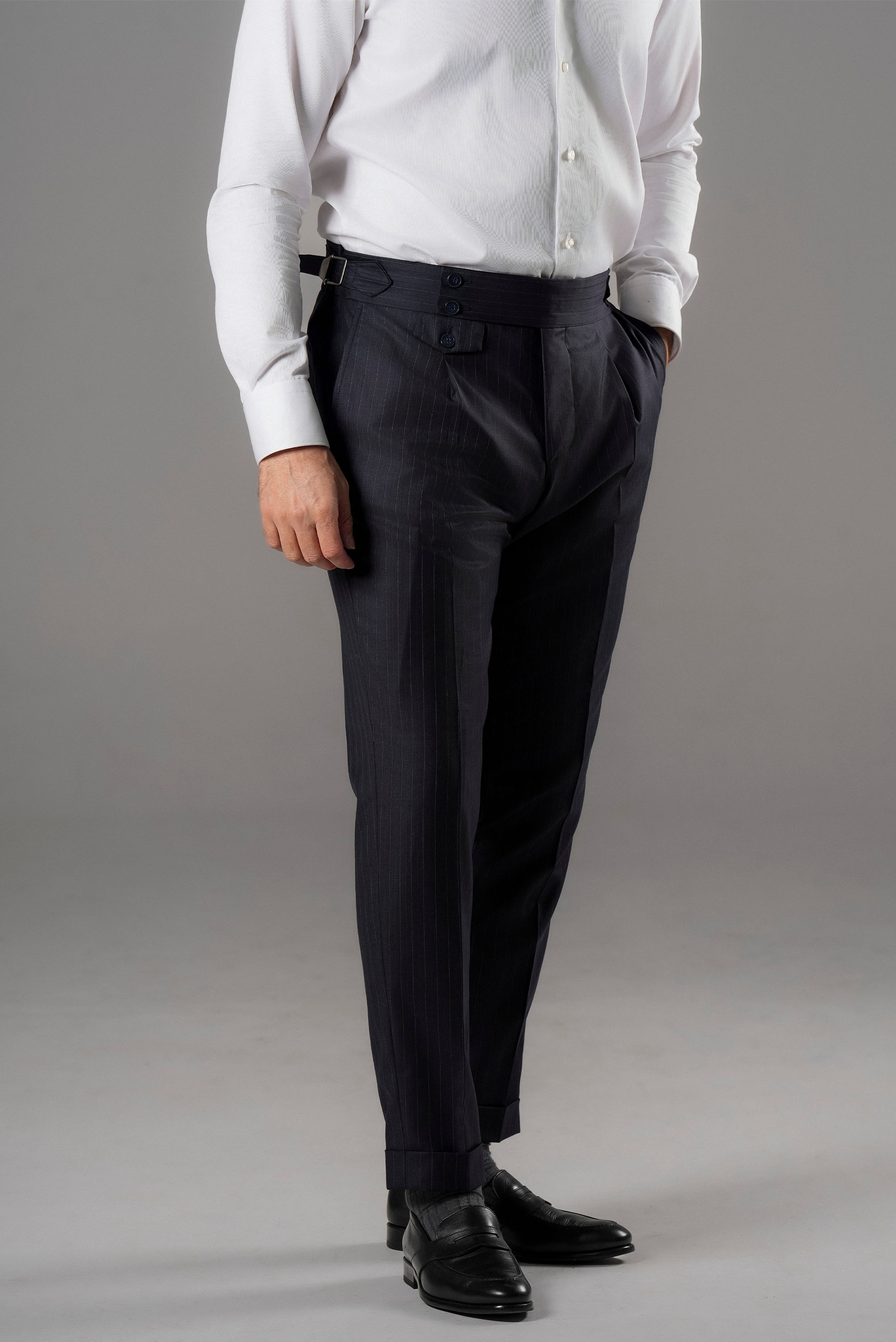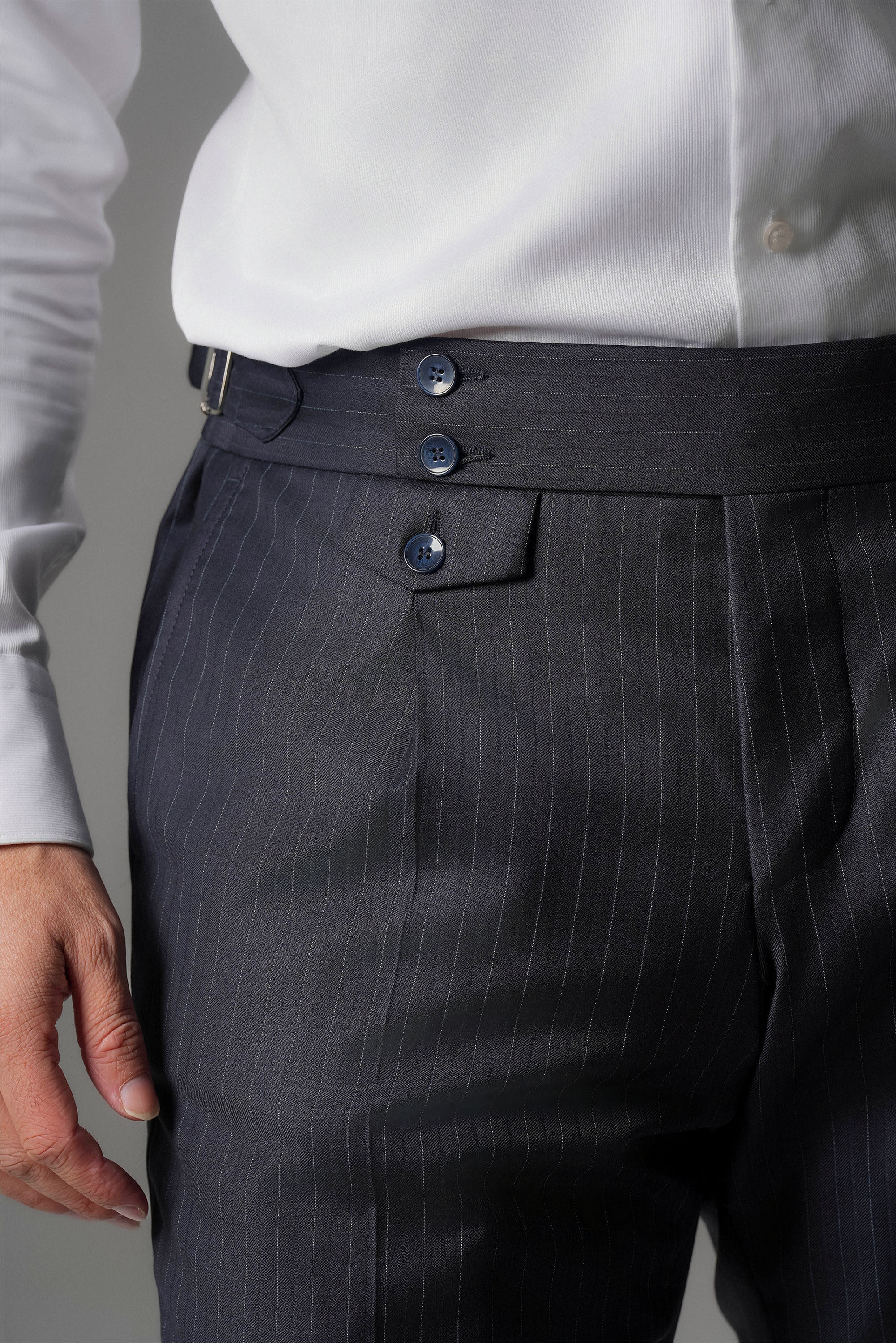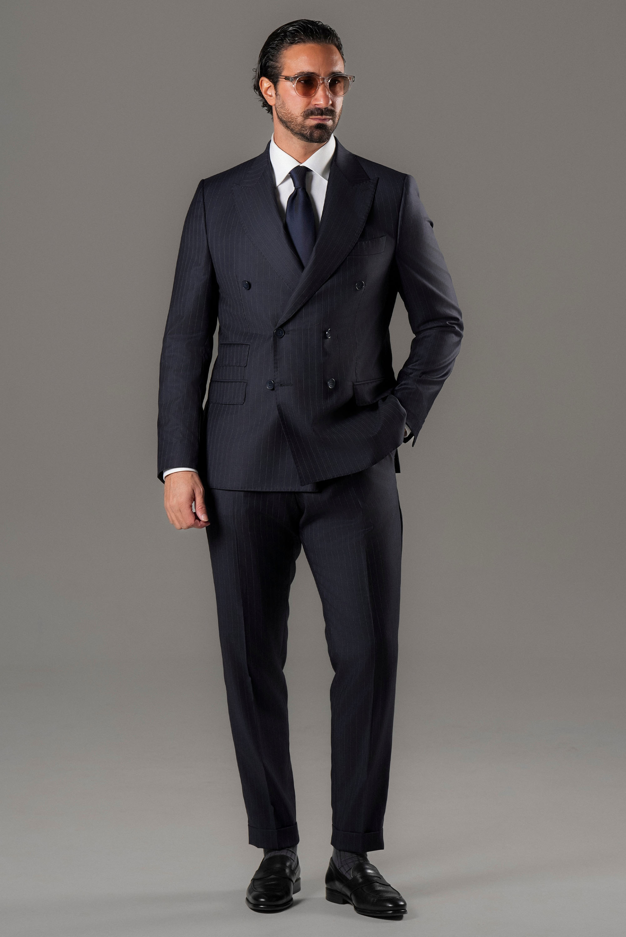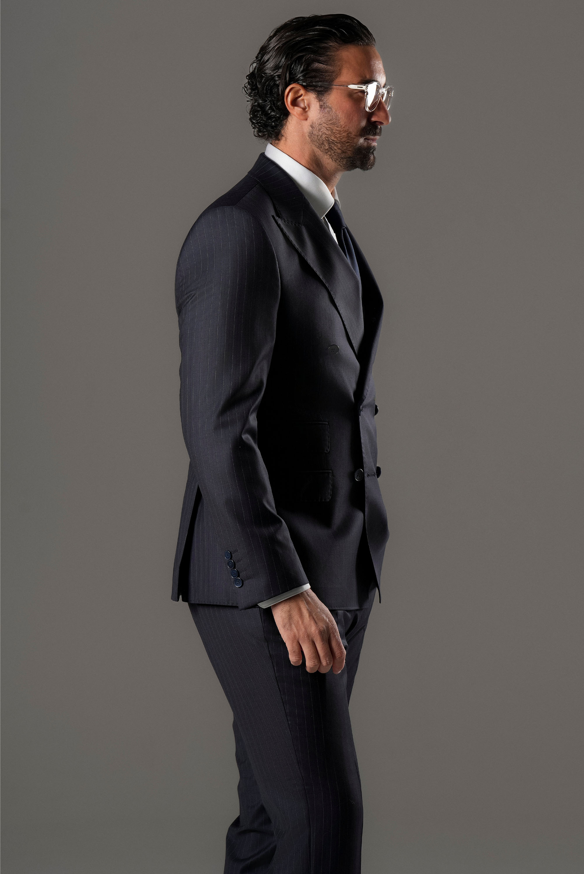 Dieser marineblaue Slim-Fit Zweireiher mit Nadelstreifen verkörpert klassische italienische Eleganz mit einer klaren, modernen Haltung. Gefertigt aus 100 % Super-150s-Wolle von Vitale Barberis Canonico, überzeugt er durch eine besonders feine Haptik, einen fliessenden Fall und eine verfeinerte Struktur. Das dezente Nadelstreifenmuster verleiht Tiefe und formelle Präsenz und betont die architektonischen Linien des Anzugs. Das steigende Revers unterstreicht die selbstbewusste Silhouette, während die Half-Canvas-Konstruktion und das vollständige Viskosefutter dauerhafte Formstabilität, hohen Tragekomfort und ein gepflegtes Finish gewährleisten. In Italien gefertigt, eignet sich dieser Anzug ideal für Business, formelle Anlässe und gehobene berufliche Umfelder.