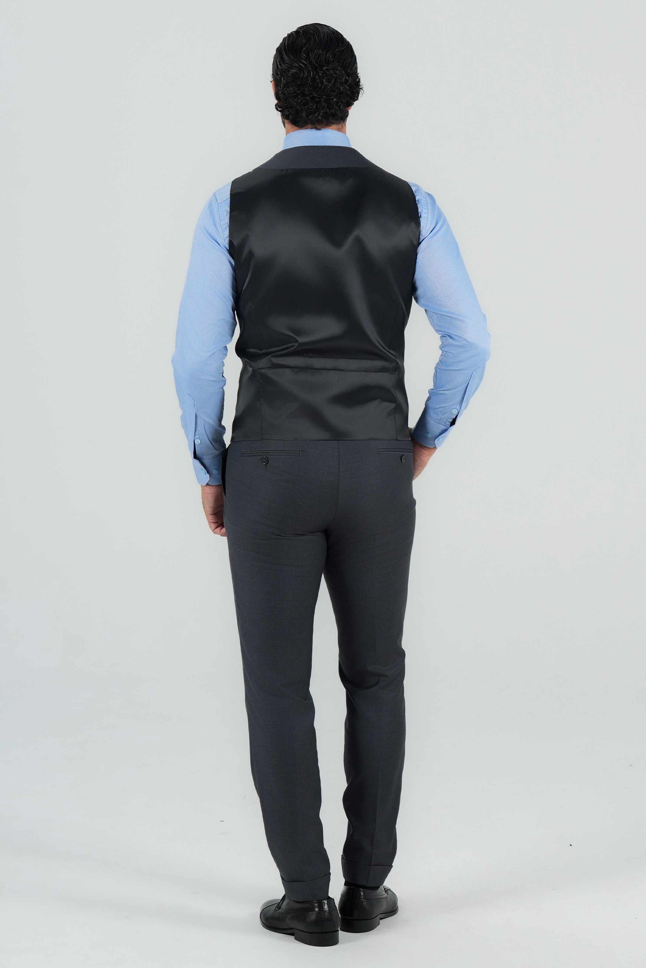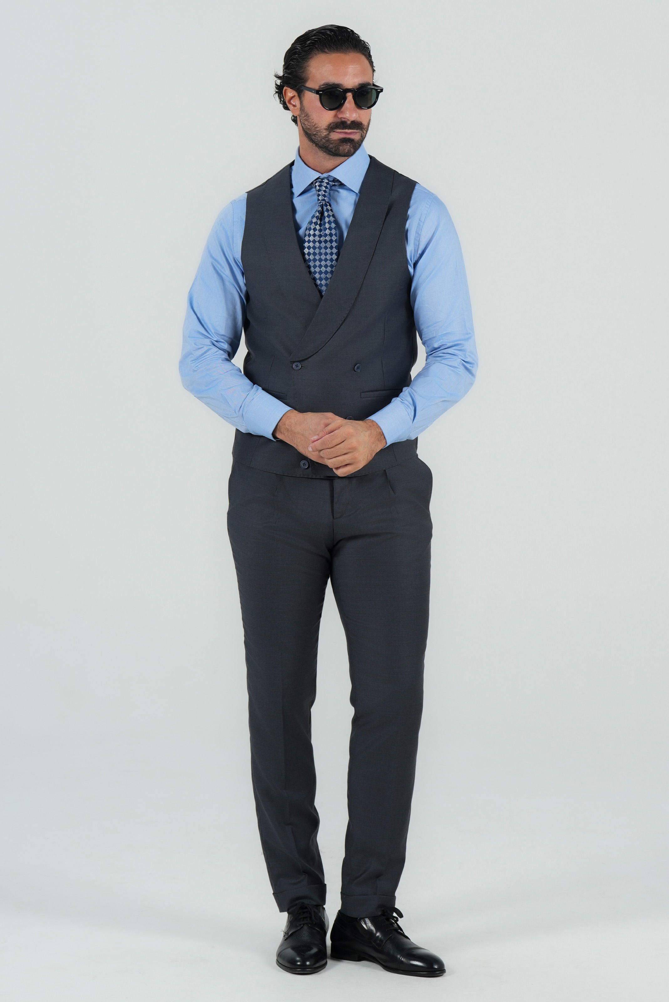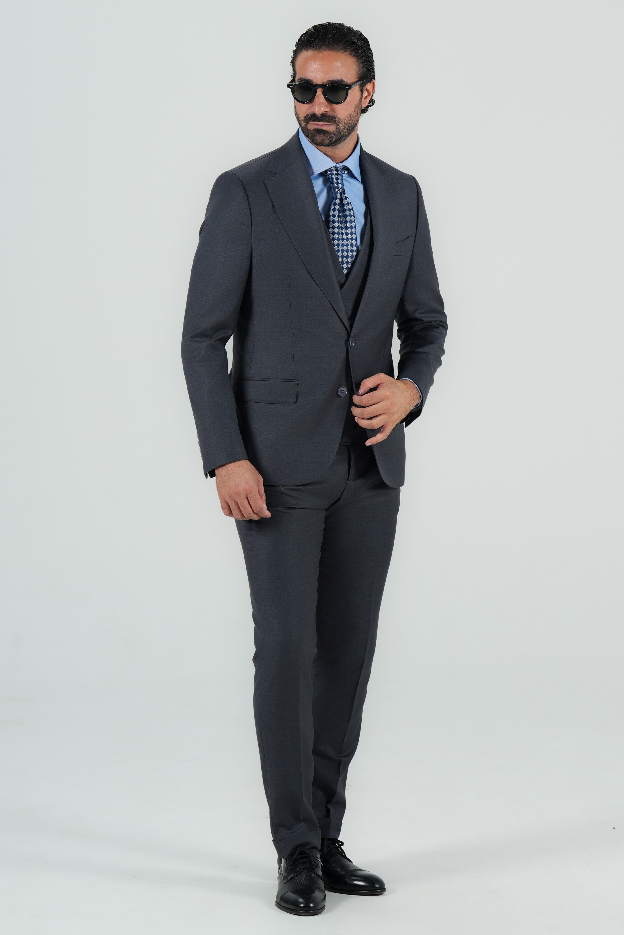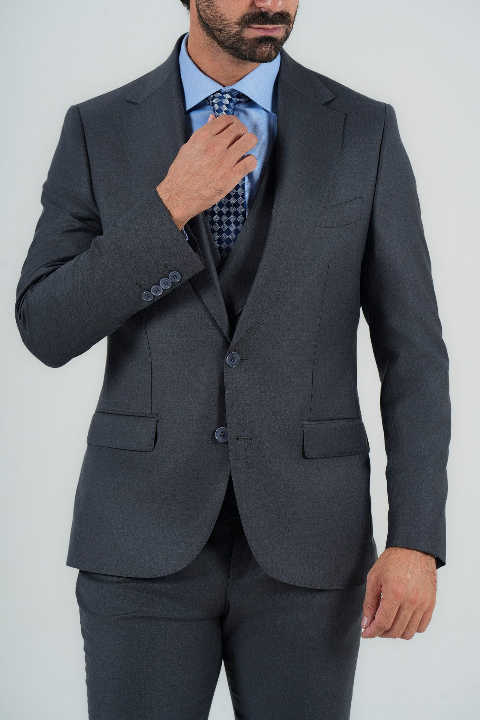 Dieser graue Slim-Fit-Dreiteiler kombiniert praezise Schneiderei mit einem modernen, klaren Look. Hergestellt aus 100% Marina Wolle Super 150s – Vitale Barberis Canonico, bietet er aussergewoehnliche Weichheit, Atmungsaktivitaet und einen eleganten Fall. Die Half-Canvas-Konstruktion sorgt fuer Struktur und Komfort, waehrend das Viskosefutter ein glattes, hochwertiges Tragegefuehl vermittelt. Entworfen und gefertigt in Italien, ist er eine zeitlose Wahl fuer Geschaeftsanlaesse und formelle Events.