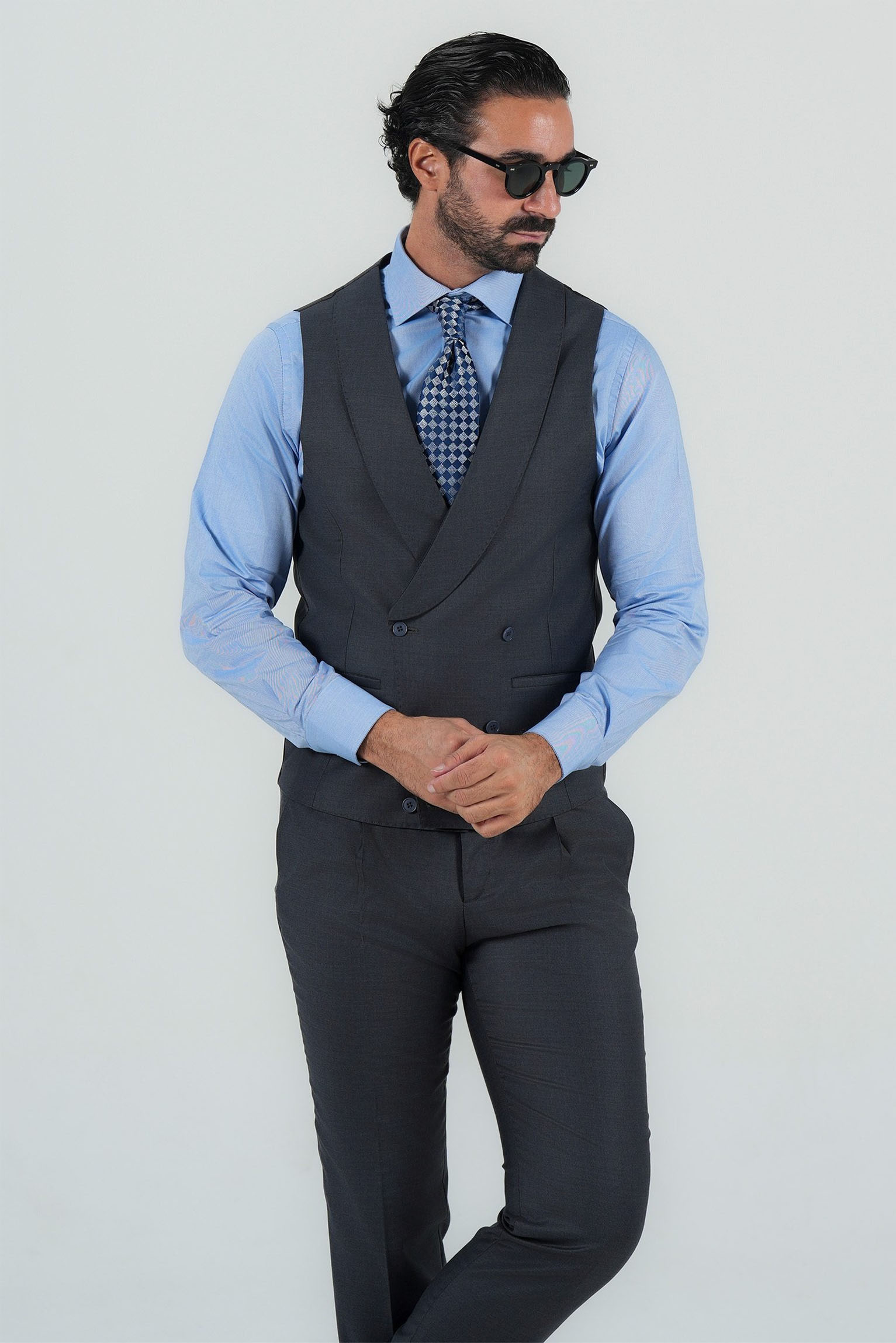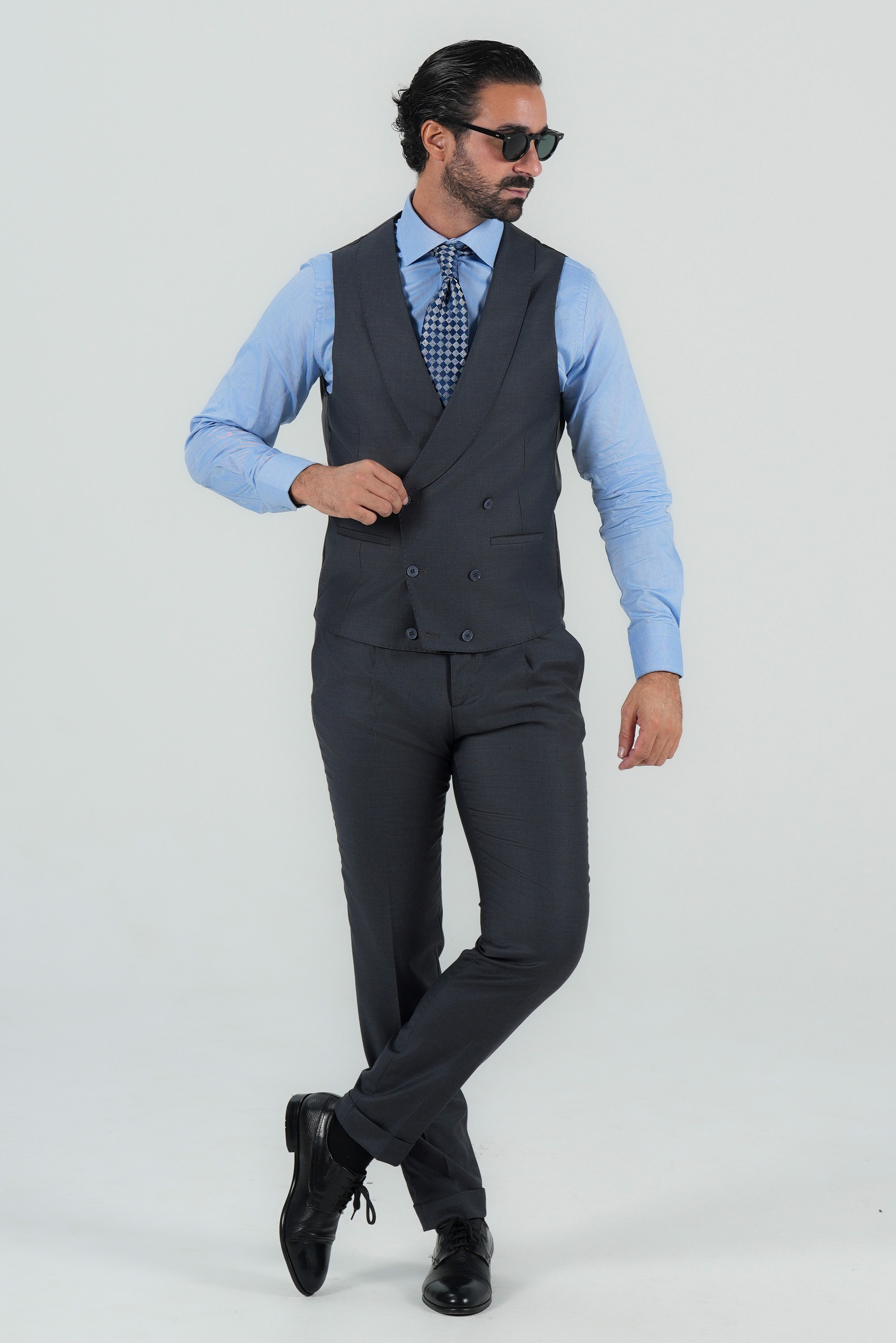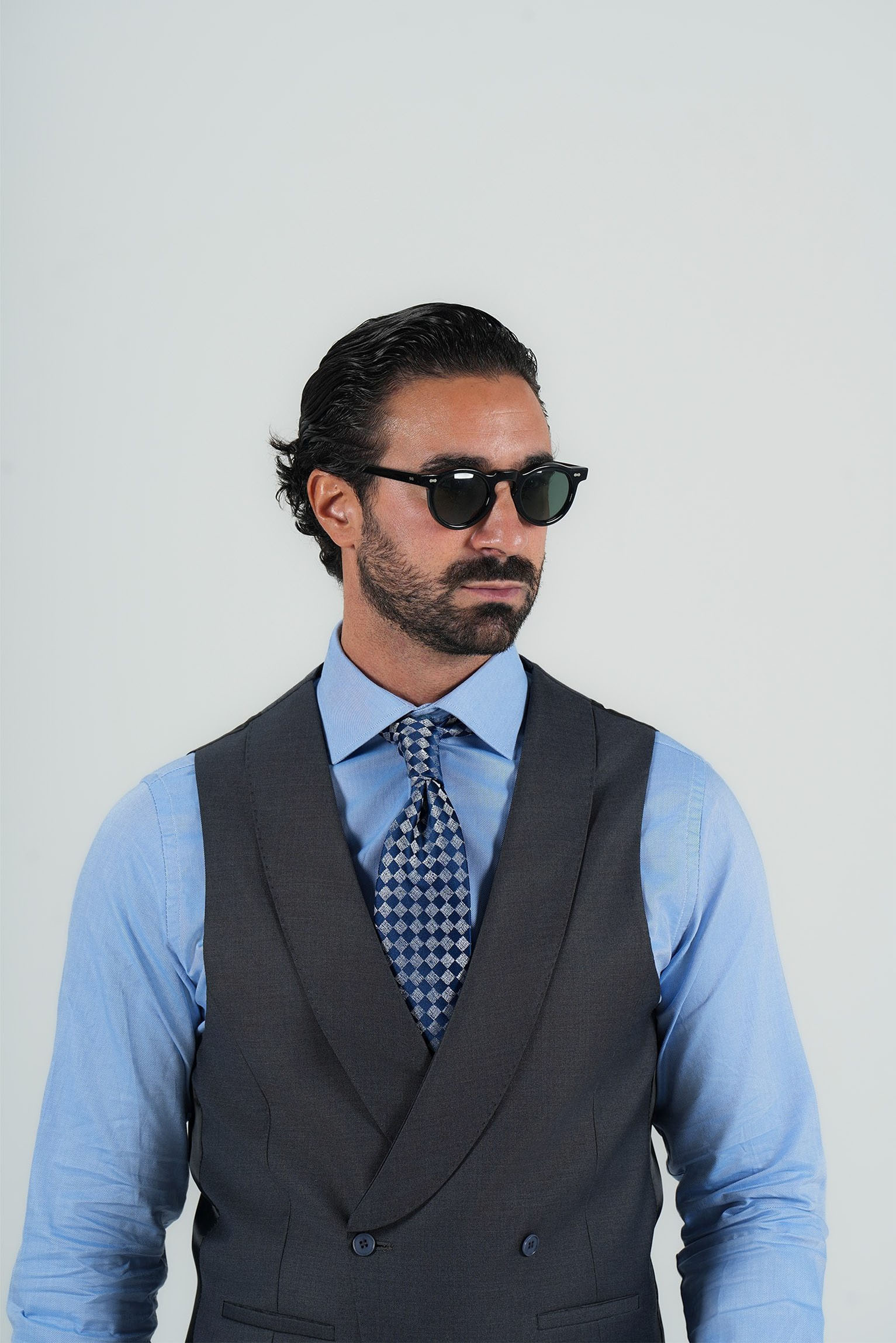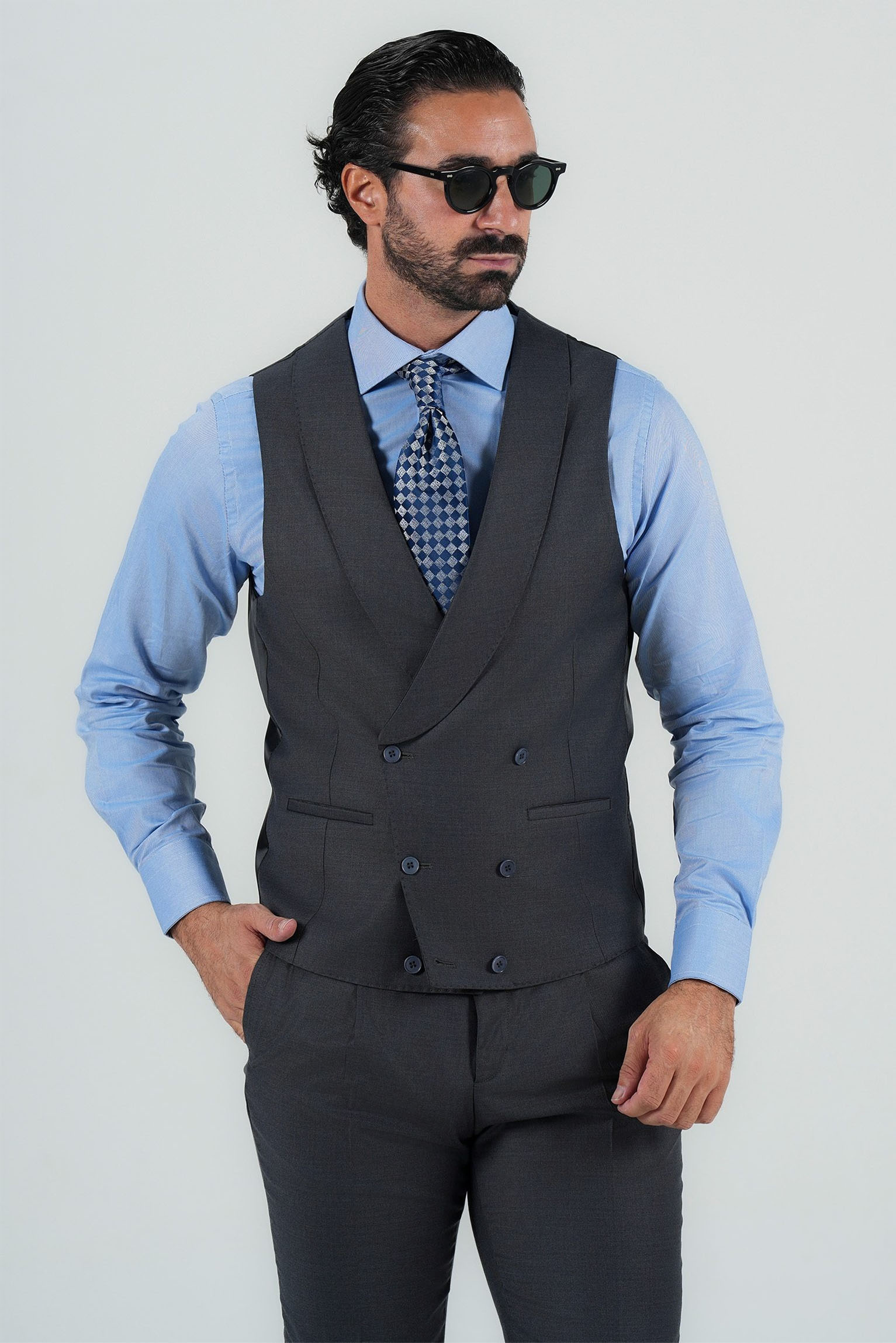 Dieser graue Slim-Fit-Dreiteiler kombiniert praezise Schneiderei mit einem modernen, klaren Look. Hergestellt aus 100% Marina Wolle Super 150s – Vitale Barberis Canonico, bietet er aussergewoehnliche Weichheit, Atmungsaktivitaet und einen eleganten Fall. Die Half-Canvas-Konstruktion sorgt fuer Struktur und Komfort, waehrend das Viskosefutter ein glattes, hochwertiges Tragegefuehl vermittelt. Entworfen und gefertigt in Italien, ist er eine zeitlose Wahl fuer Geschaeftsanlaesse und formelle Events.