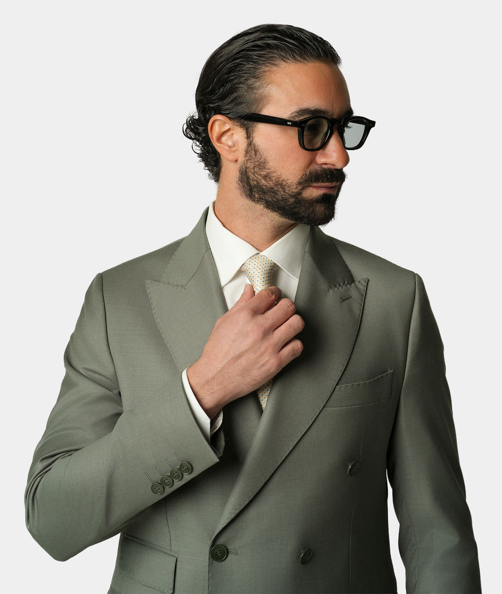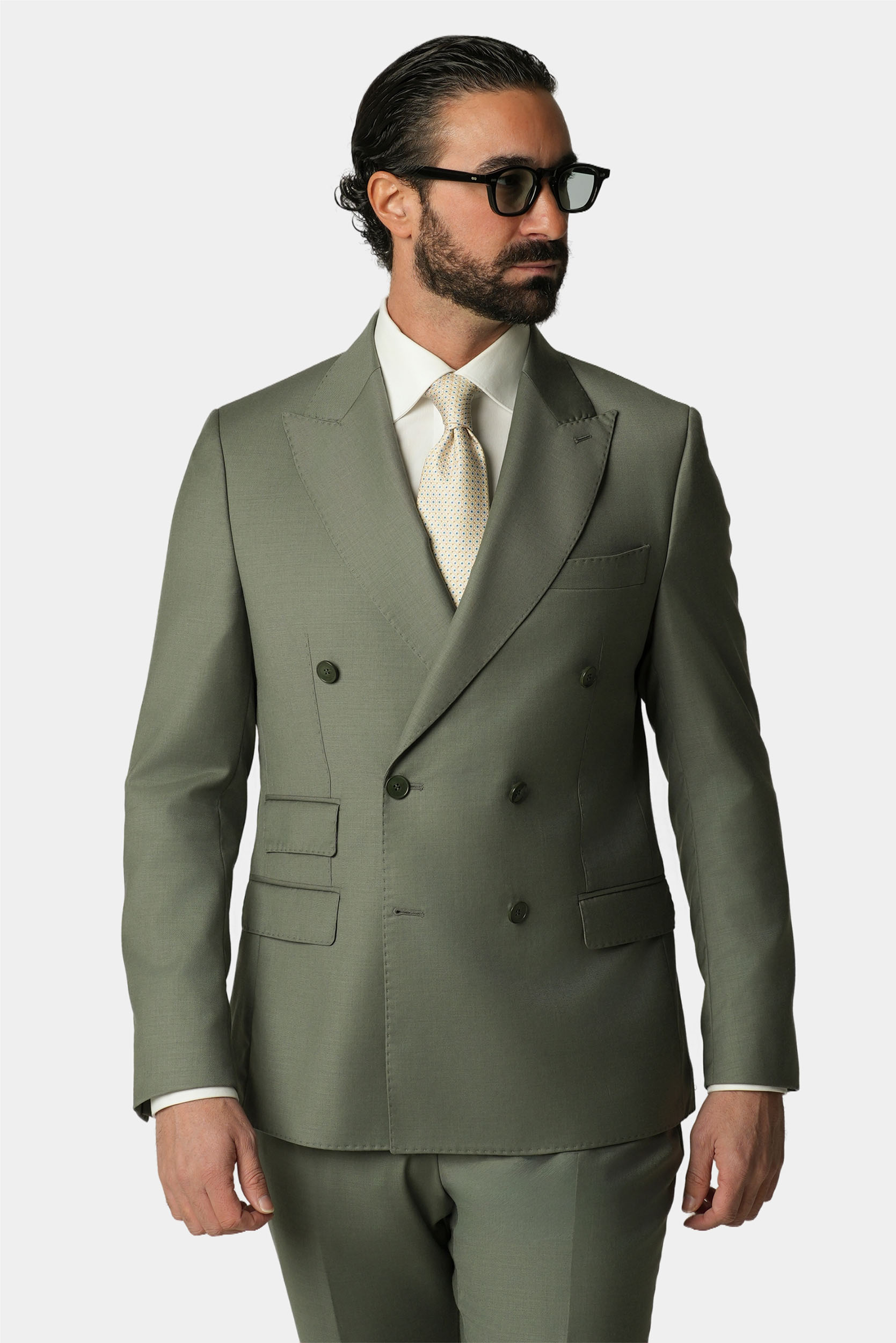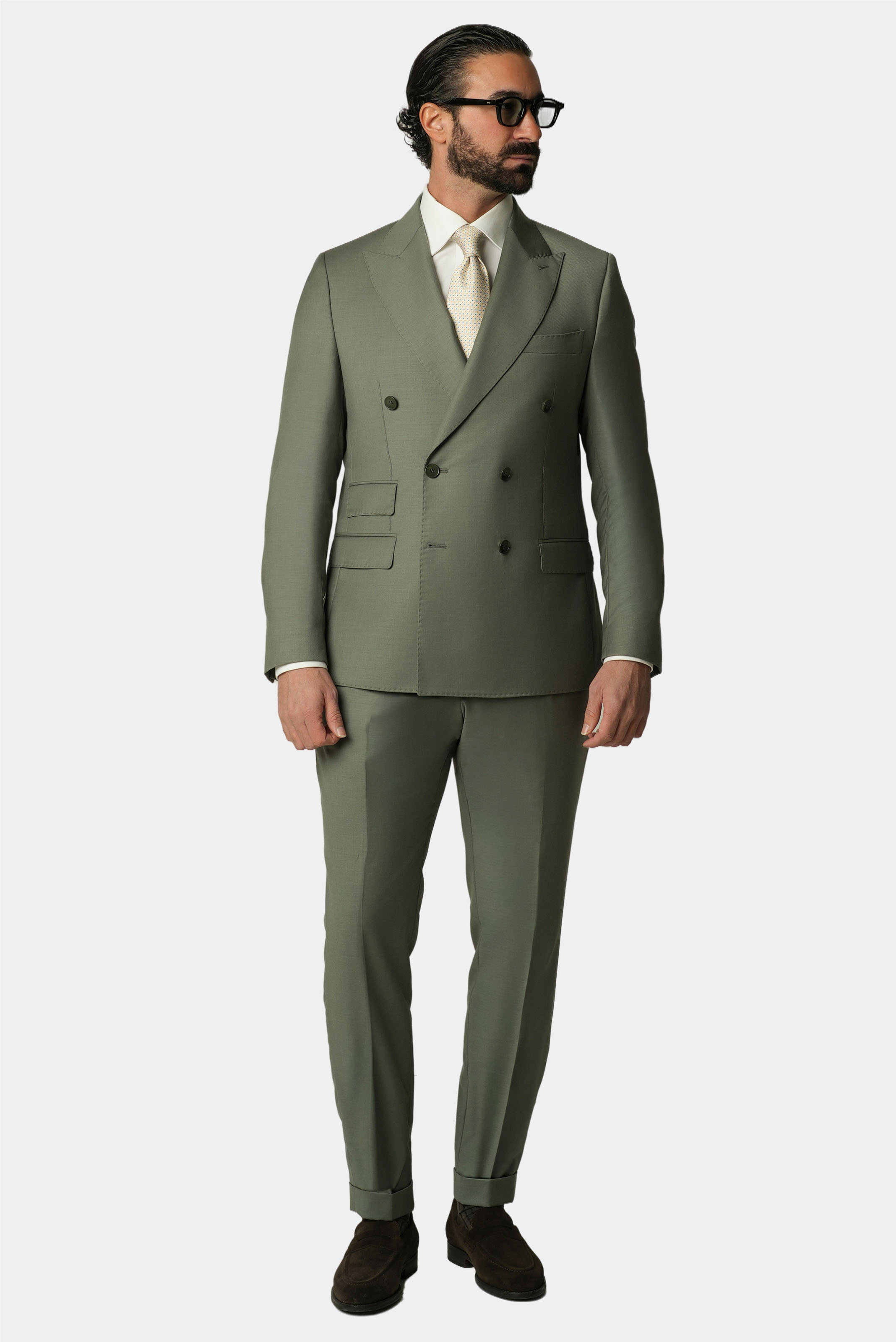Dieser hellgrüne doppelreihige Slim-Fit-Anzug interpretiert die klassische italienische Schneiderkunst auf moderne und elegante Weise. Gefertigt aus 100 Prozent Super-130s-Wolle von Vitale Barberis Canonico bietet er aussergewöhnliche Leichtigkeit hohe Atmungsaktivität und einen natürlichen edlen Fall. Das steigende Spitzrevers und die Half-Canvas-Konstruktion sorgen für eine ausgewogene Verbindung aus Struktur Komfort und Tragbarkeit. Ideal geeignet für Business sommerliche Anlässe und formelle Auftritte.