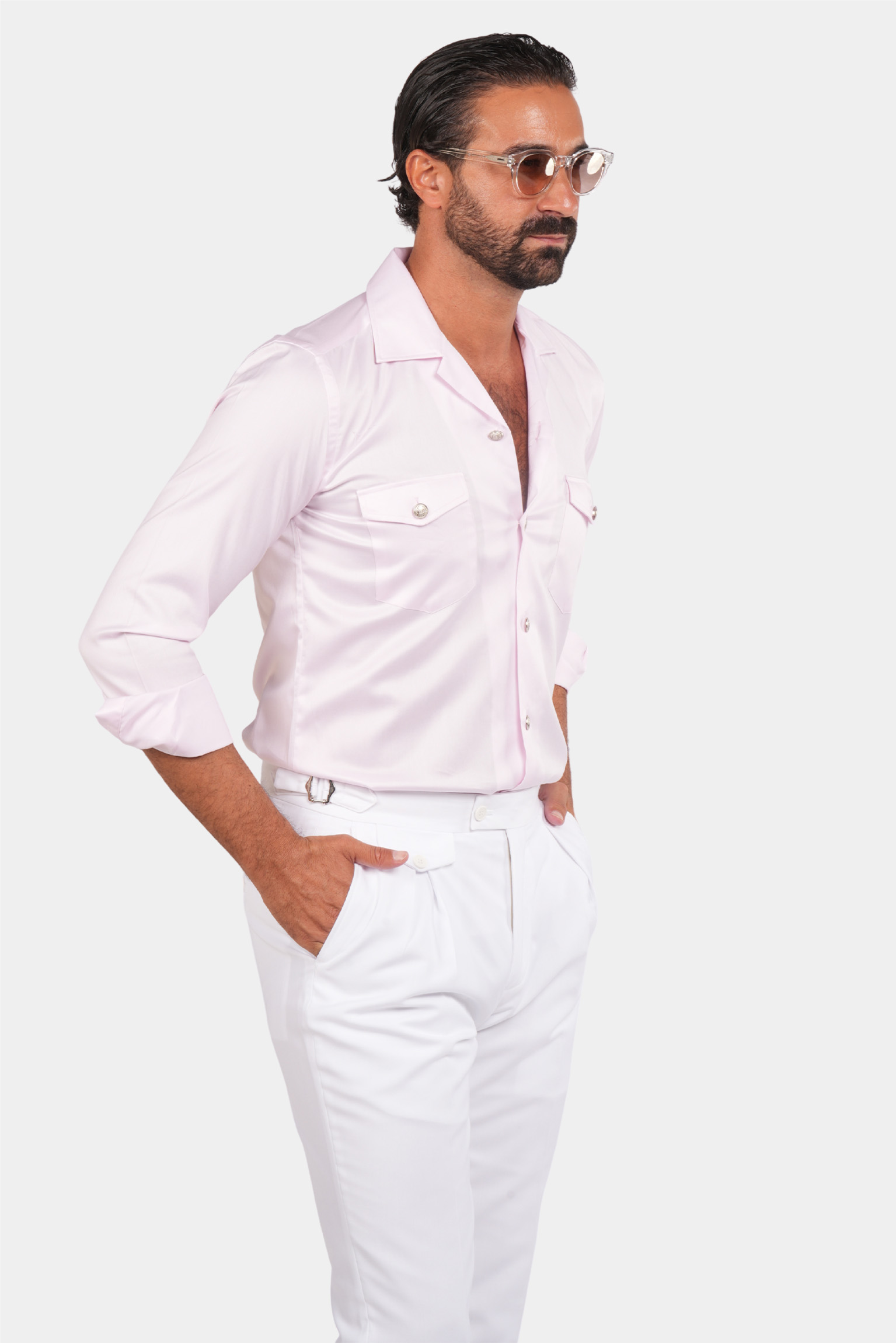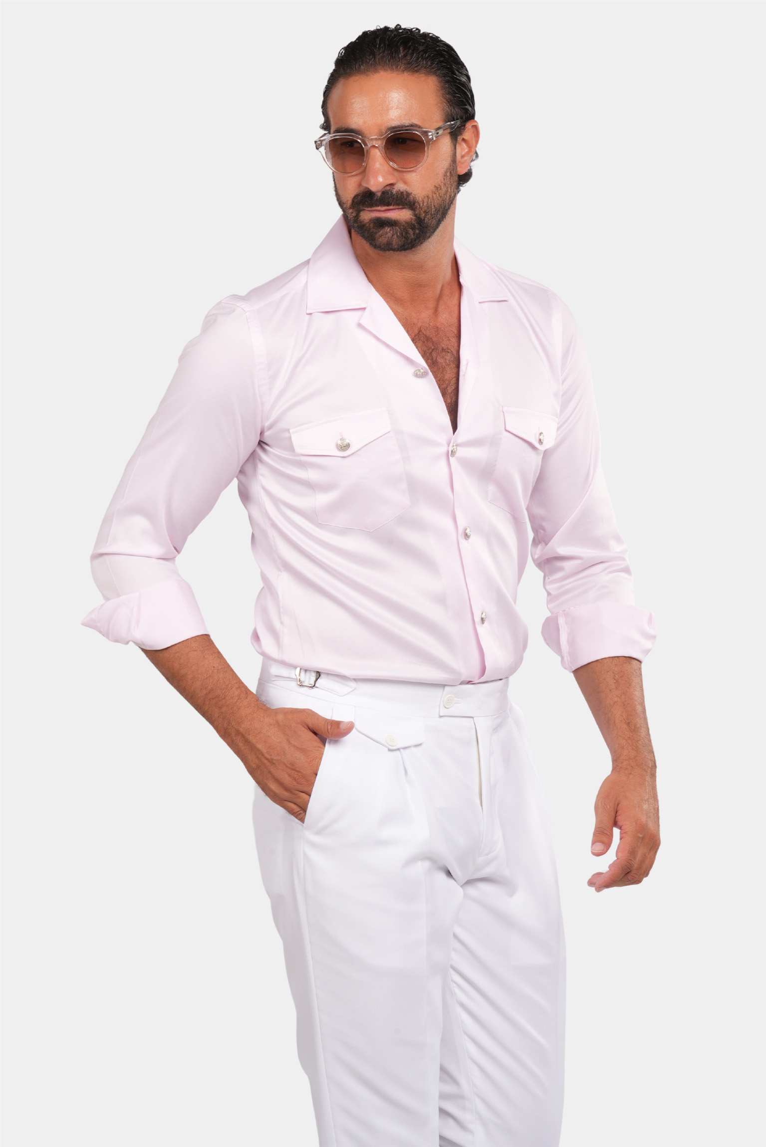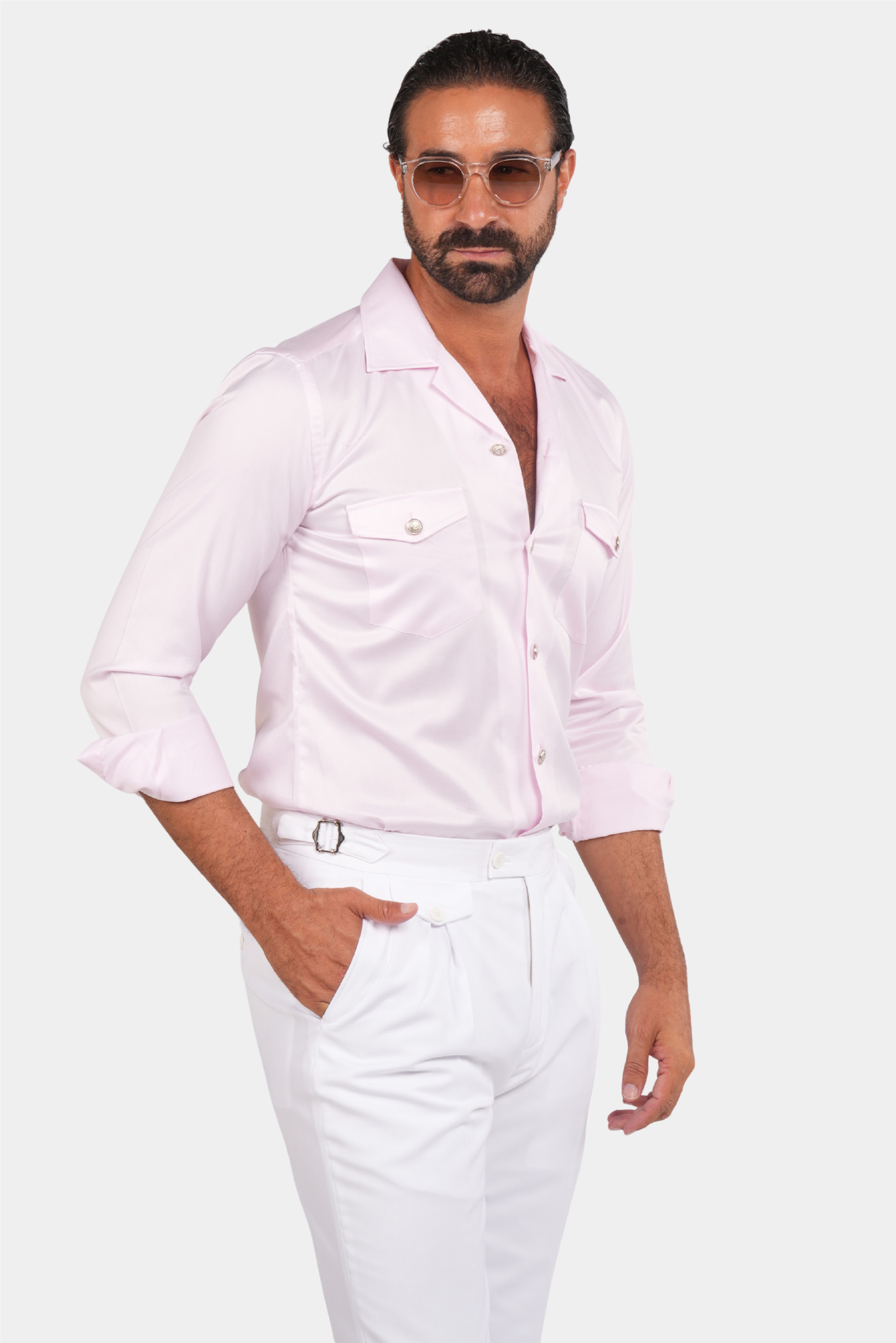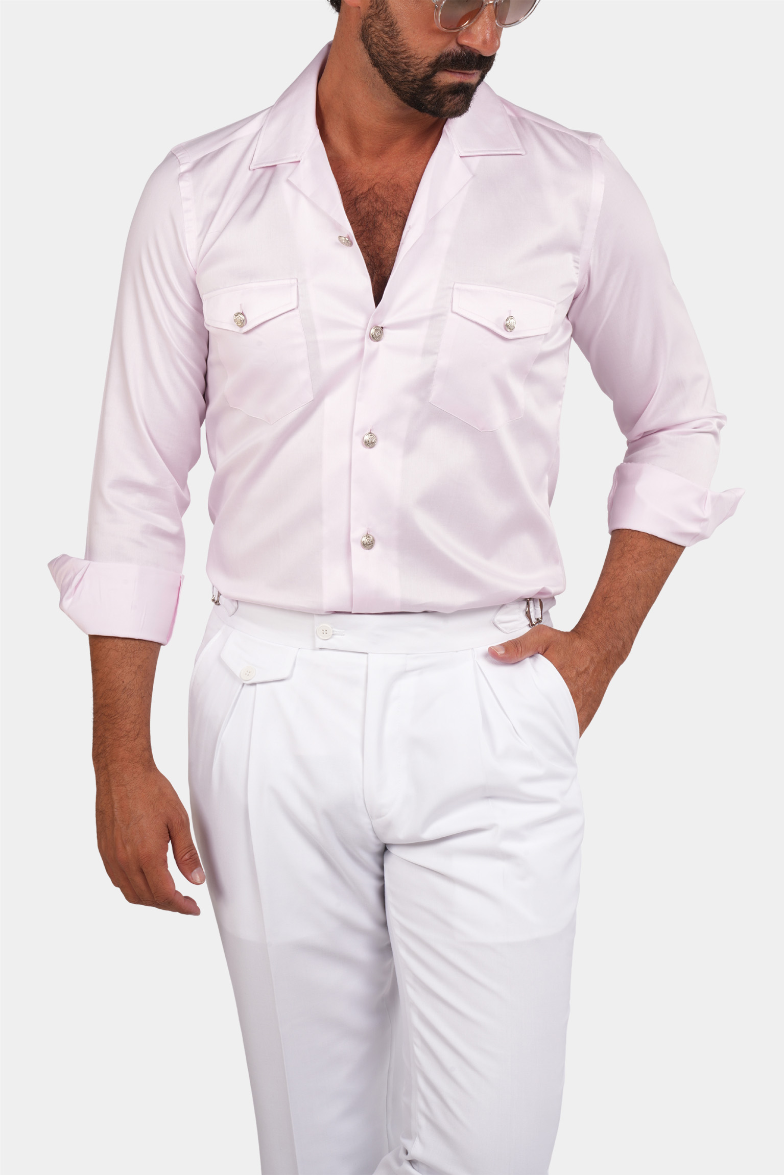 Dieses rosa Safari-Hemd für Herren vereint Eleganz und klassischen Stil. Das Kragen-Design und die silbernen Knöpfe verleihen diesem Kleidungsstück eine besondere Optik. Zwei geknöpfte Pattentaschen auf der Brust sind nicht nur schön, sondern auch funktional. Hochwertiger Stoff und professionelle Nähte machen dieses Hemd zu einer ausgezeichneten Wahl für formelle und semi-formelle Styles.