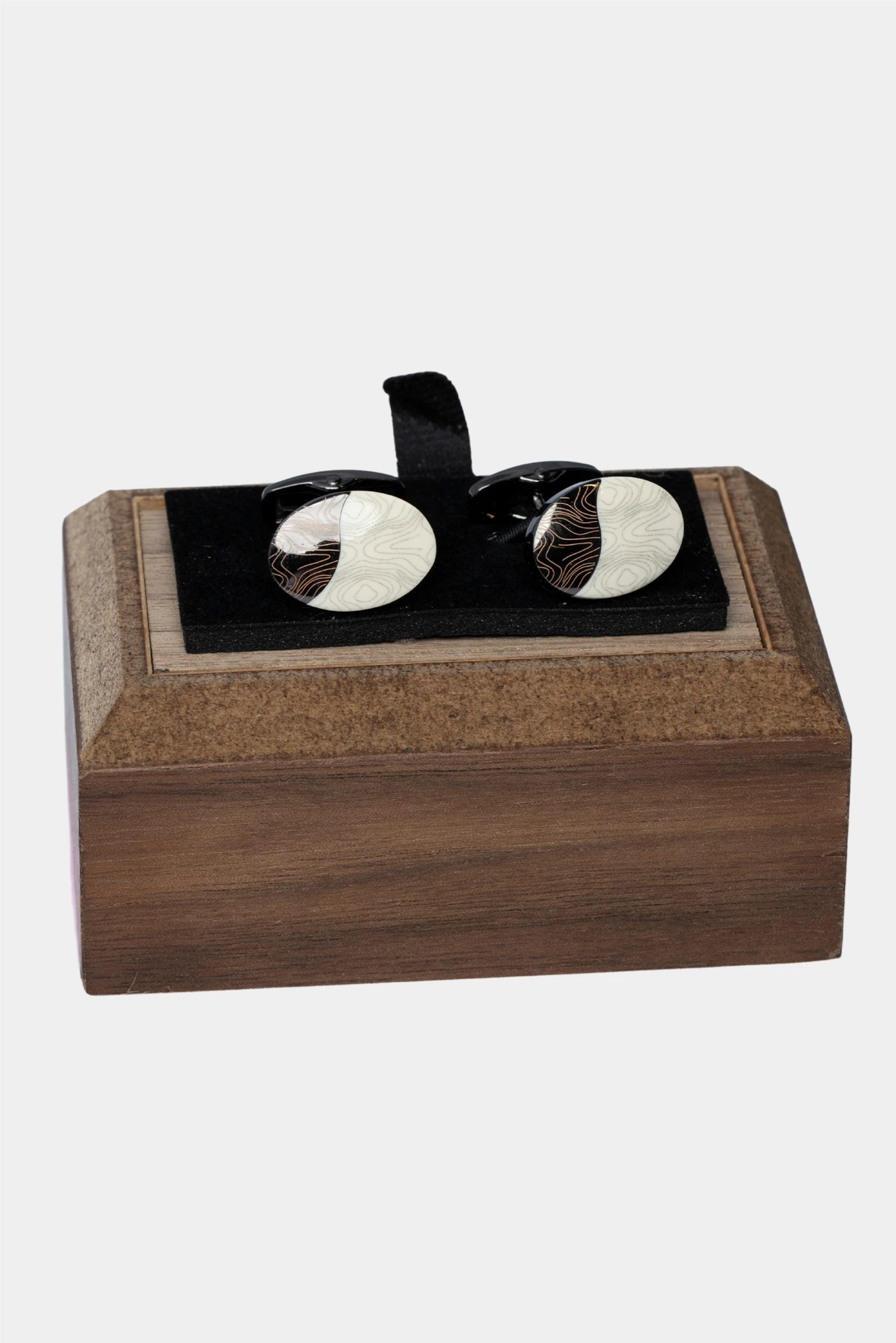 Diese Manschettenknoepfe besitzen ein elegantes ovales Design mit einer halb schwarzen und halb weissen Emailleoberflaeche, veredelt durch ein feines Holzmaserungs-Muster, das Tiefe und Raffinesse verleiht.