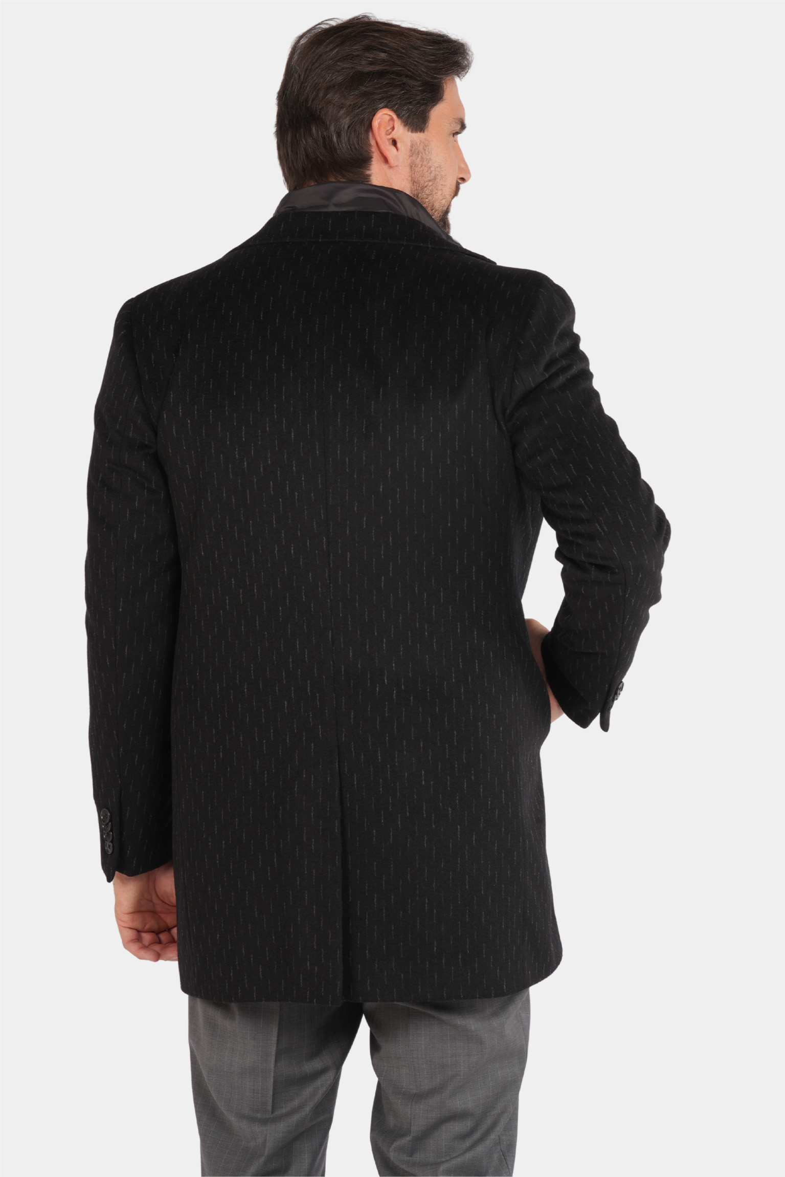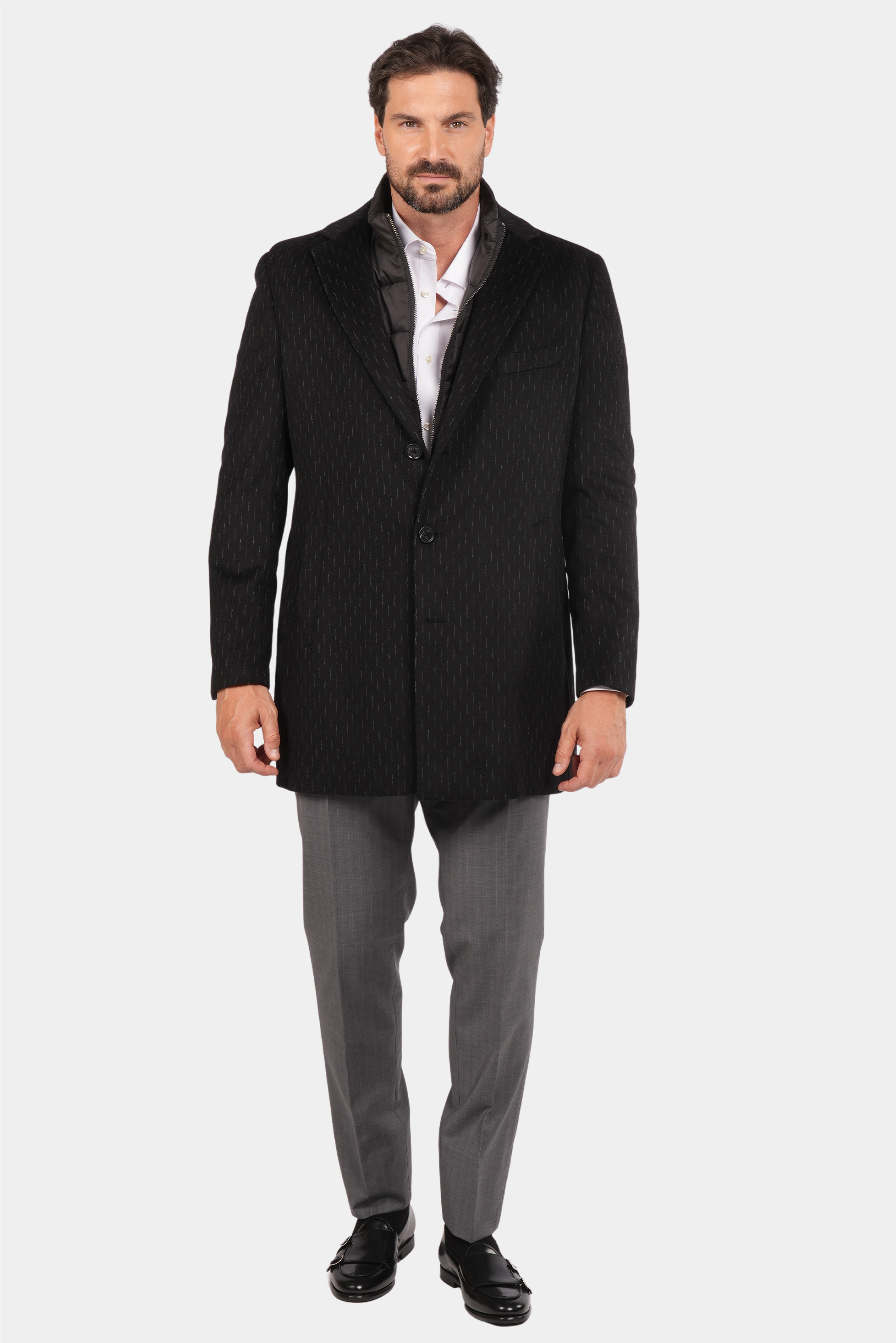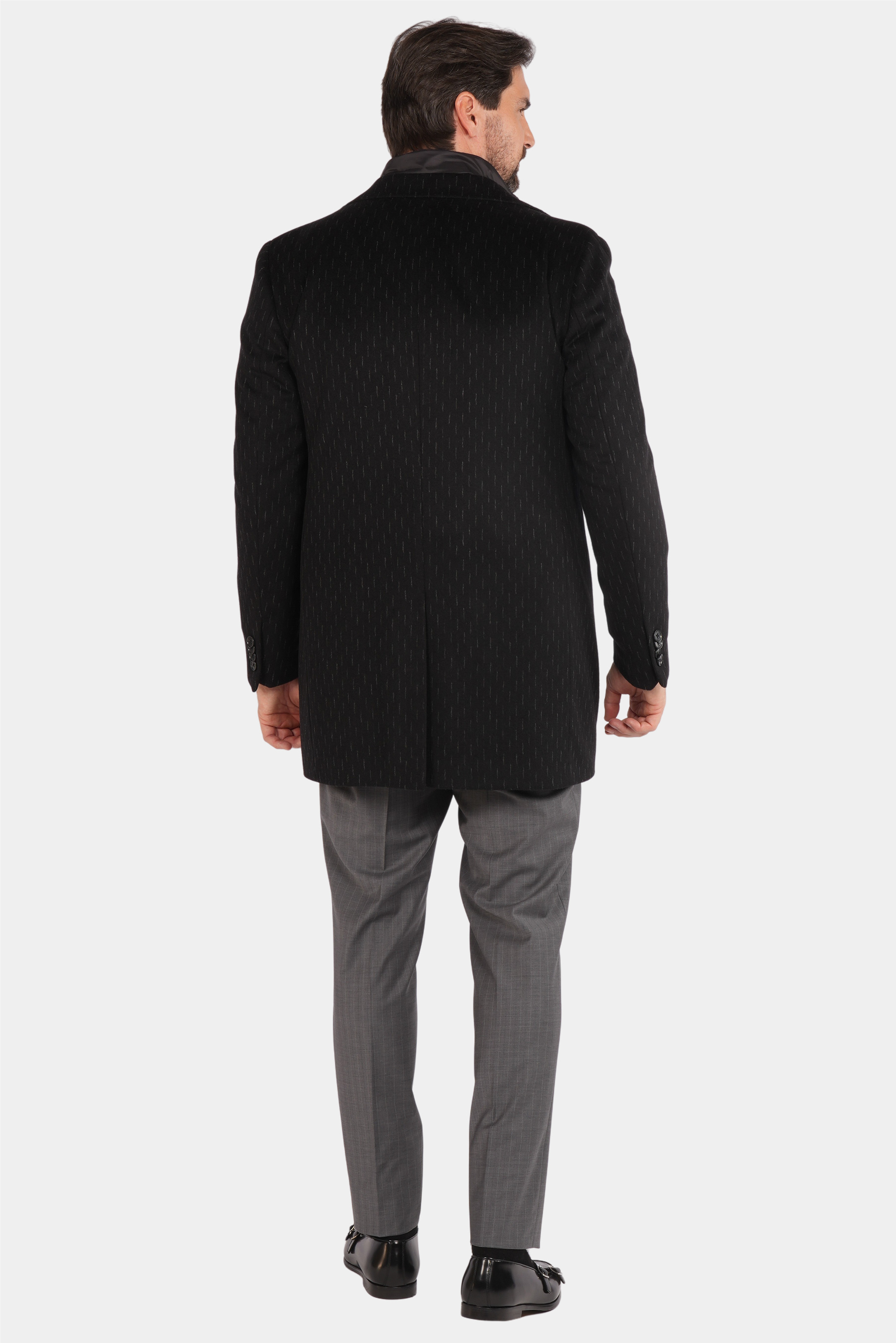 Dieser schwarze Mantel aus reiner Wolle vereint Wärme, Eleganz und Qualität für die kalten Tage des Jahres. Das stilvolle, präzise geschneiderte italienische Design überzeugt mit einer taillierten Passform, einer einreihigen Knopfleiste und einem dezenten Nadelstreifenmuster, das dem Mantel einen luxuriösen und unverwechselbaren Look verleiht. Ideal für formelle und halb-formelle Anlässe – dieser Mantel verbindet Tragekomfort mit Raffinesse und wird schnell zu einem unverzichtbaren Bestandteil Ihrer Wintergarderobe.