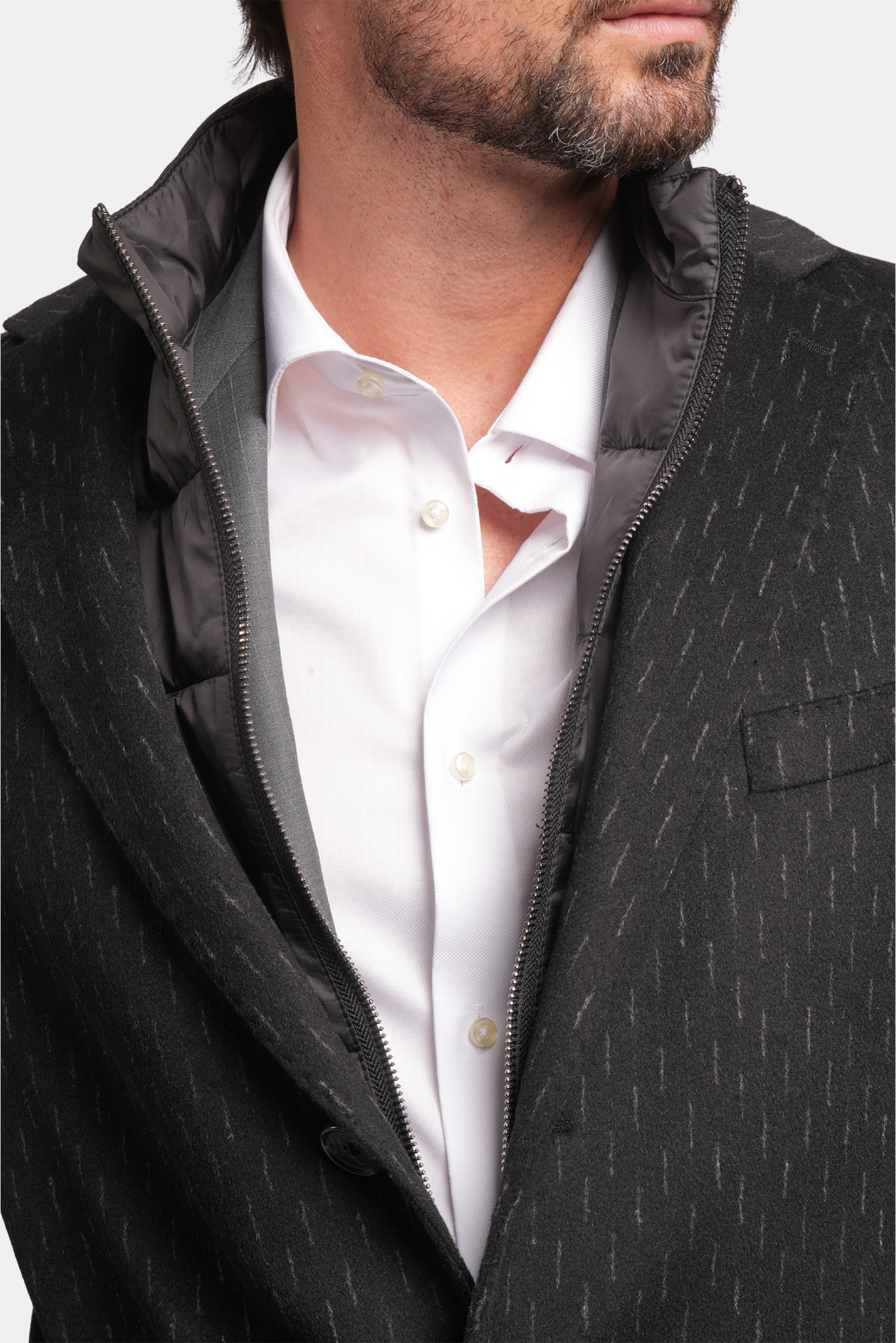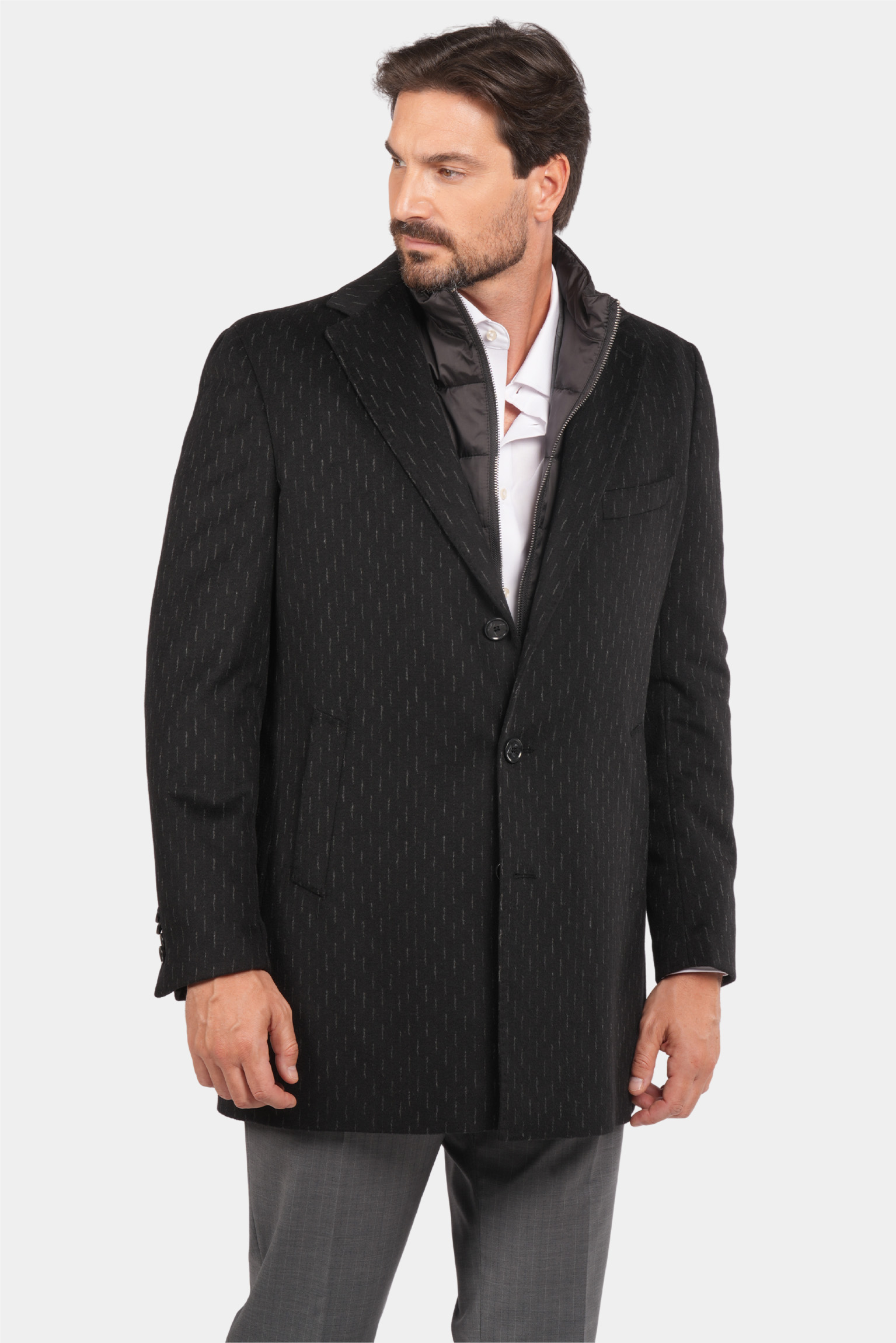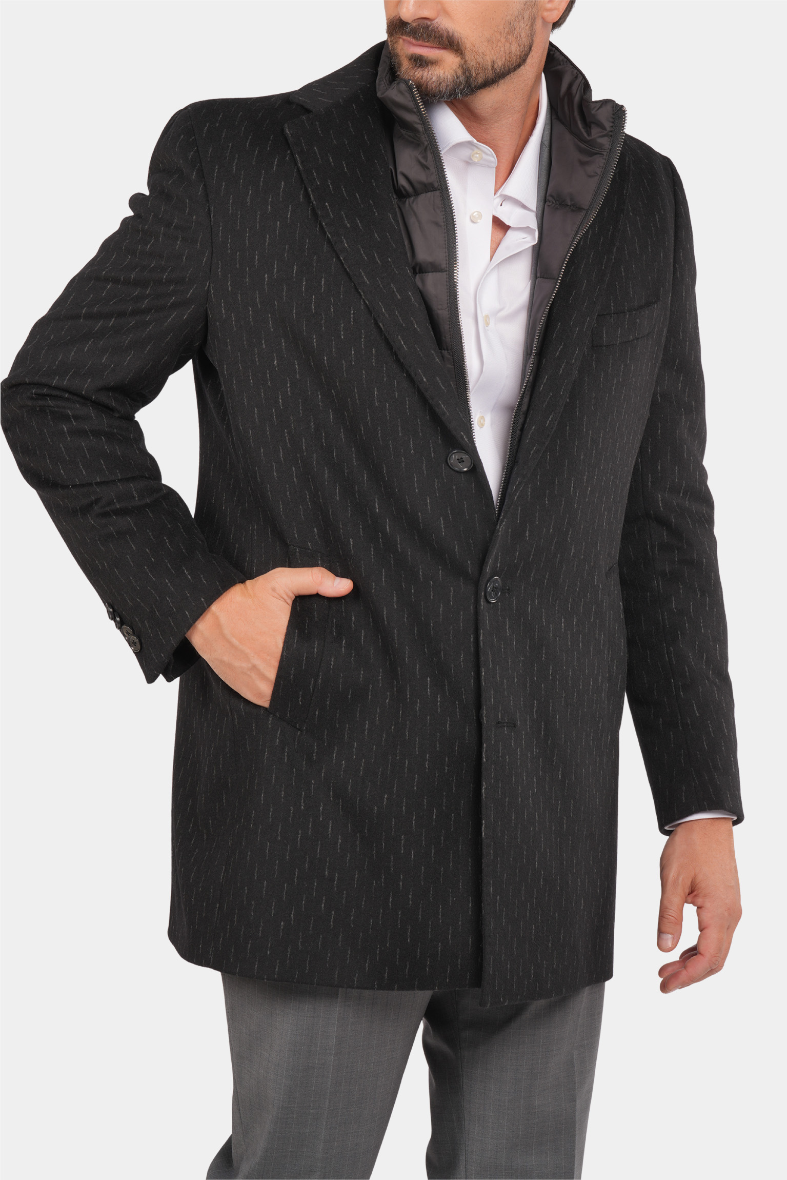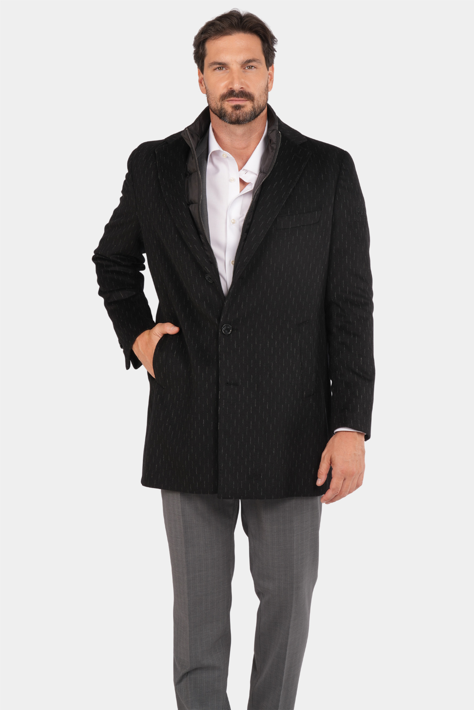Dieser schwarze Mantel aus reiner Wolle vereint Wärme, Eleganz und Qualität für die kalten Tage des Jahres. Das stilvolle, präzise geschneiderte italienische Design überzeugt mit einer taillierten Passform, einer einreihigen Knopfleiste und einem dezenten Nadelstreifenmuster, das dem Mantel einen luxuriösen und unverwechselbaren Look verleiht. Ideal für formelle und halb-formelle Anlässe – dieser Mantel verbindet Tragekomfort mit Raffinesse und wird schnell zu einem unverzichtbaren Bestandteil Ihrer Wintergarderobe.