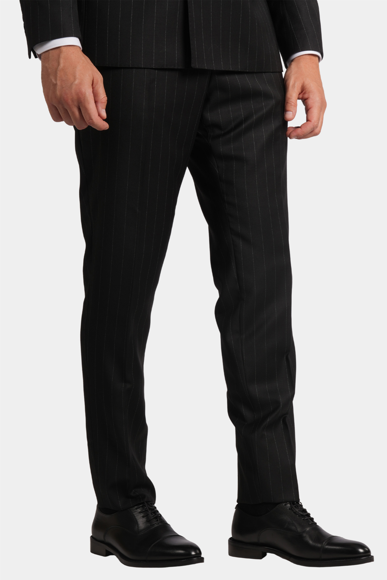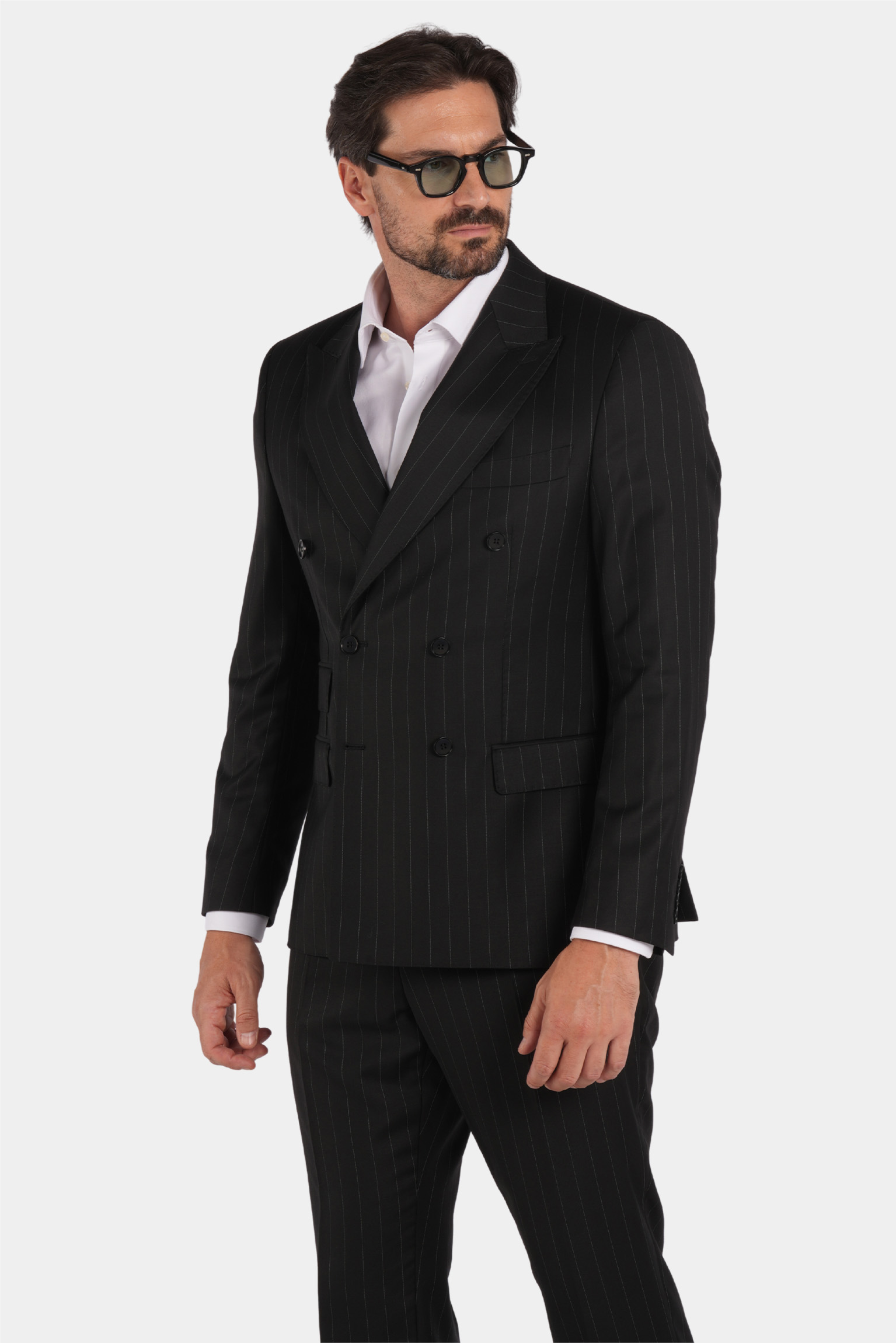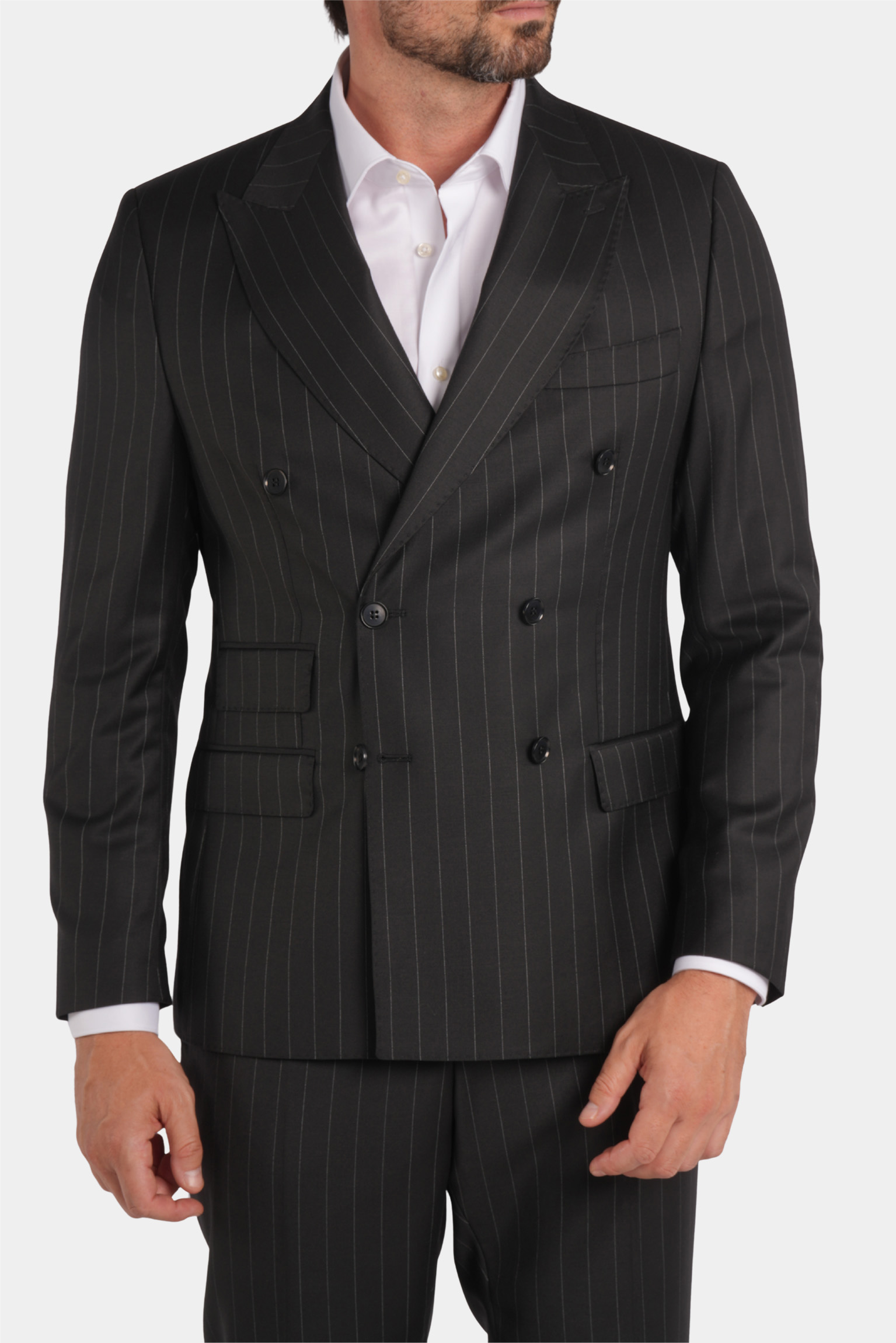 Dieser schwarze Slim-Fit-Zweireiher mit feinem Nadelstreifen vereint klassische Eleganz mit moderner Raffinesse. Gefertigt in Italien aus 100 % Super 120s-Wolle von Vitale Barberis Canonico, beeindruckt er durch sein präzises Nadelstreifenmuster und exzellente Verarbeitung. Die Halb-Canvas-Konstruktion sorgt für einen natürlichen Fall und dauerhafte Form, während das Viskosefutter höchsten Tragekomfort und ein glattes Innenfinish garantiert.