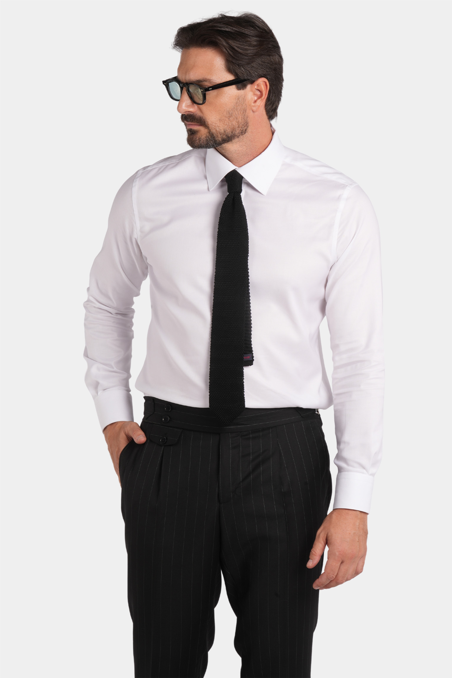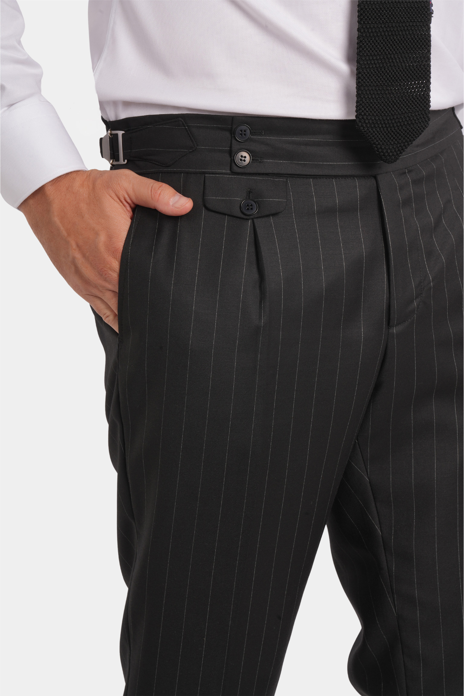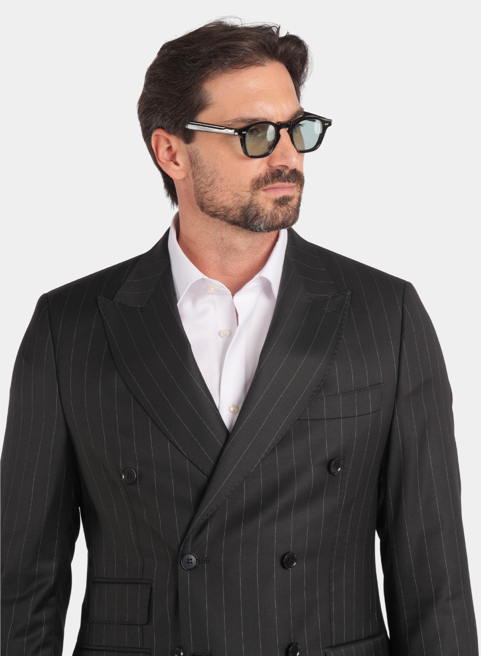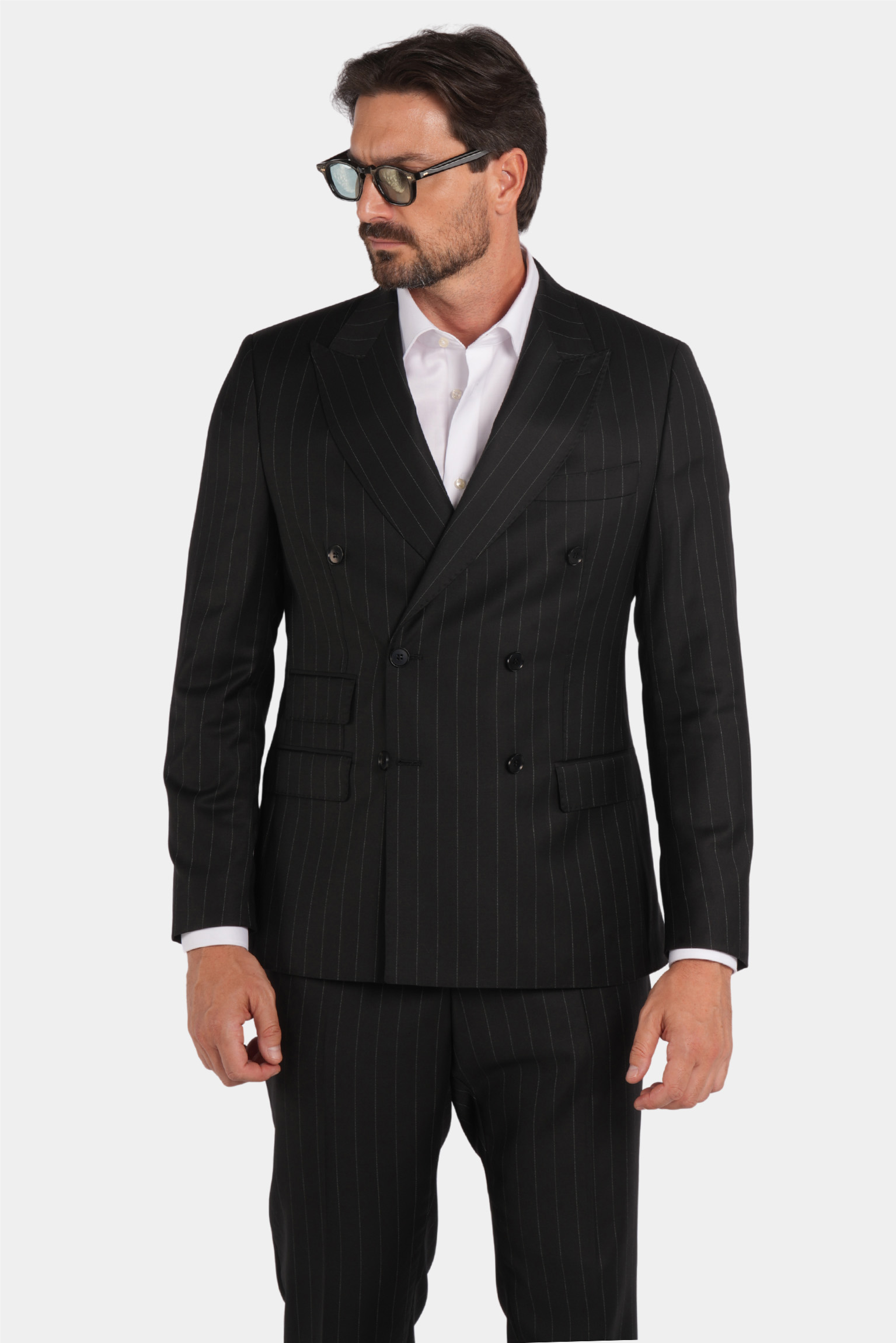 Dieser schwarze Slim-Fit-Zweireiher mit feinem Nadelstreifen vereint klassische Eleganz mit moderner Raffinesse. Gefertigt in Italien aus 100 % Super 120s-Wolle von Vitale Barberis Canonico, beeindruckt er durch sein präzises Nadelstreifenmuster und exzellente Verarbeitung. Die Halb-Canvas-Konstruktion sorgt für einen natürlichen Fall und dauerhafte Form, während das Viskosefutter höchsten Tragekomfort und ein glattes Innenfinish garantiert.