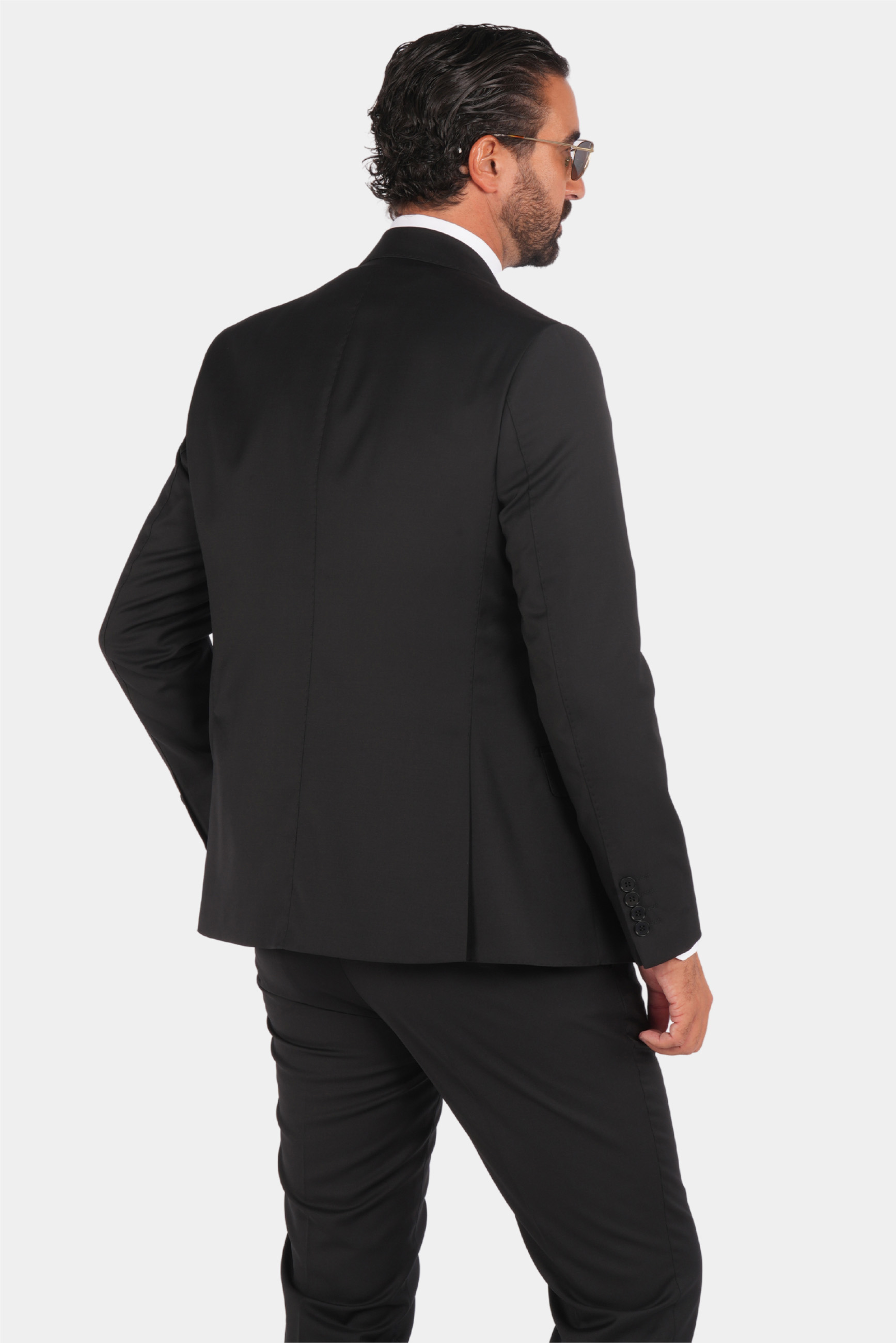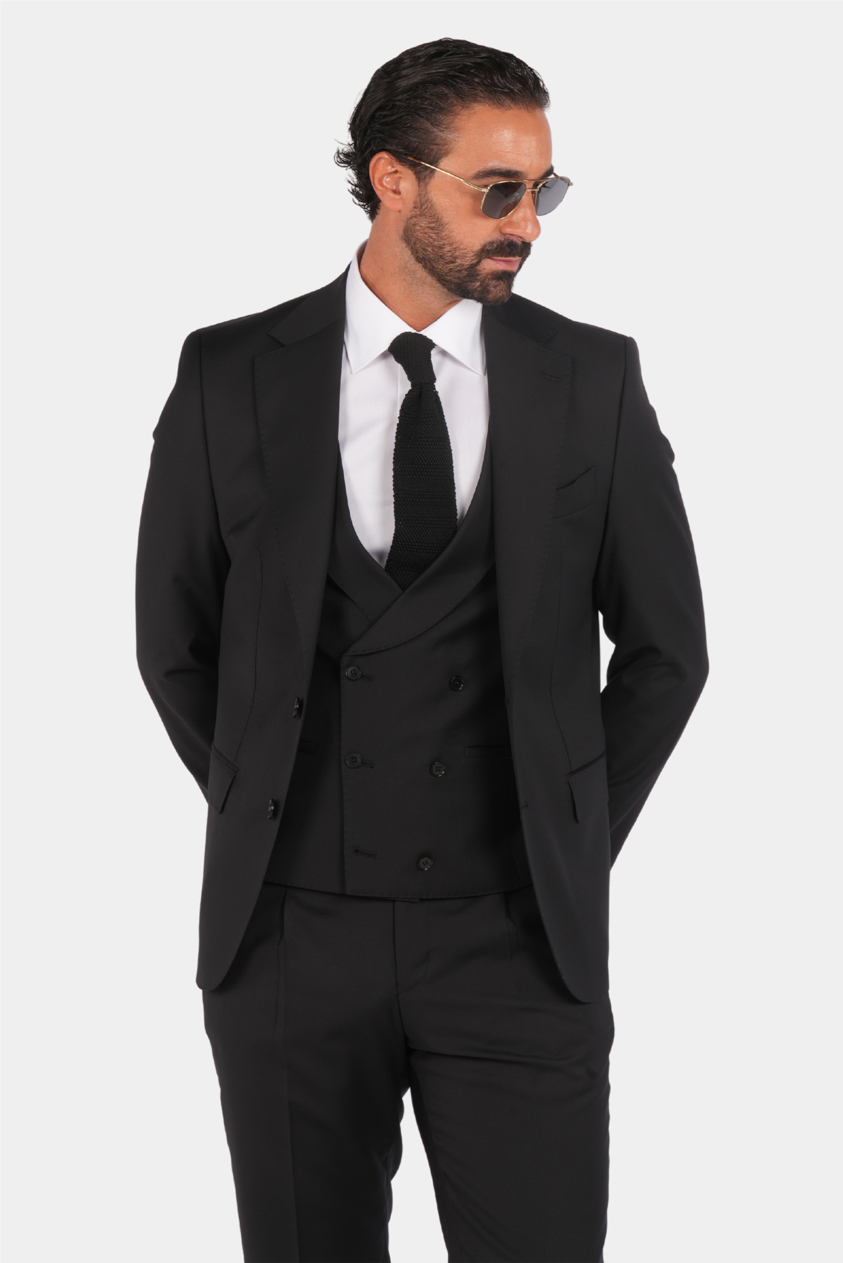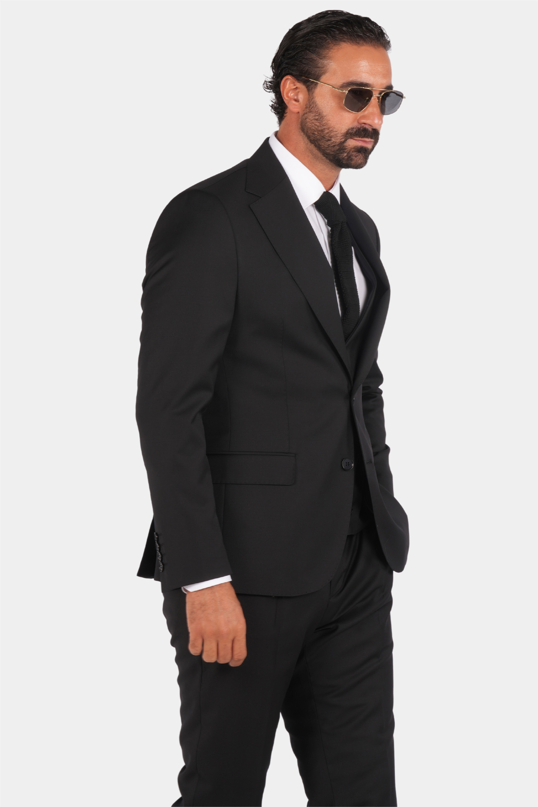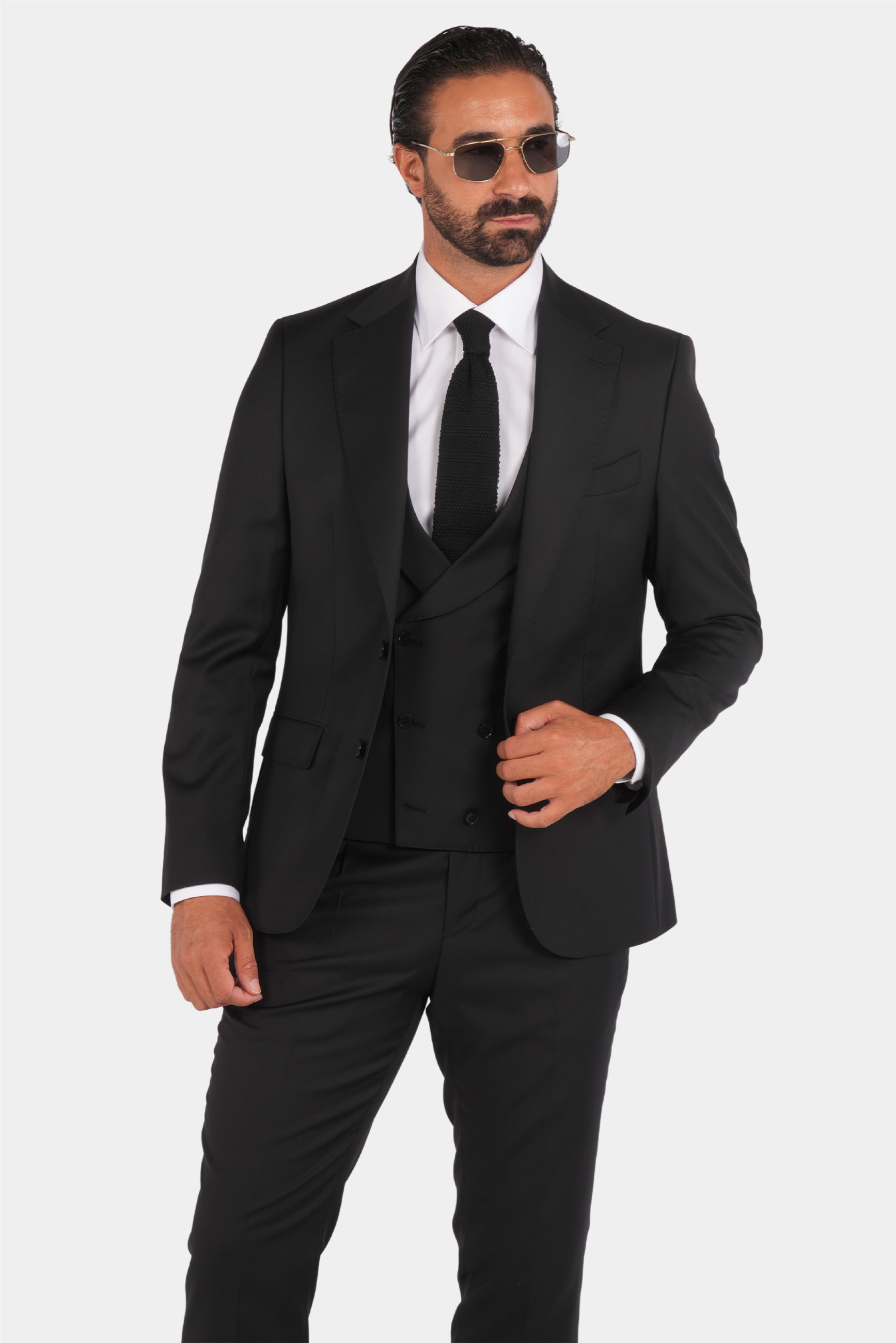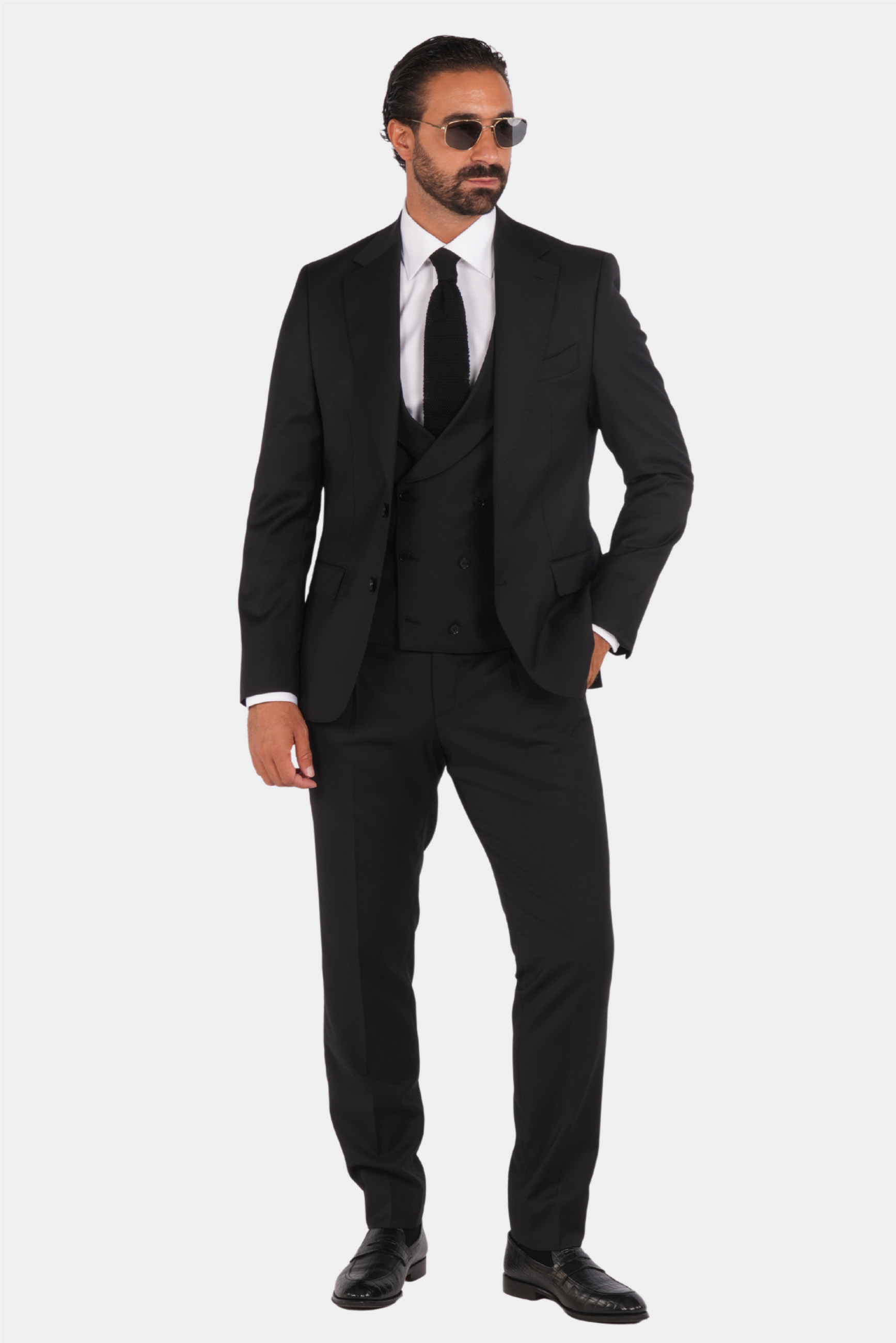 Dieser schwarze einreihige Dreiteiler verkörpert anspruchsvolle Eleganz und zeitlose italienische Schneiderkunst. Gefertigt aus 100 % Super 120s-Wolle von Vitale Barberis Canonico, einer der renommiertesten Tuchmanufakturen Italiens, bietet er einen außergewöhnlichen Fall, eine seidige Textur und höchsten Tragekomfort. Das fallende Spitzrevers verleiht dem Design klassischen Charme, während die Halb-Canvas-Konstruktion für eine perfekt ausbalancierte Struktur sorgt, die sich natürlich mit dem Körper bewegt. Vollständig mit Viskose gefüttert, sorgt der Anzug für ein glattes, atmungsaktives Finish – ideal für formelle Anlässe und geschäftliche Auftritte.