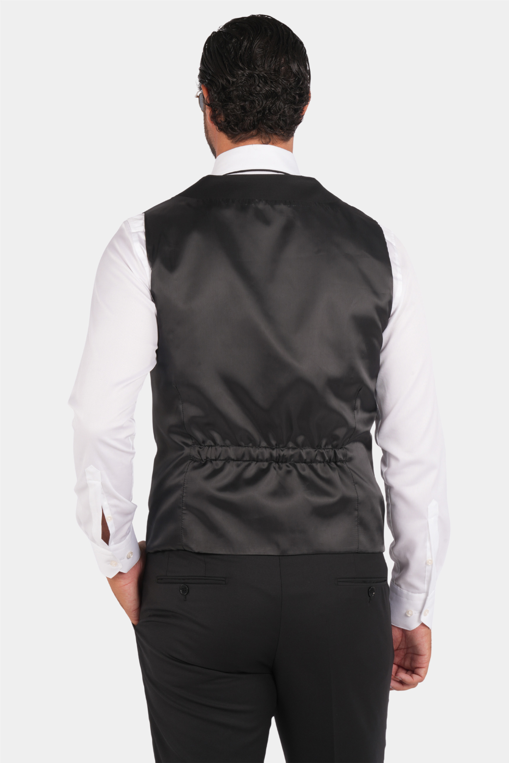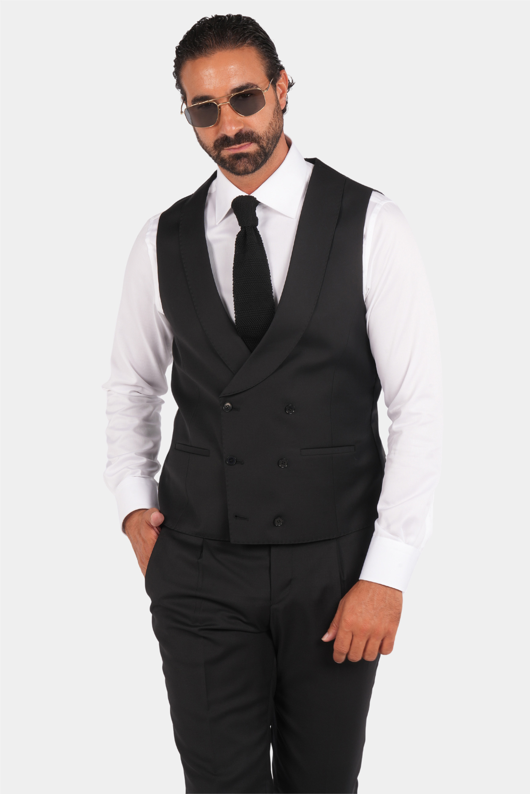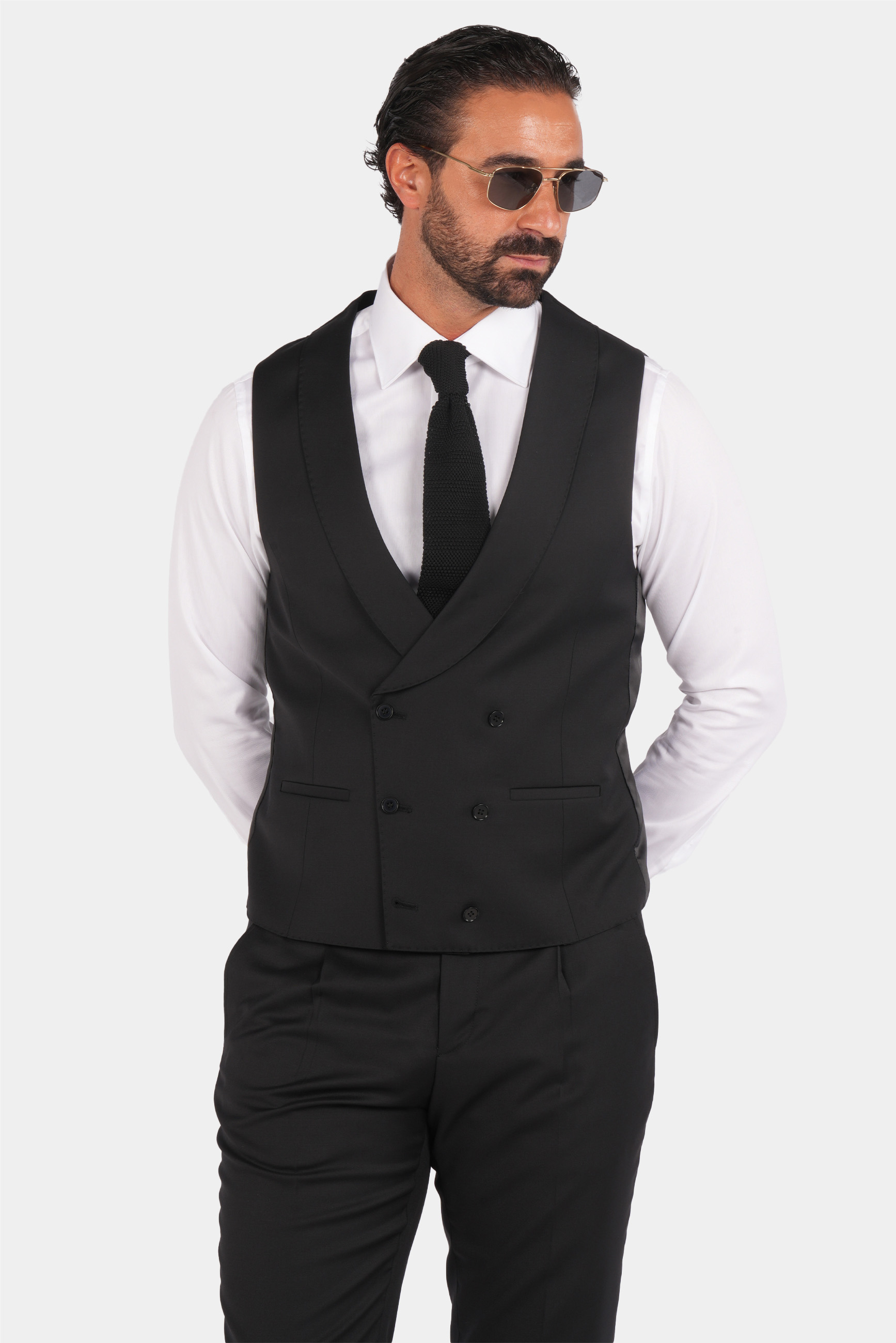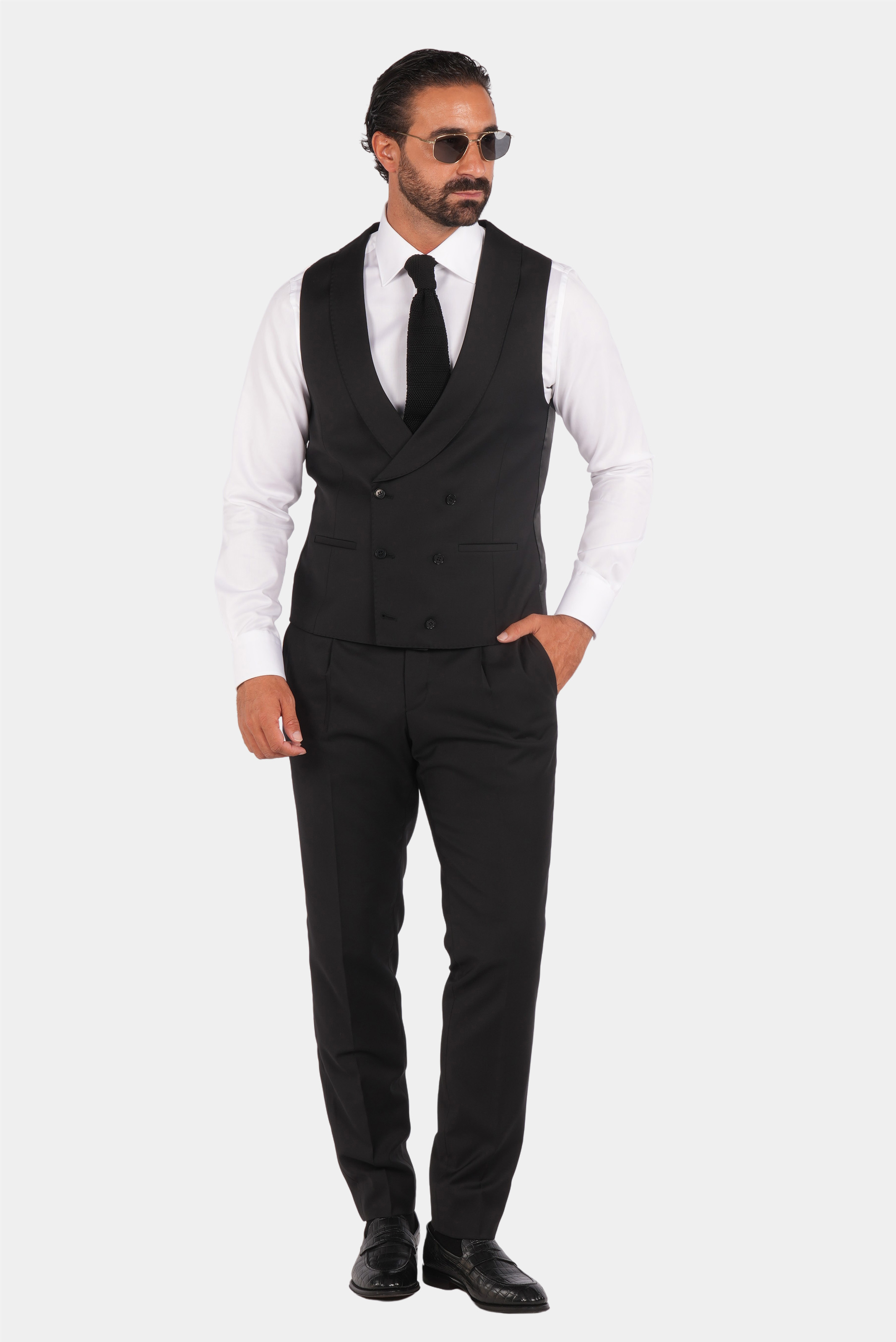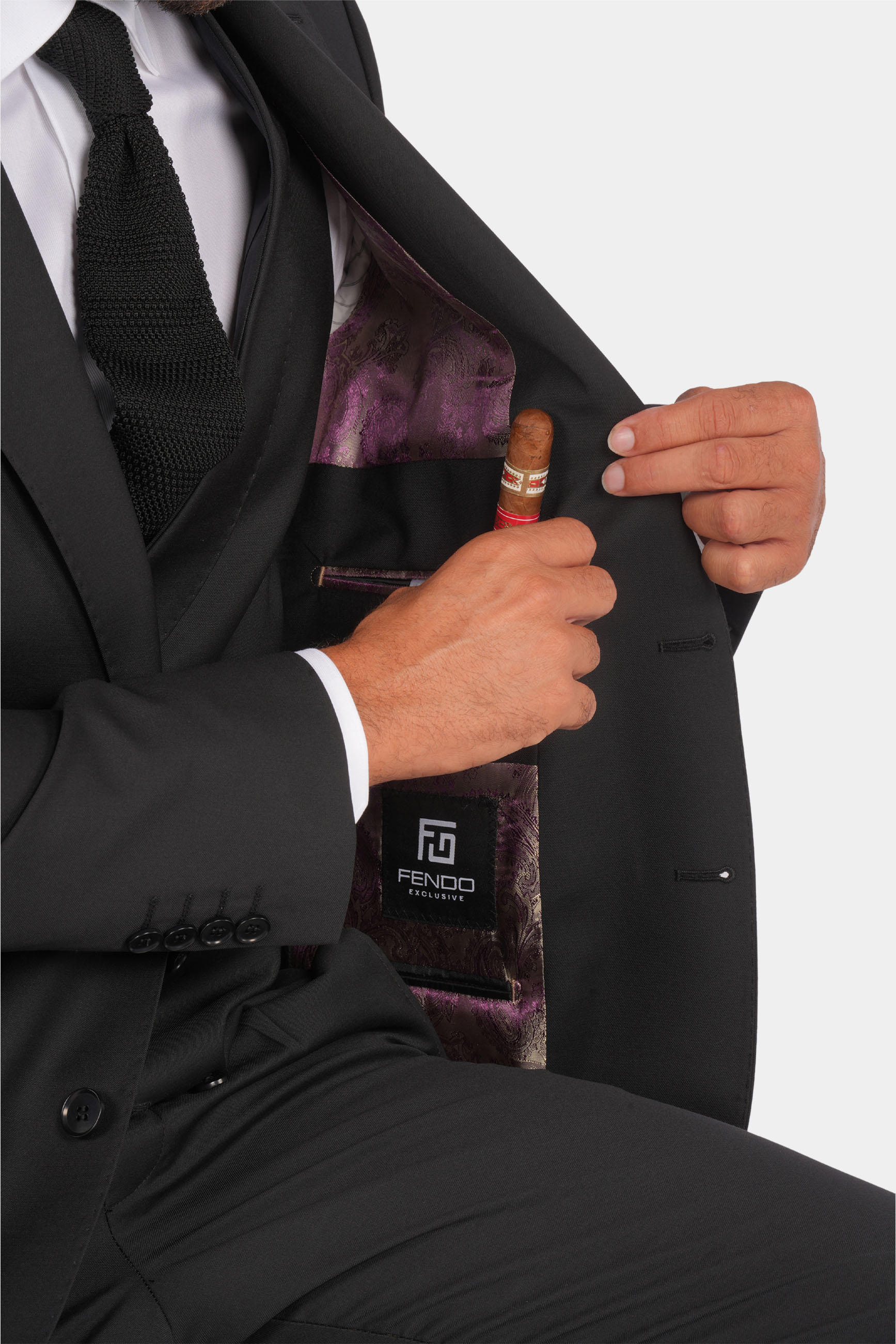 Dieser schwarze einreihige Dreiteiler verkörpert anspruchsvolle Eleganz und zeitlose italienische Schneiderkunst. Gefertigt aus 100 % Super 120s-Wolle von Vitale Barberis Canonico, einer der renommiertesten Tuchmanufakturen Italiens, bietet er einen außergewöhnlichen Fall, eine seidige Textur und höchsten Tragekomfort. Das fallende Spitzrevers verleiht dem Design klassischen Charme, während die Halb-Canvas-Konstruktion für eine perfekt ausbalancierte Struktur sorgt, die sich natürlich mit dem Körper bewegt. Vollständig mit Viskose gefüttert, sorgt der Anzug für ein glattes, atmungsaktives Finish – ideal für formelle Anlässe und geschäftliche Auftritte.