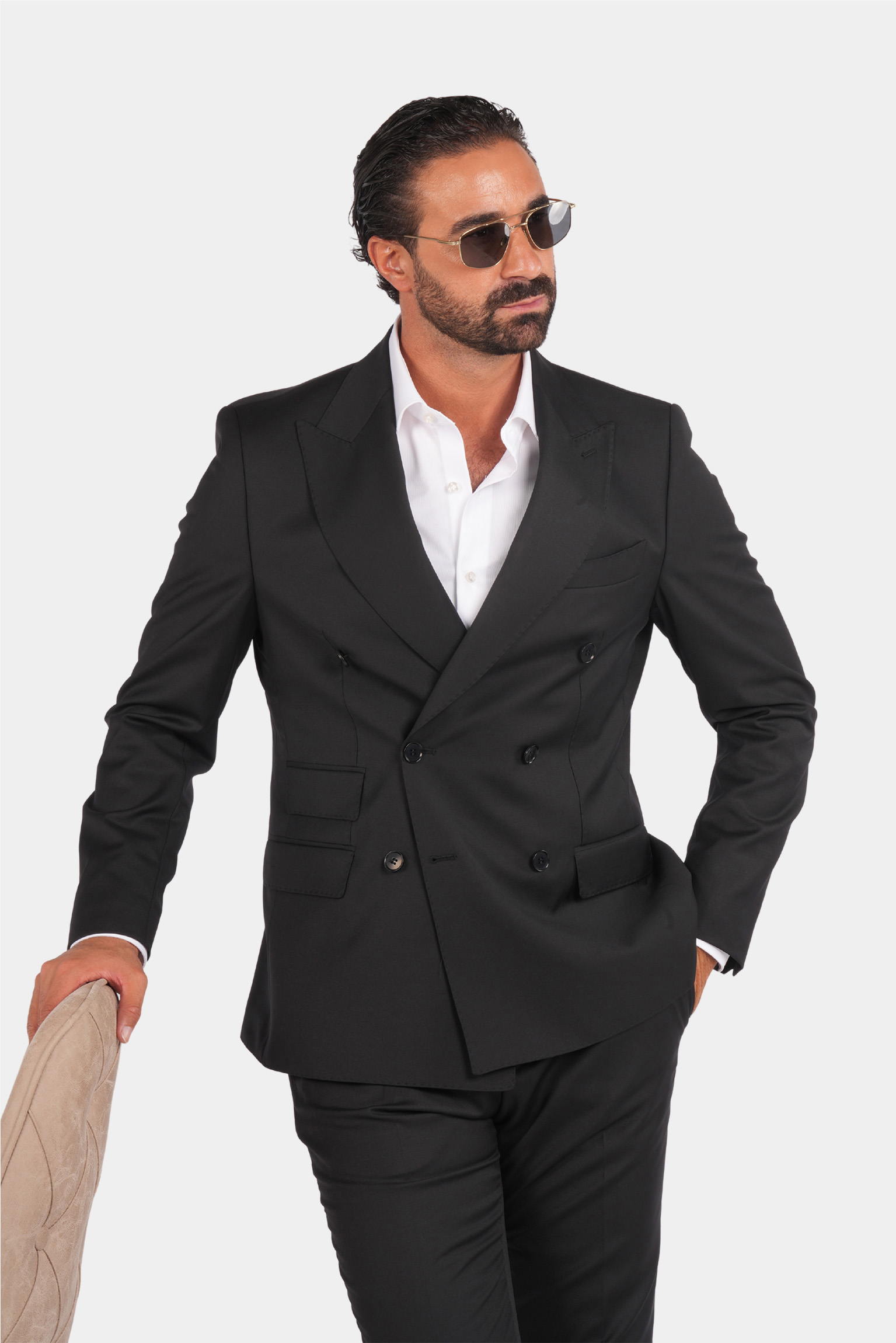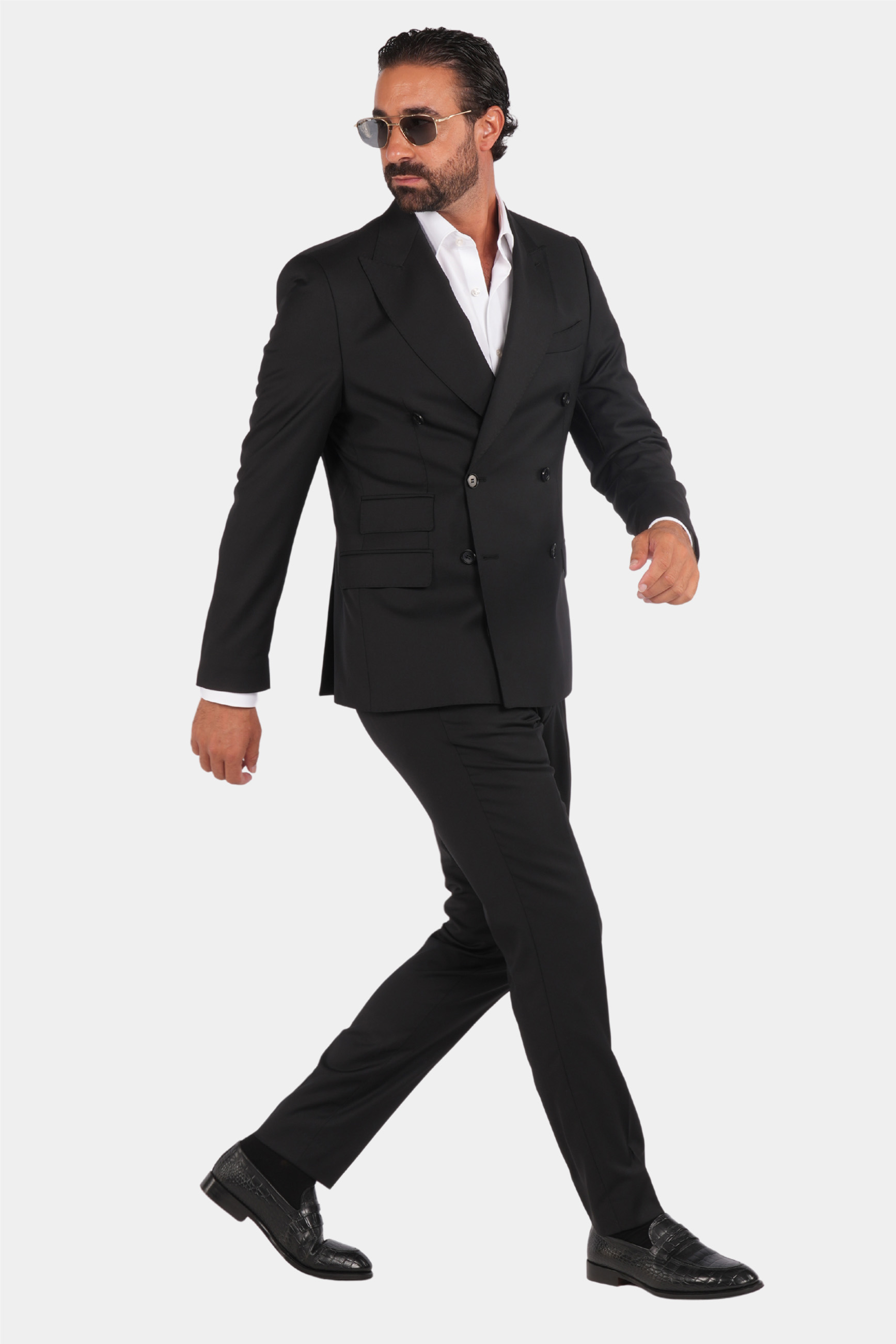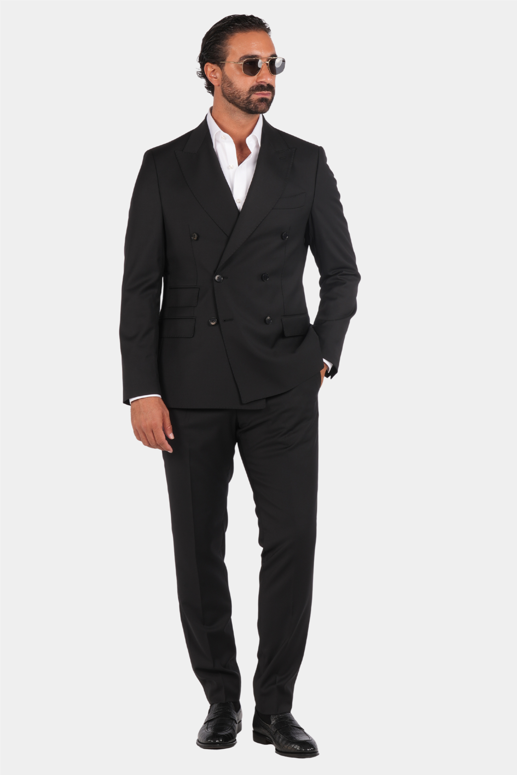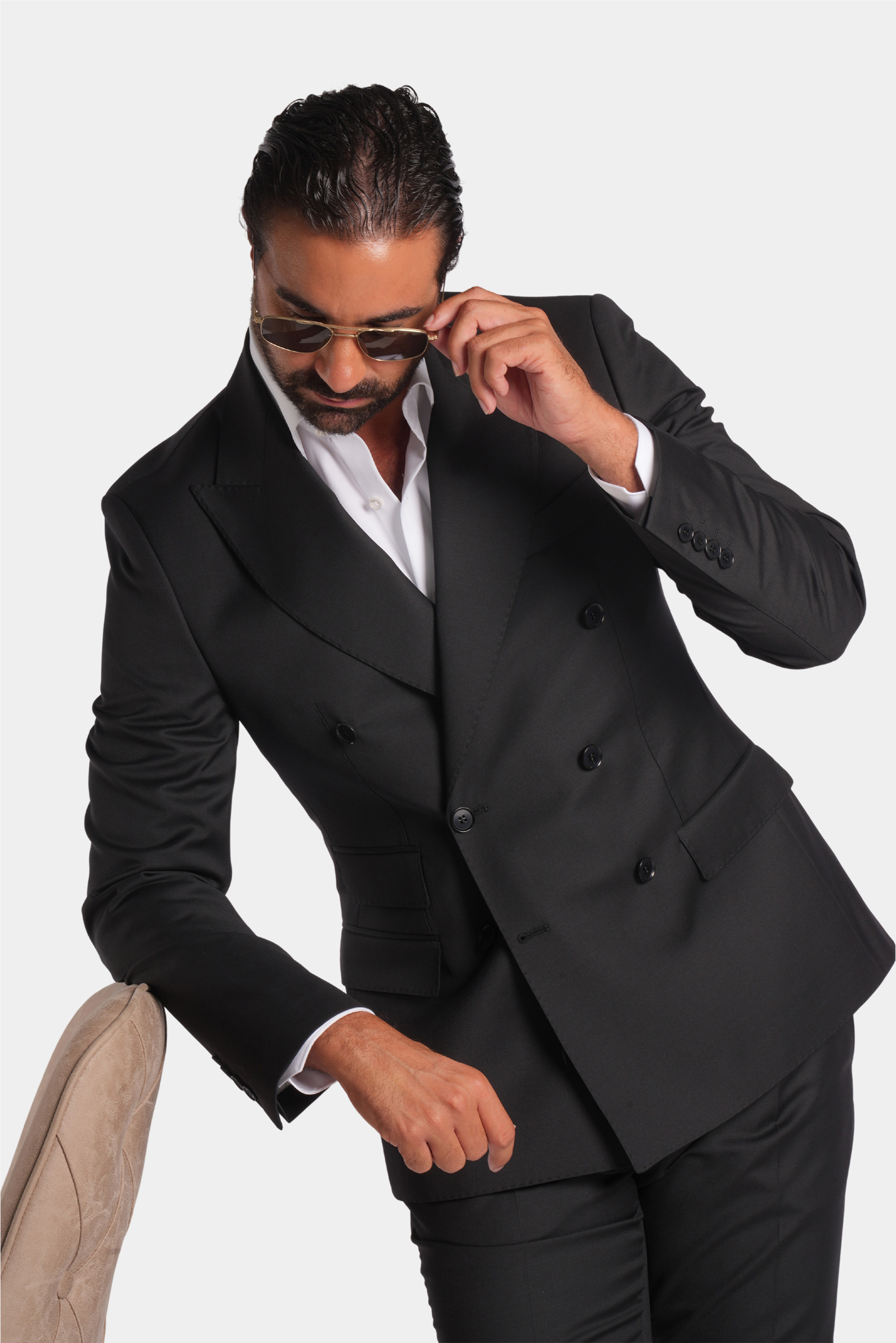 Dieser schwarze zweireihige Anzug verkörpert zeitlose Eleganz und Raffinesse – perfekt für formelle Anlässe und Business-Auftritte. Gefertigt aus 100 % Super 120s-Wolle von Vitale Barberis Canonico, bietet er luxuriösen Tragekomfort, hervorragende Atmungsaktivität und außergewöhnliche Haltbarkeit. Das steigende Spitzrevers verleiht dem Design eine elegante Note, während die Halb-Canvas-Konstruktion für eine strukturierte, aber dennoch bequeme Passform sorgt. Vollständig mit Viskose gefüttert, garantiert er ein glattes, hochwertiges Finish.