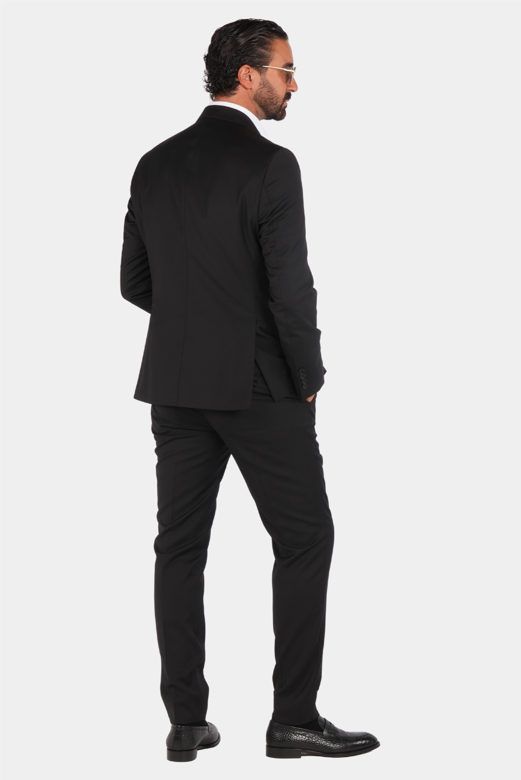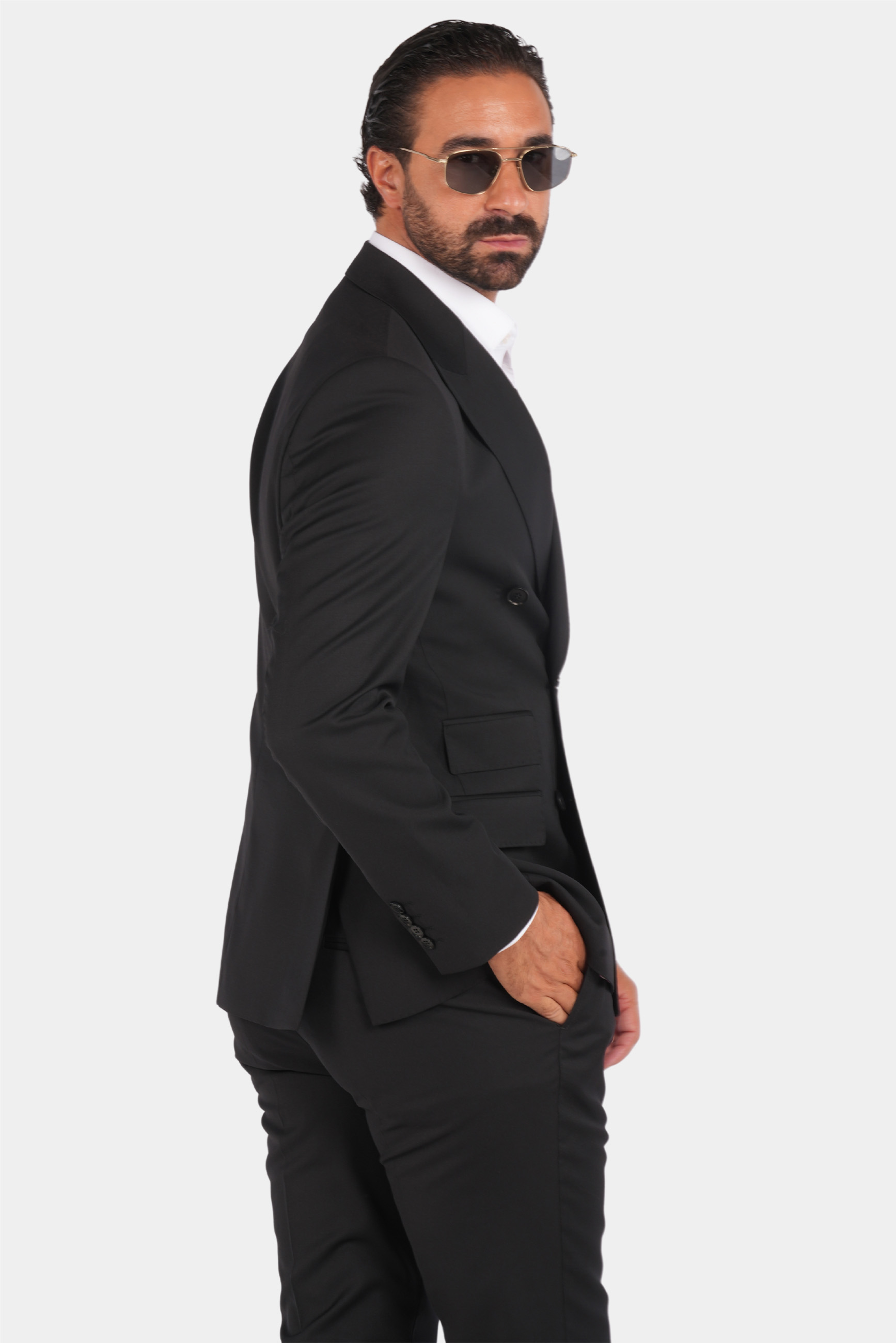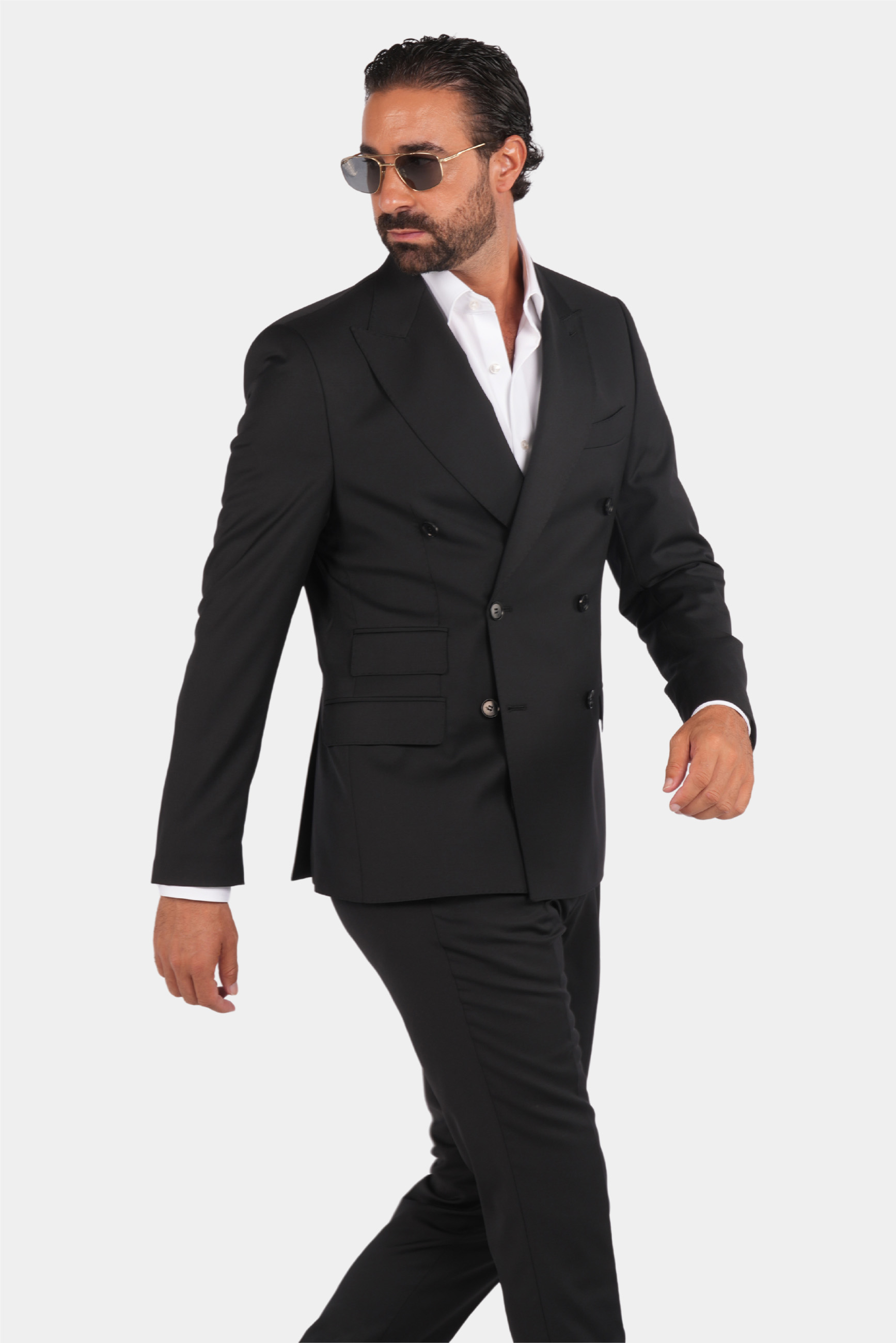 Dieser schwarze zweireihige Anzug verkörpert zeitlose Eleganz und Raffinesse – perfekt für formelle Anlässe und Business-Auftritte. Gefertigt aus 100 % Super 120s-Wolle von Vitale Barberis Canonico, bietet er luxuriösen Tragekomfort, hervorragende Atmungsaktivität und außergewöhnliche Haltbarkeit. Das steigende Spitzrevers verleiht dem Design eine elegante Note, während die Halb-Canvas-Konstruktion für eine strukturierte, aber dennoch bequeme Passform sorgt. Vollständig mit Viskose gefüttert, garantiert er ein glattes, hochwertiges Finish.