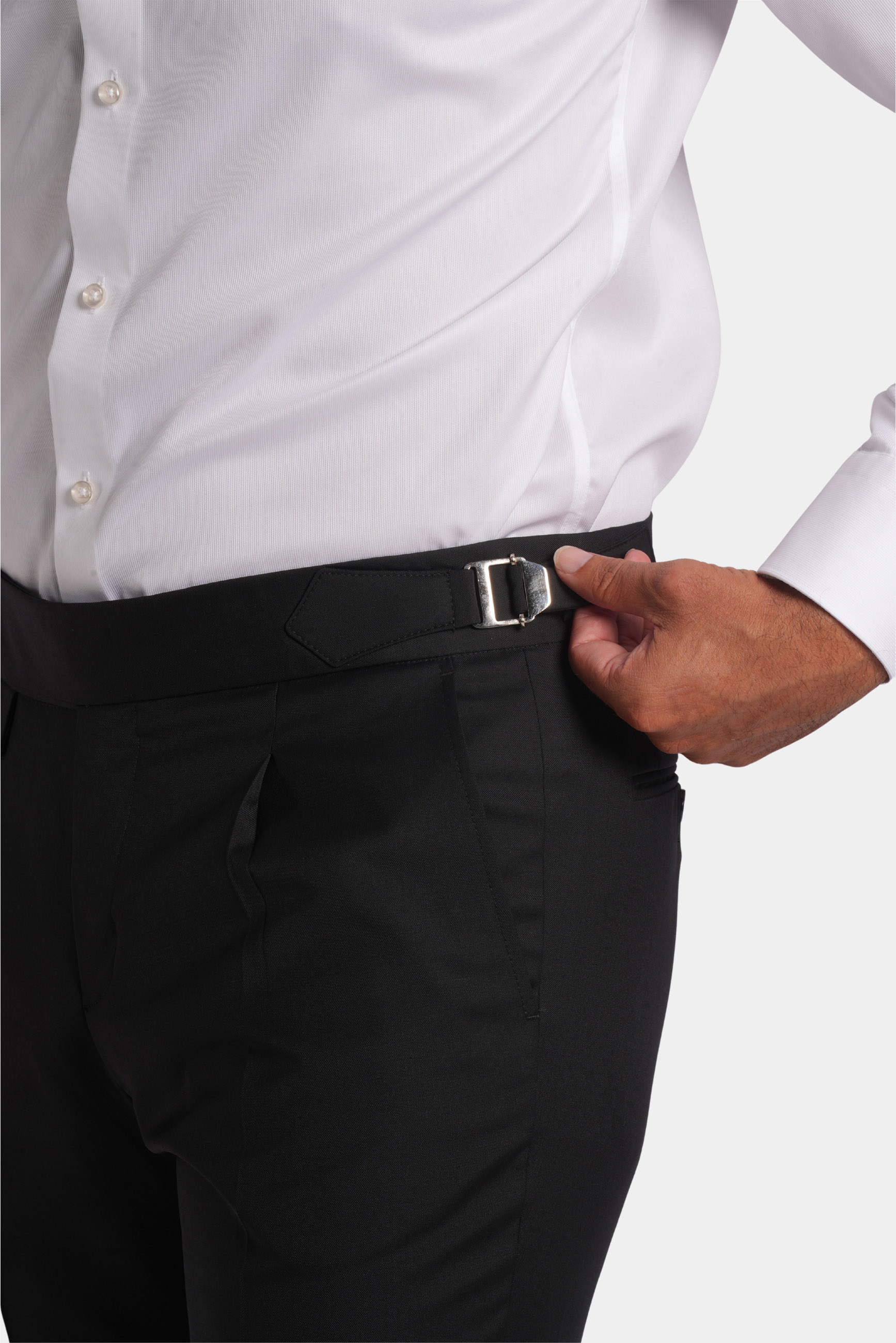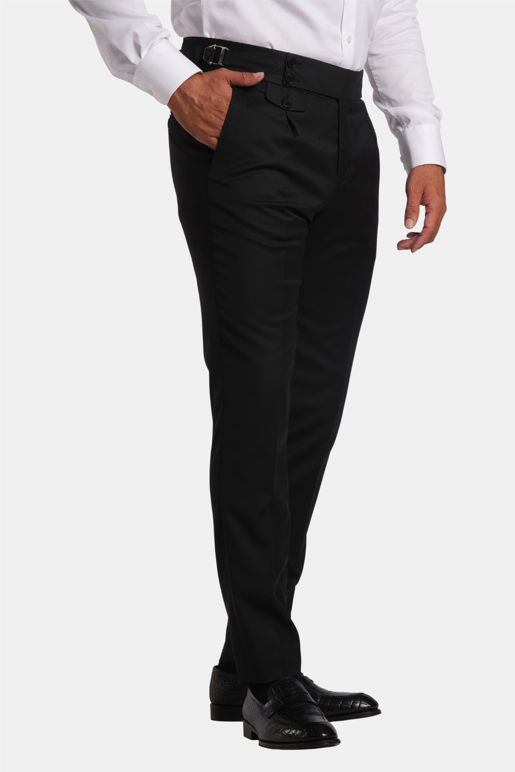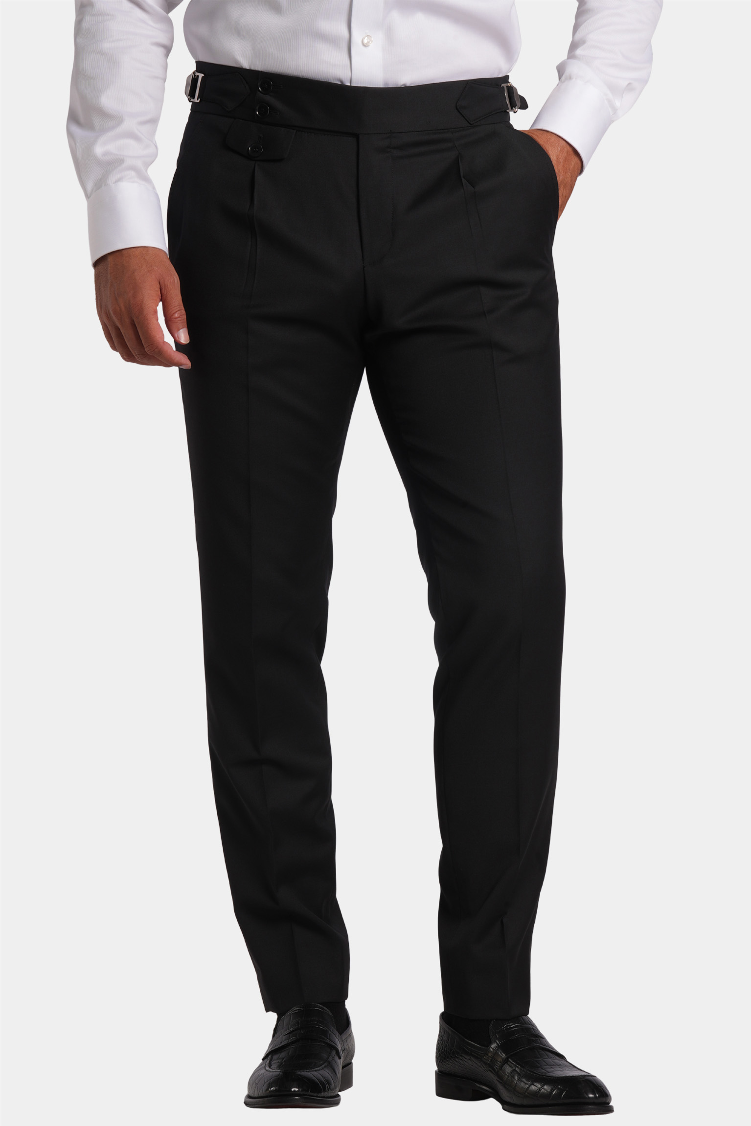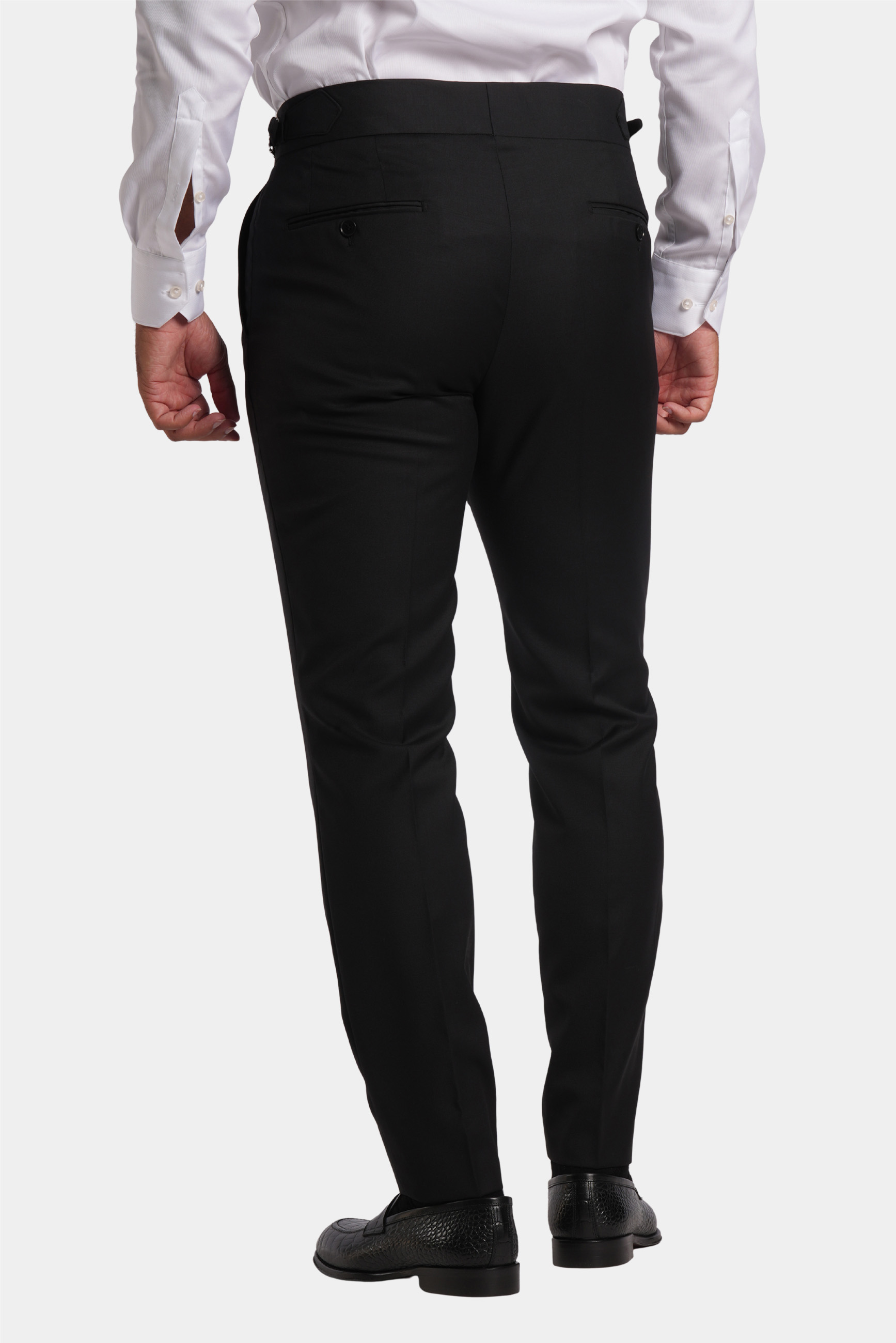 Dieser schwarze zweireihige Anzug verkörpert zeitlose Eleganz und Raffinesse – perfekt für formelle Anlässe und Business-Auftritte. Gefertigt aus 100 % Super 120s-Wolle von Vitale Barberis Canonico, bietet er luxuriösen Tragekomfort, hervorragende Atmungsaktivität und außergewöhnliche Haltbarkeit. Das steigende Spitzrevers verleiht dem Design eine elegante Note, während die Halb-Canvas-Konstruktion für eine strukturierte, aber dennoch bequeme Passform sorgt. Vollständig mit Viskose gefüttert, garantiert er ein glattes, hochwertiges Finish.