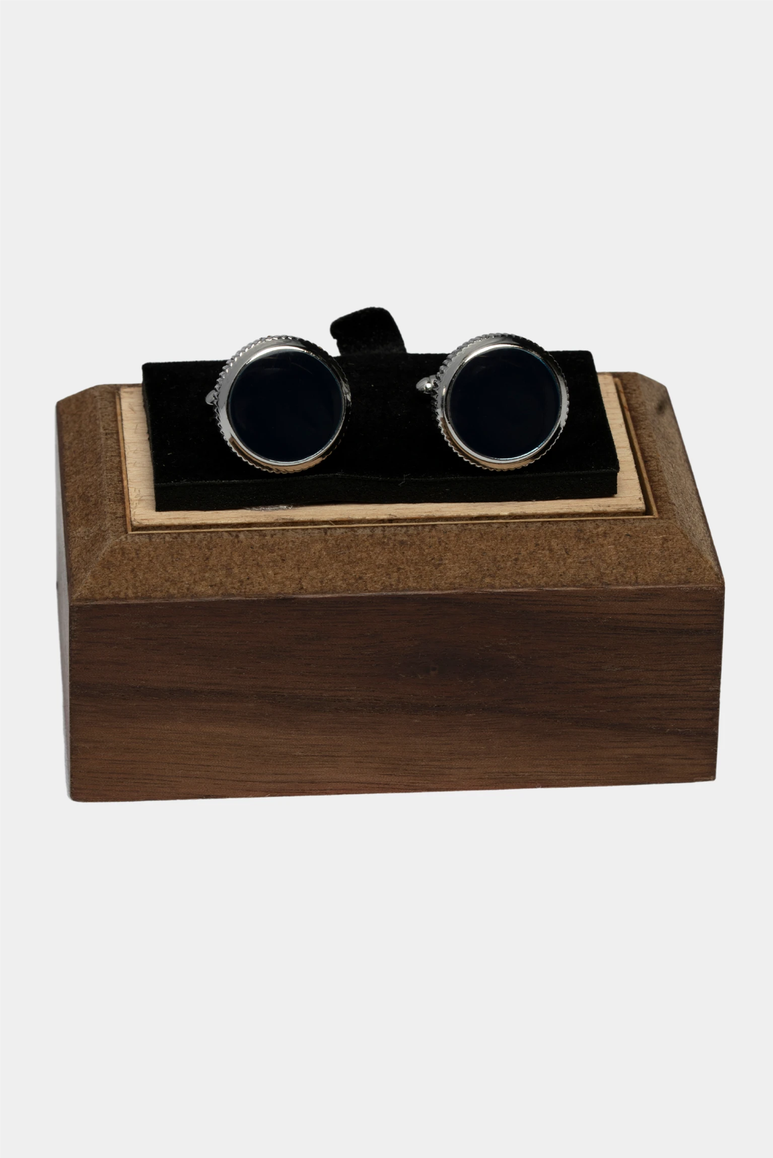 Diese Manschettenknoepfe besitzen ein klassisches rundes Design mit einem polierten Silberrahmen und einem tiefschwarzen Emaillezentrum, ergänzt durch einen fein strukturierten Rand fuer subtile Raffinesse.