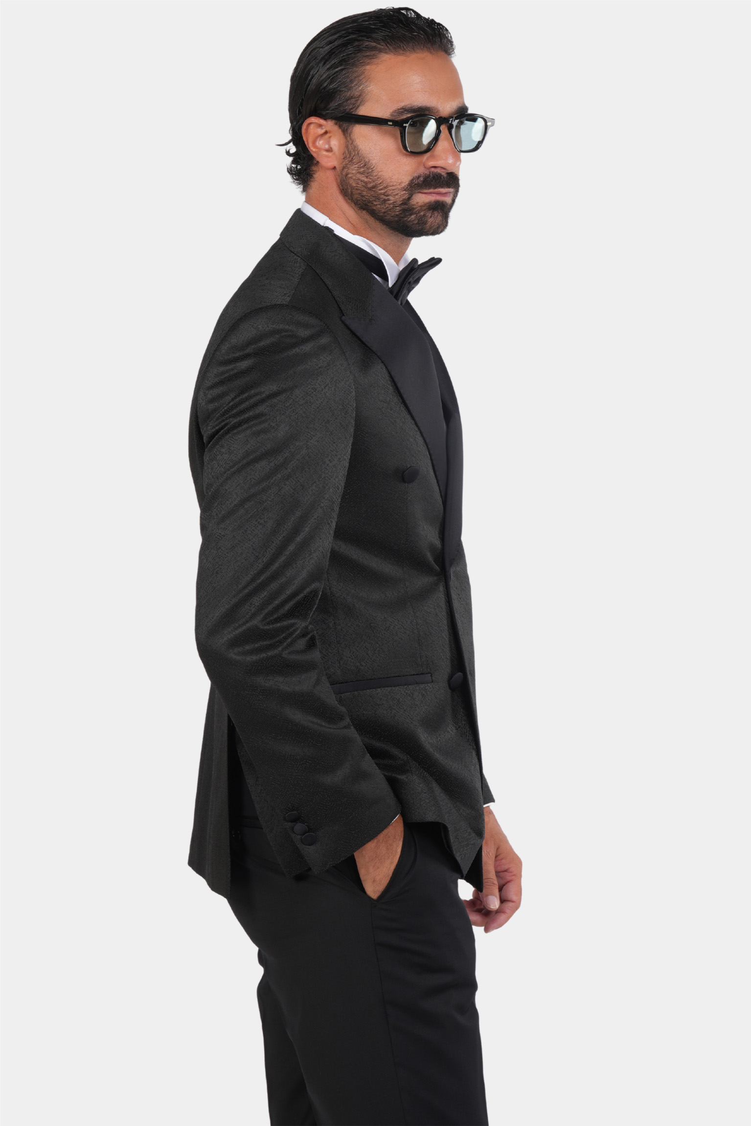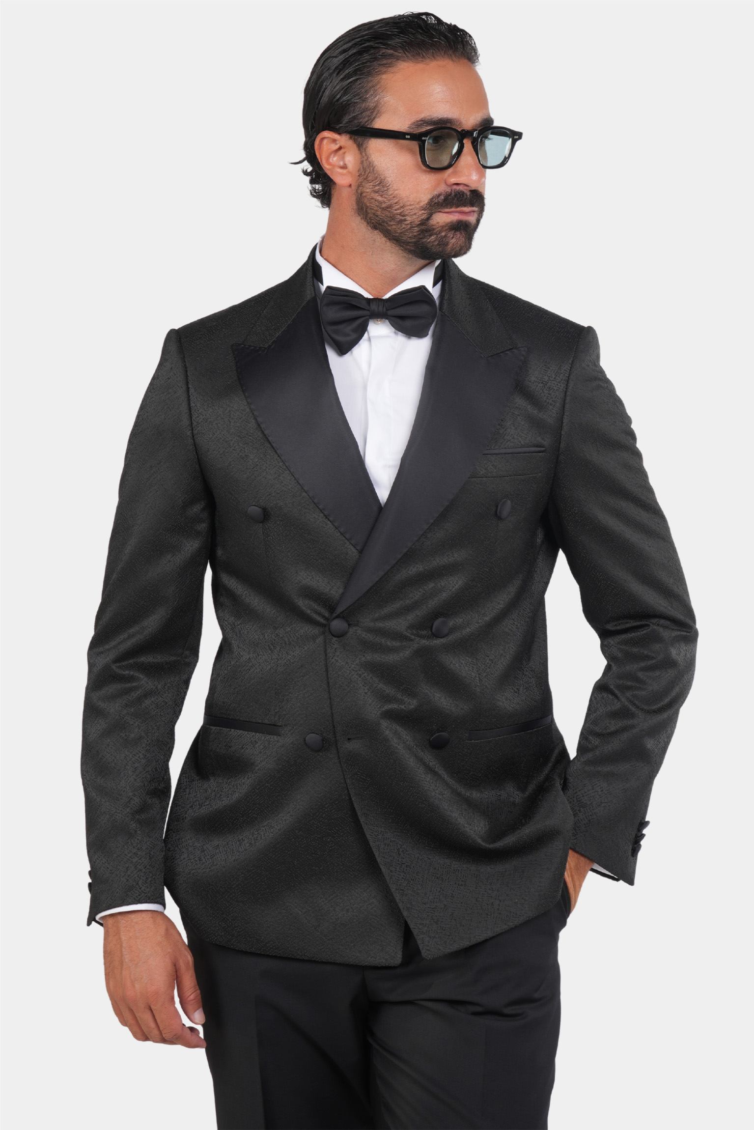 Dieser schwarze, doppelt-reihige Smokinganzug ist eine formelle und sehr stilvolle Wahl, die als großartige Option für Partys und formelle Veranstaltungen gilt.