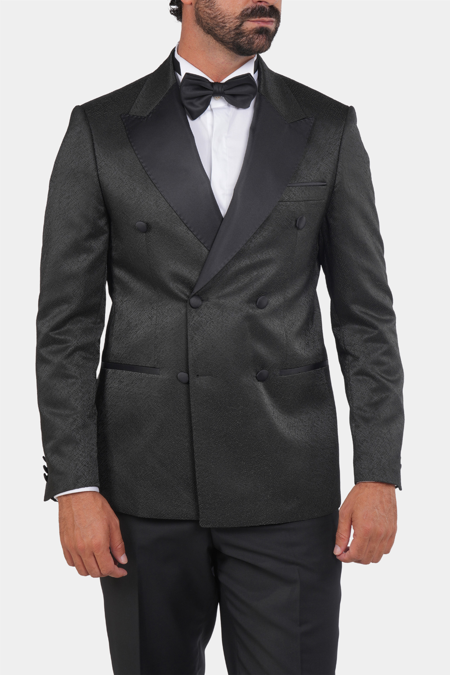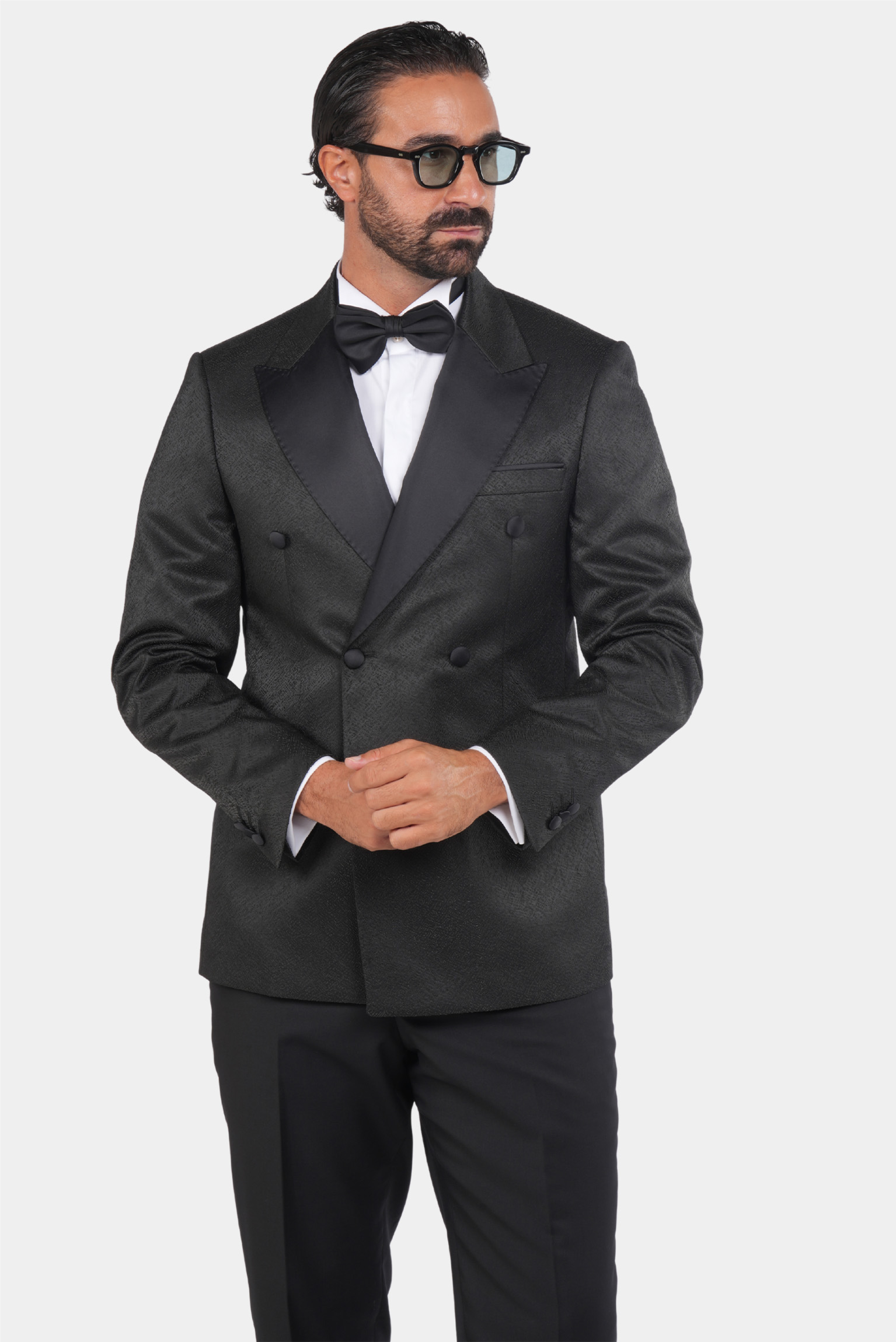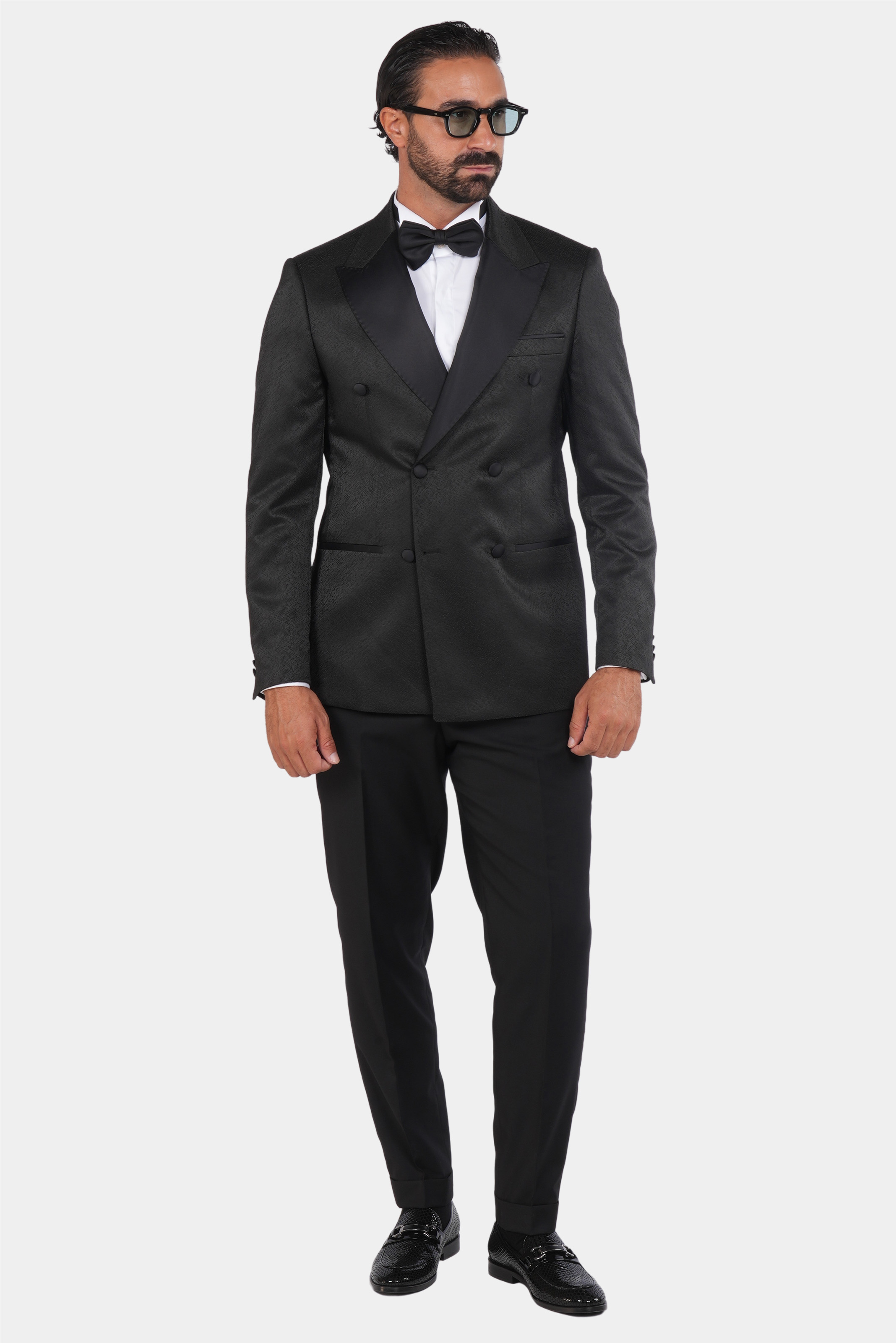 Der Schneider Fendo kann diesen doppelt-reihigen Smokinganzug individuell für Sie anpassen.