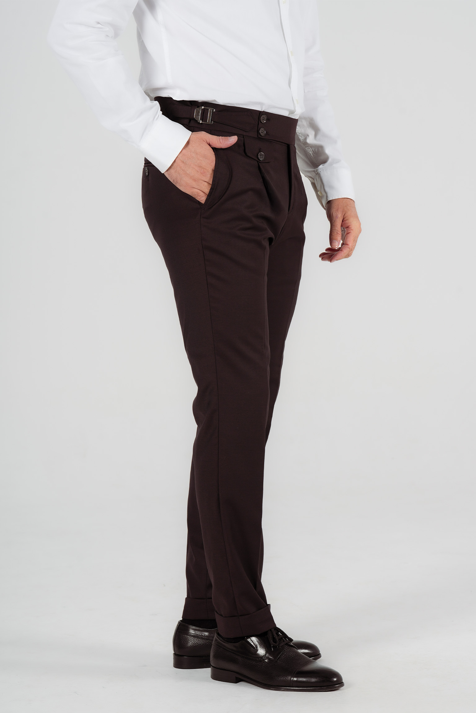 Im klassischen italienischen Stil gestaltet, verfuegt sie ueber eine Bundfalte und verstellbare Seitenspangen, die eine elegante, schmale Passform ohne Guertel ermoeglichen. Der tiefe Weinrotton verleiht dem Look Raffinesse und Individualitaet – ideal fuer formelle Anlaesse, Buerooutfits oder gepflegte Freizeitlooks.
