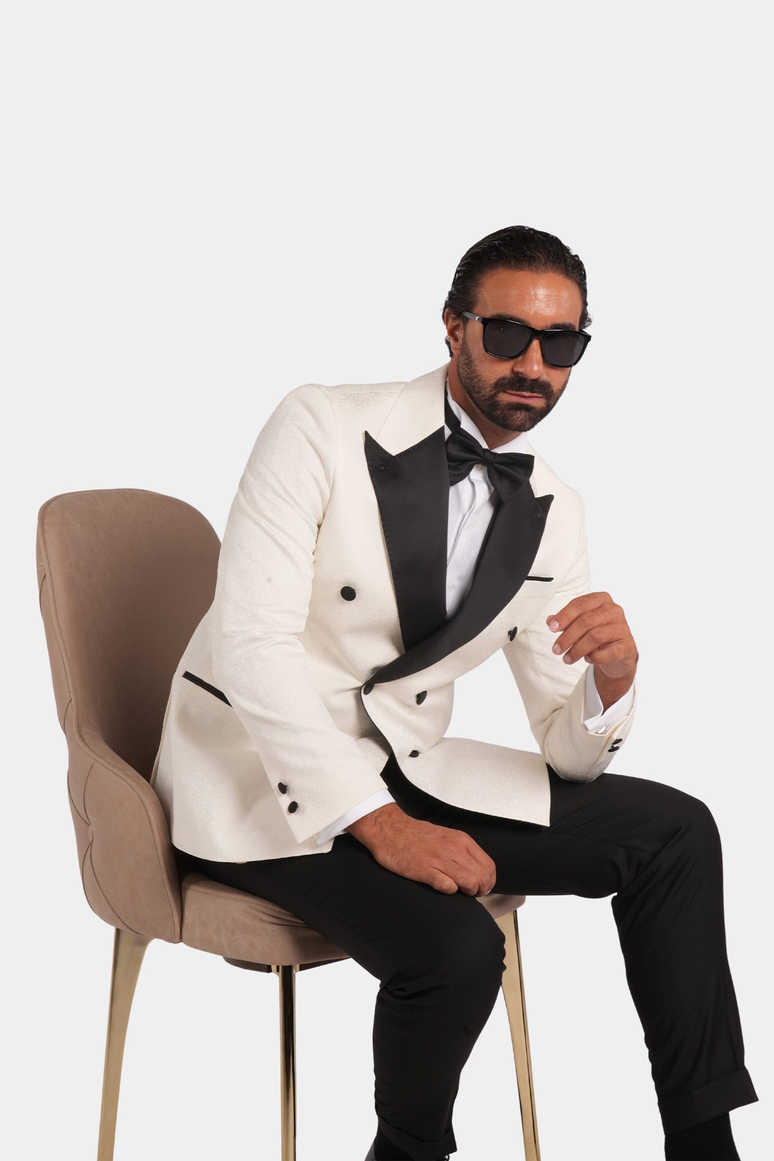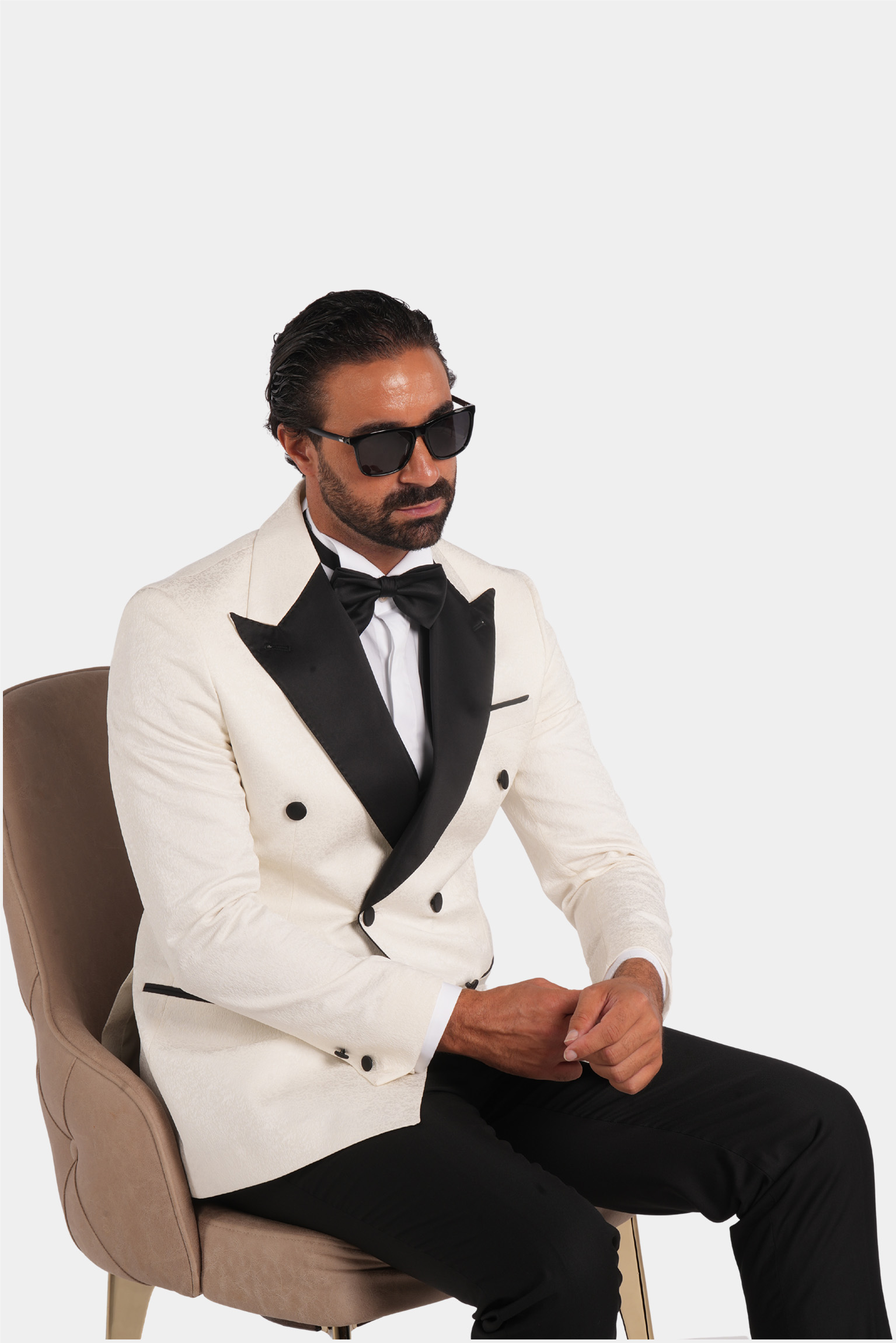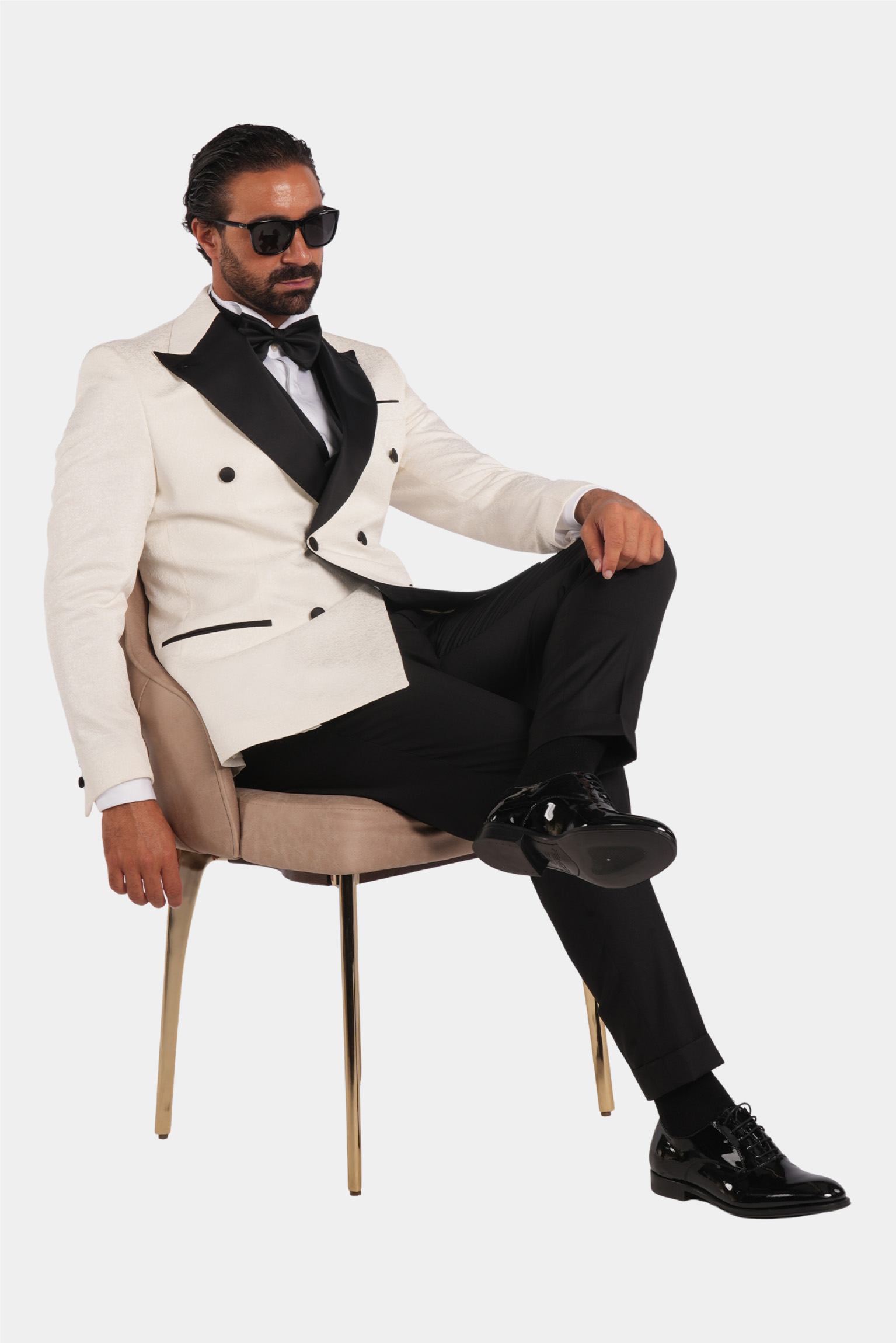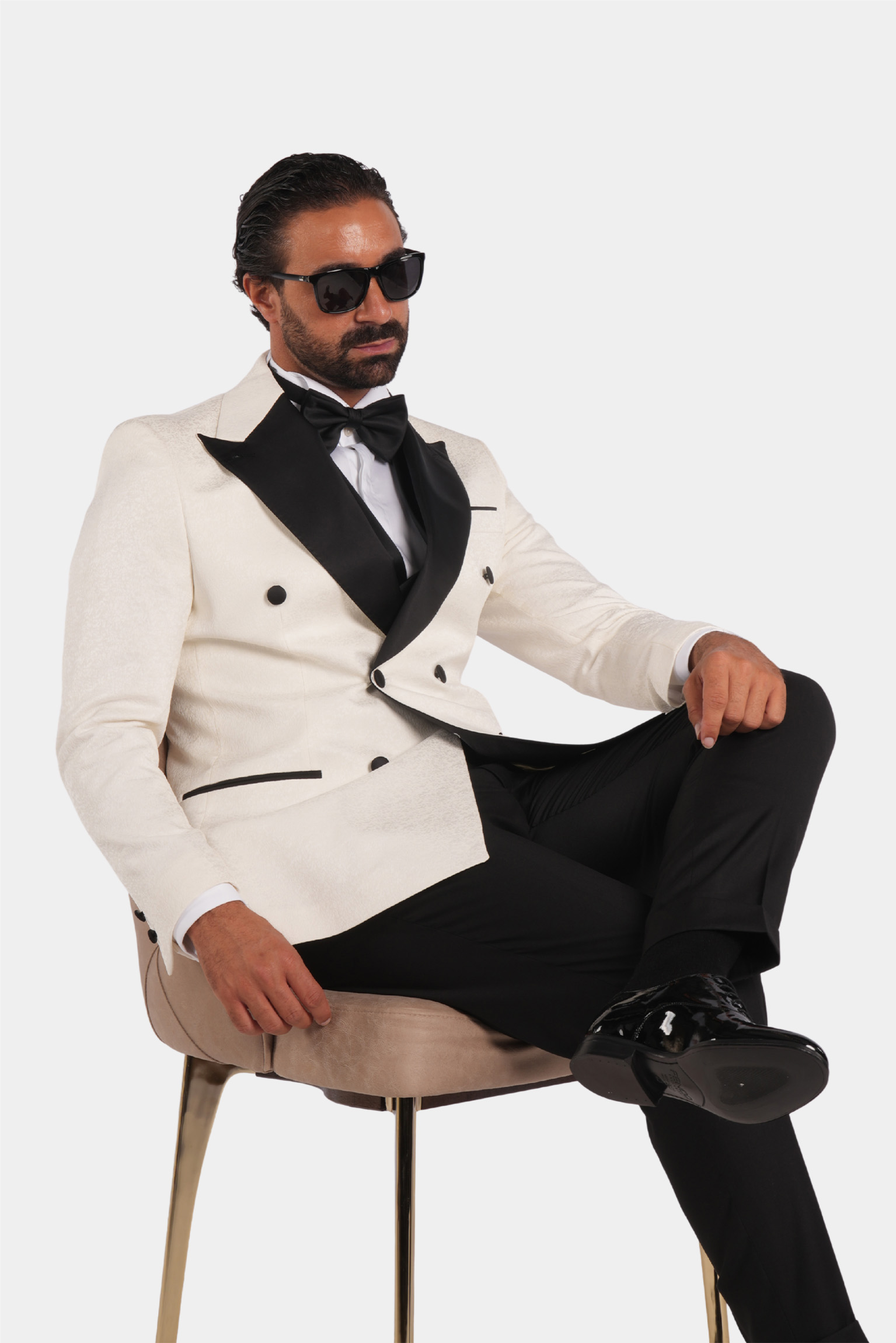 Dieser weisse Slim-Fit-Zweireiher-Smoking verkörpert zeitlose Raffinesse und italienische Handwerkskunst. Gefertigt aus 100 % Super 120s-Wolle von Vitale Barberis Canonico, bietet er eine edle Textur, einen aussergewöhnlich eleganten Fall und luxuriösen Tragekomfort. Die kontrastierenden schwarzen Satin-Spitzrevers und feinen Details schaffen ein harmonisches Gleichgewicht aus Ausdruckskraft und Eleganz – perfekt für Abendveranstaltungen und festliche Anlässe.