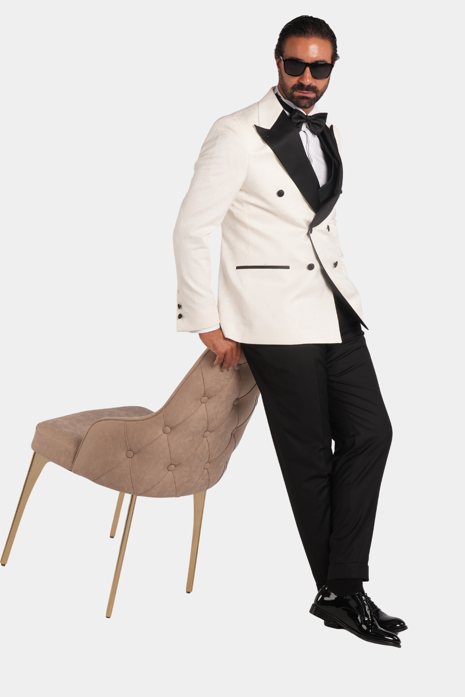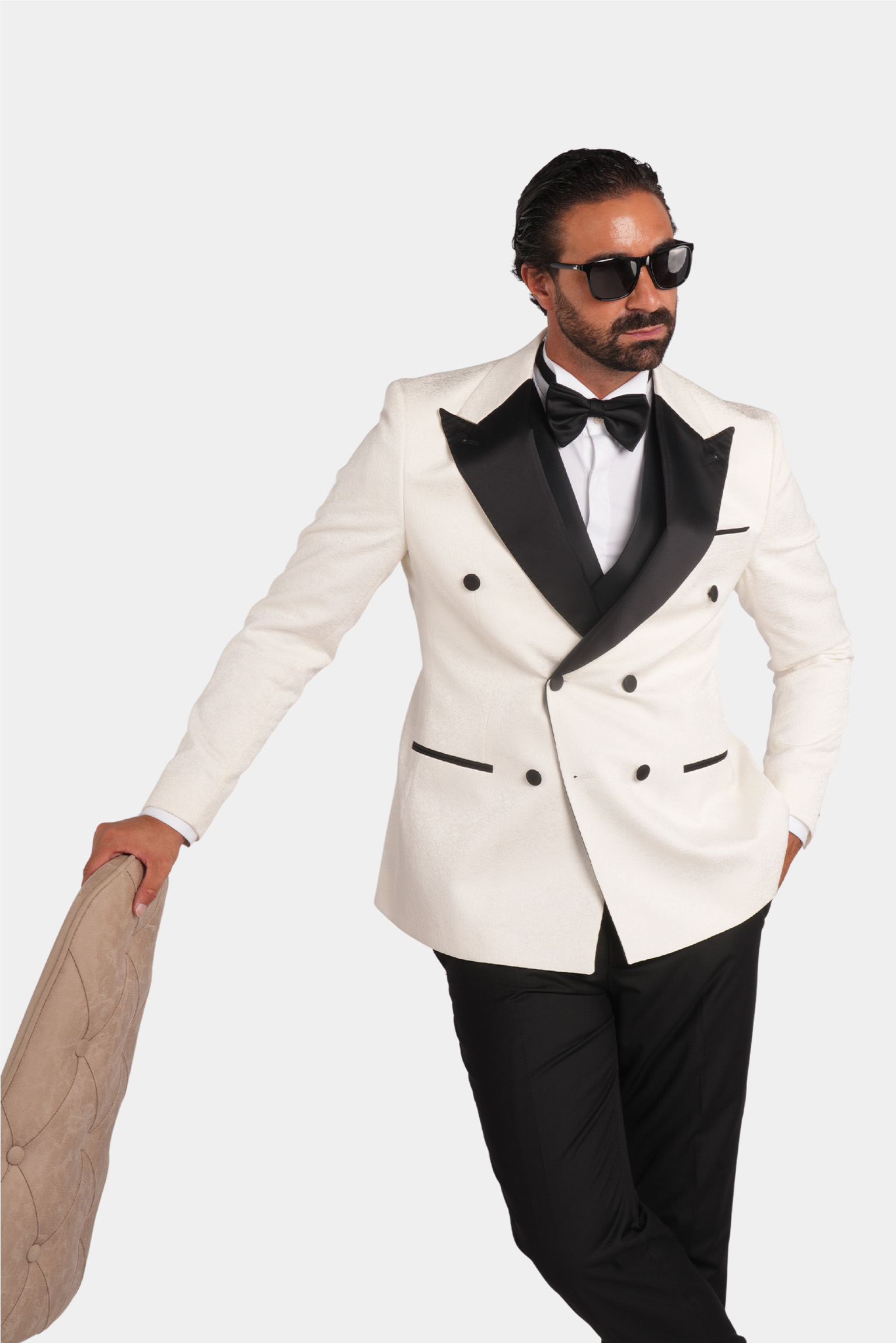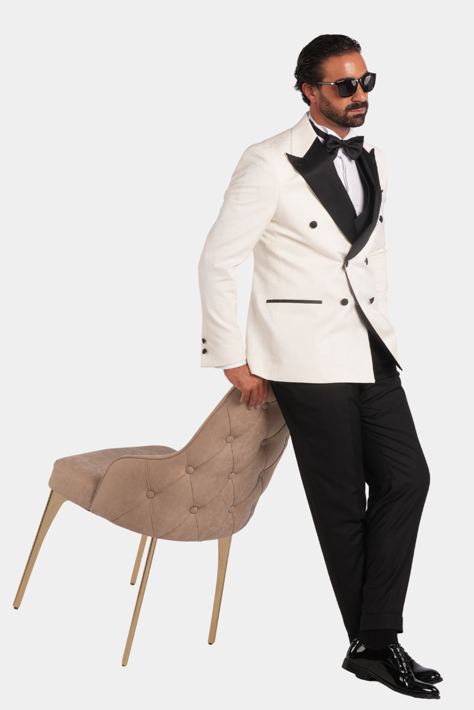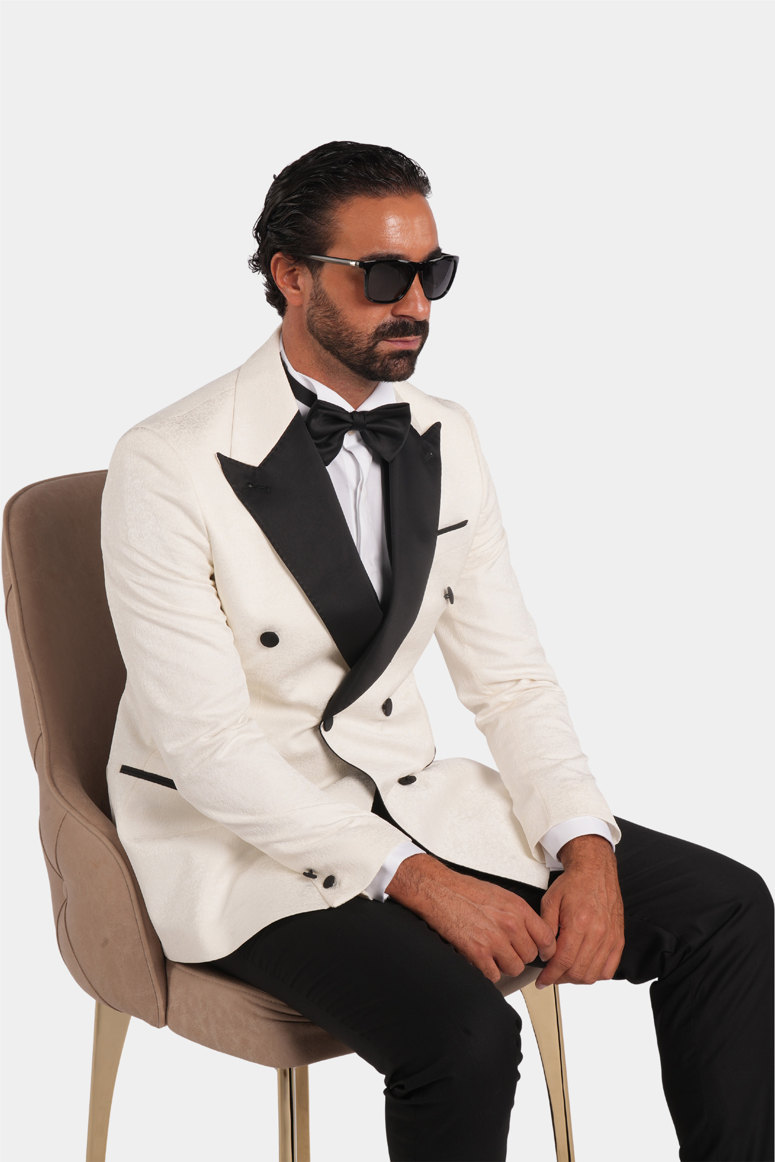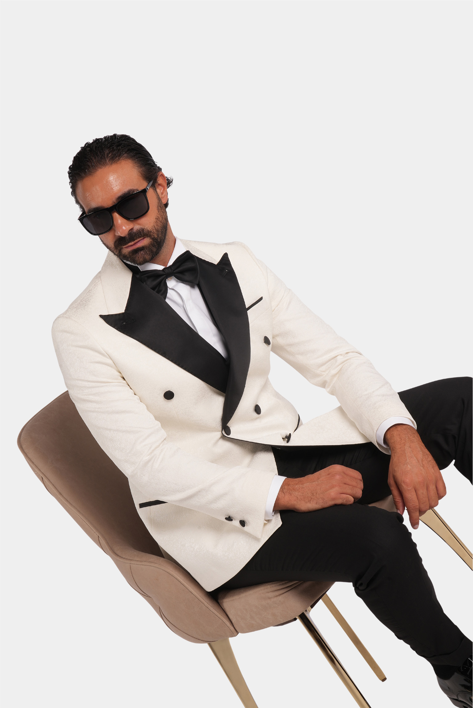 Dieser weisse Slim-Fit-Zweireiher-Smoking verkörpert zeitlose Raffinesse und italienische Handwerkskunst. Gefertigt aus 100 % Super 120s-Wolle von Vitale Barberis Canonico, bietet er eine edle Textur, einen aussergewöhnlich eleganten Fall und luxuriösen Tragekomfort. Die kontrastierenden schwarzen Satin-Spitzrevers und feinen Details schaffen ein harmonisches Gleichgewicht aus Ausdruckskraft und Eleganz – perfekt für Abendveranstaltungen und festliche Anlässe.