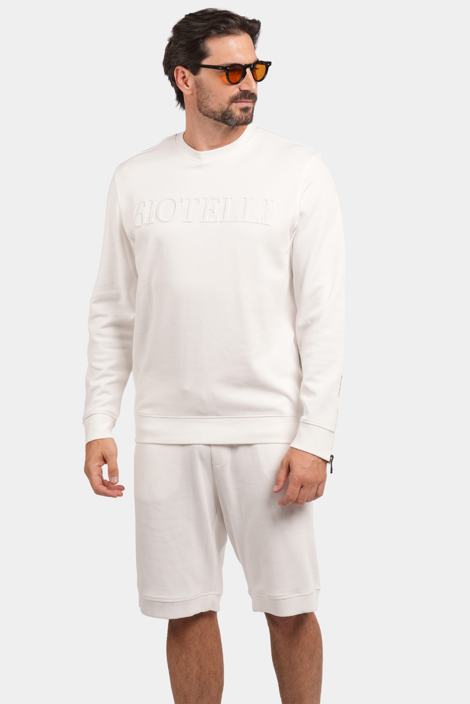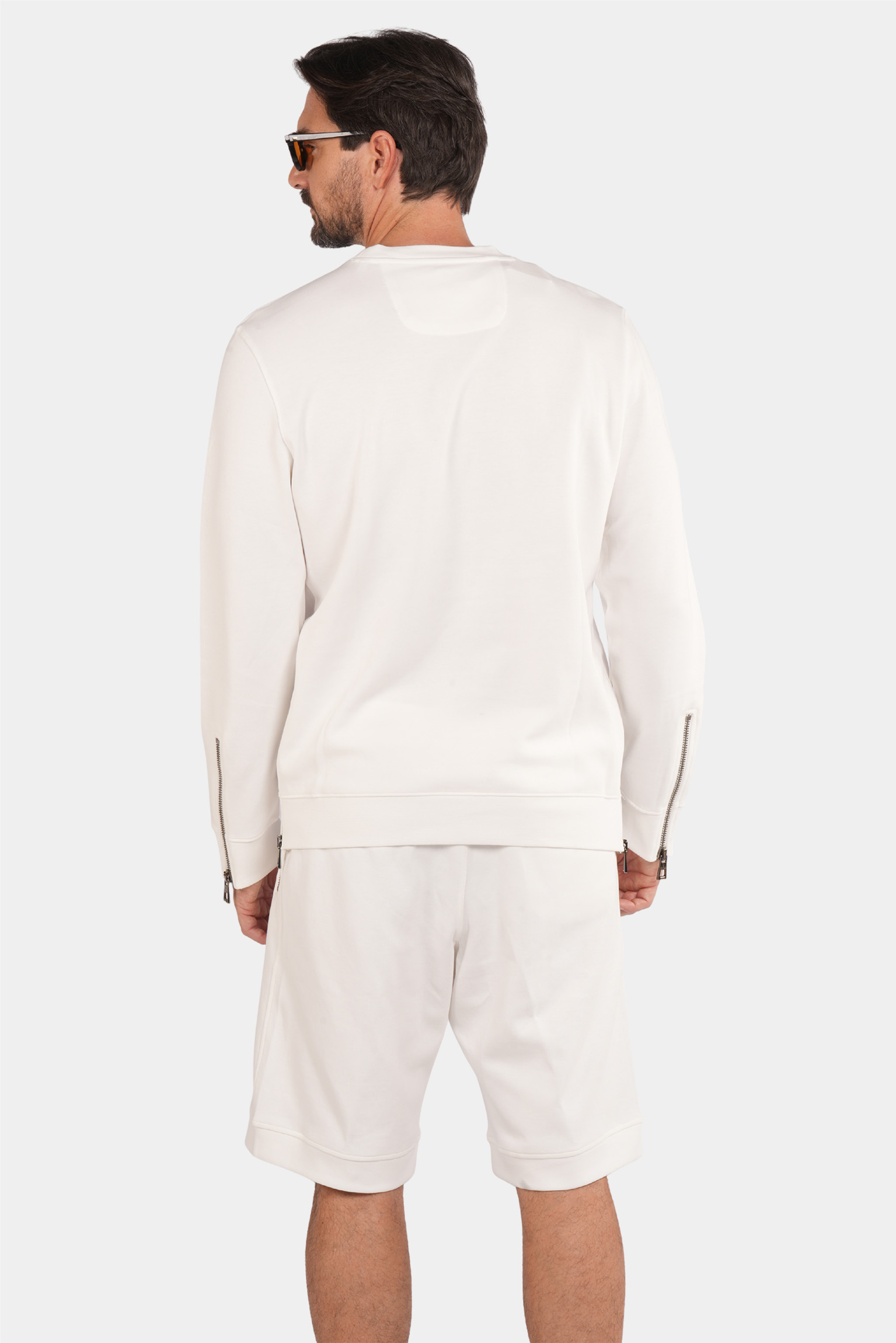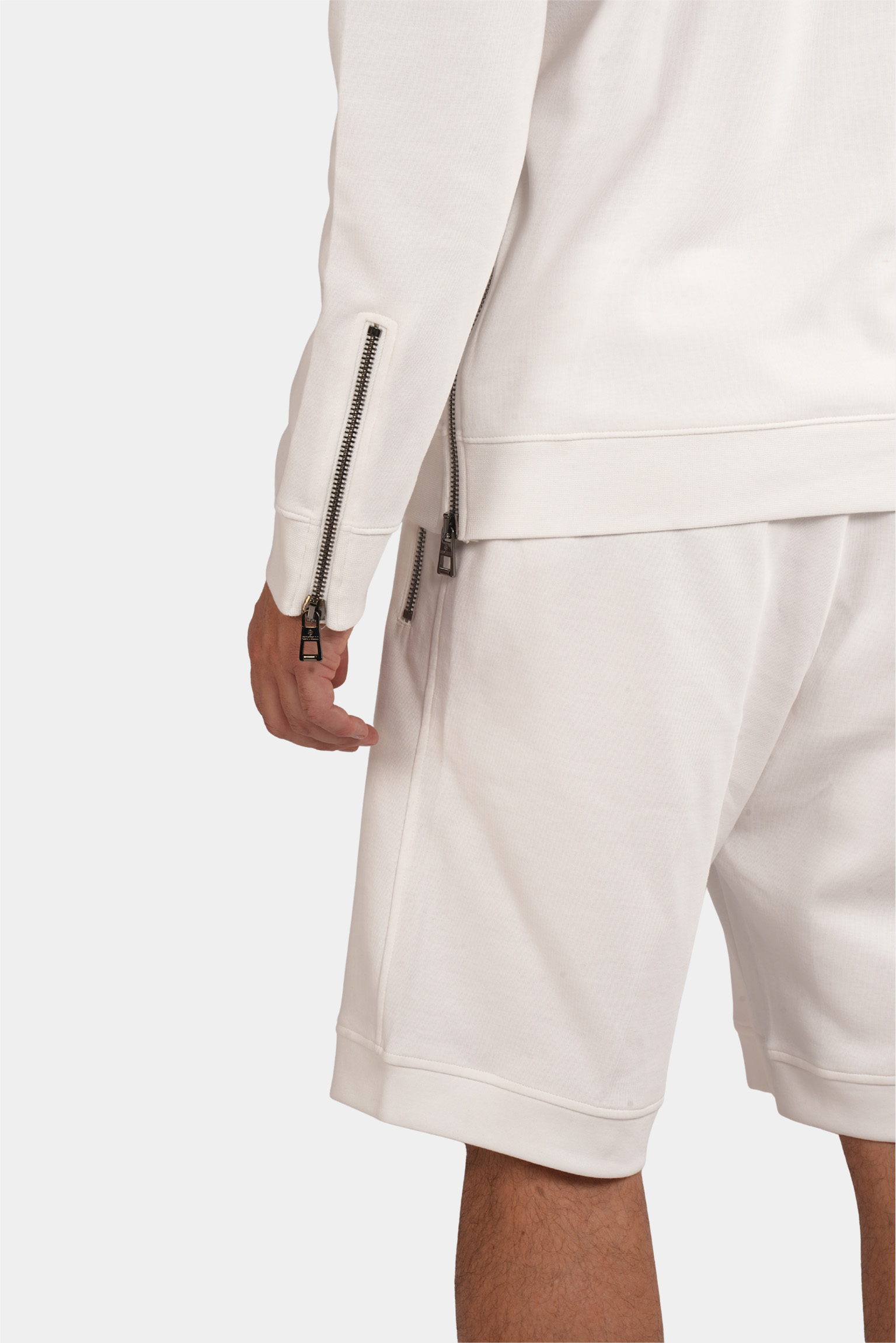 Dieser weisse Trainingsanzug verkörpert den Inbegriff von raffiniertem Minimalismus und entspannter Eleganz. Hergestellt in der Türkei aus einer hochwertigen Mischung von 85 % Baumwolle und 15 % Polyamid, bietet er höchsten Tragekomfort, Atmungsaktivität und Flexibilität. Mit klaren Linien und einer weichen Textur kombiniert das Set ein langärmliges Sweatshirt mit passenden Shorts – für einen modernen, monochromen Look, ideal für Freizeit oder Reisen.