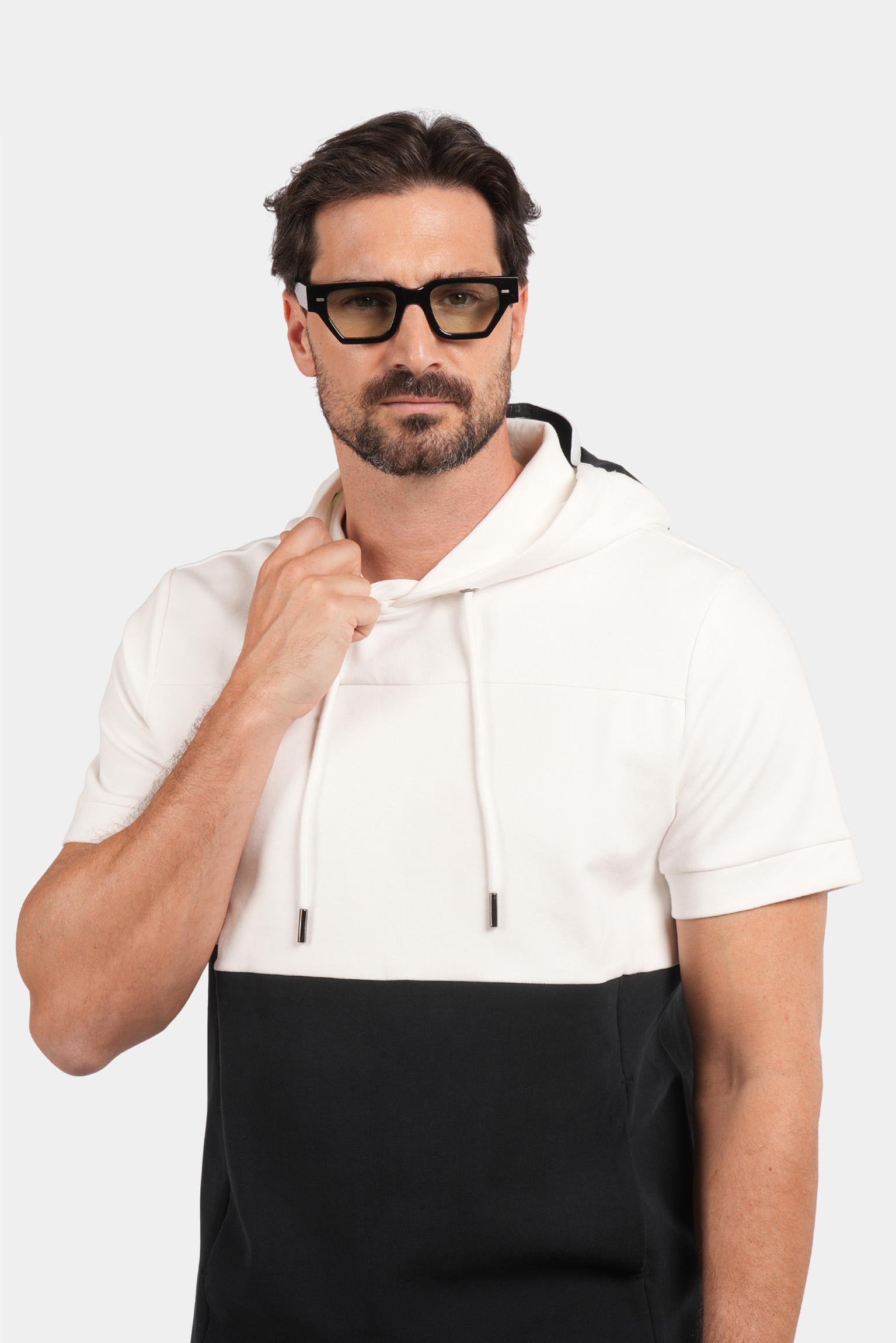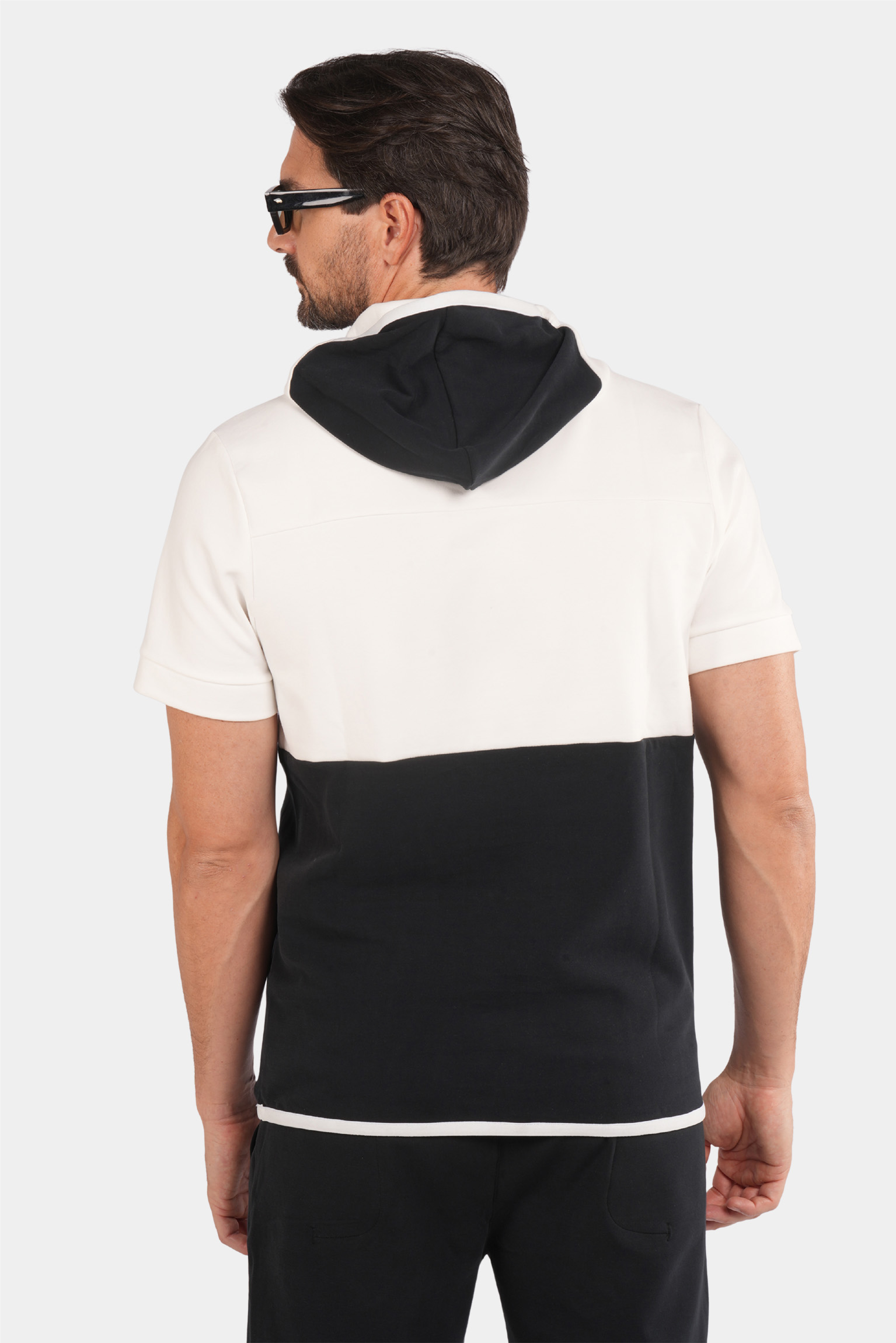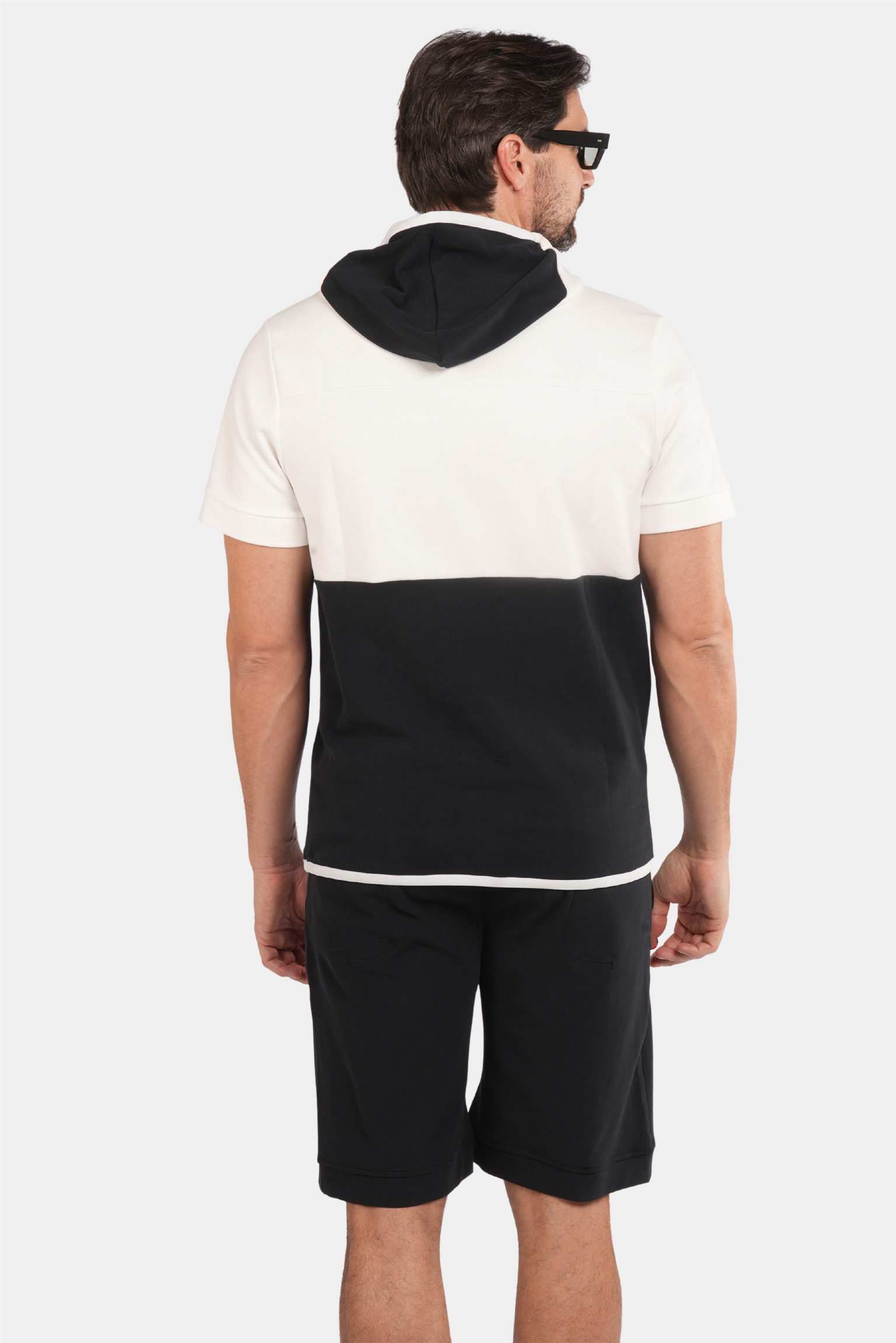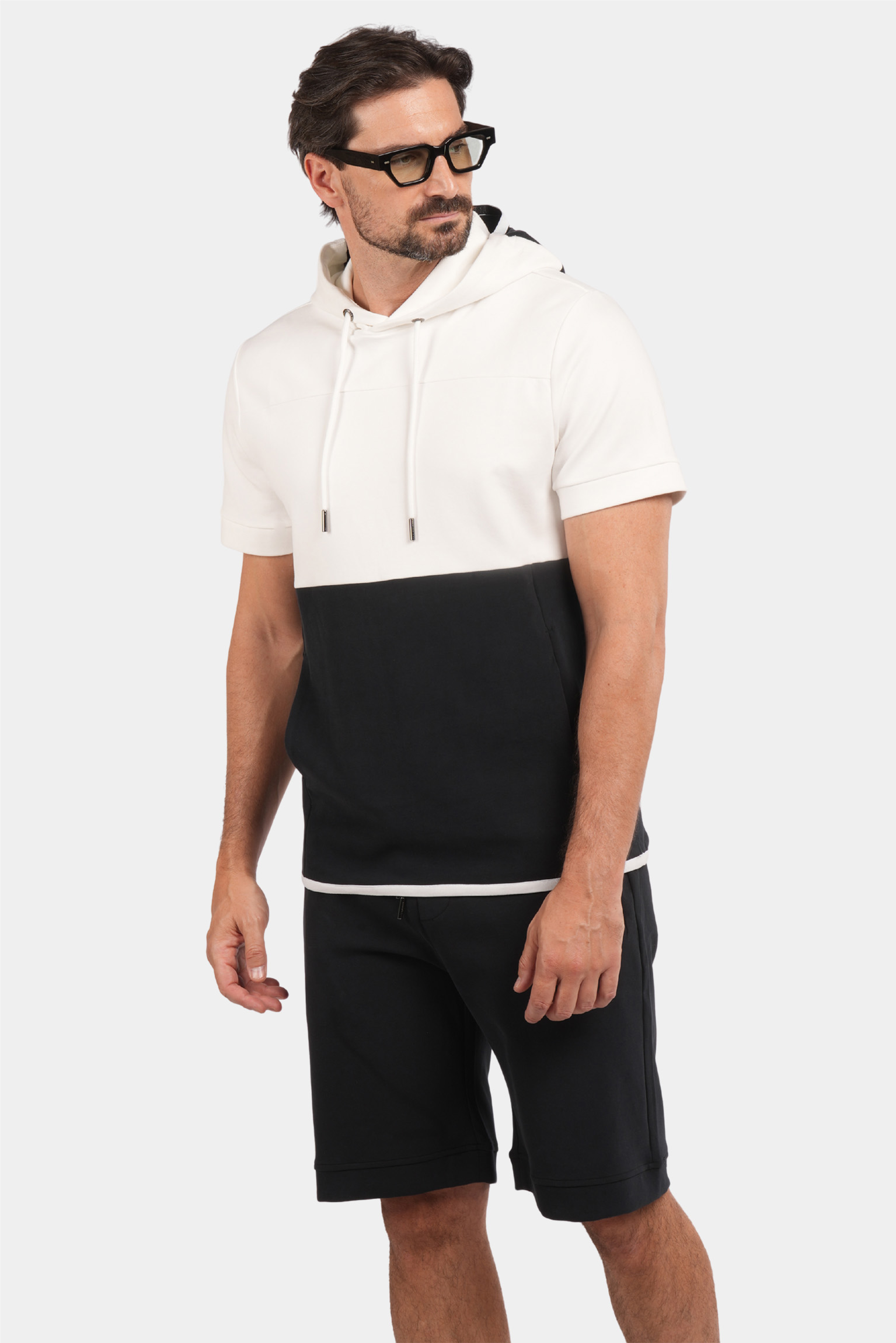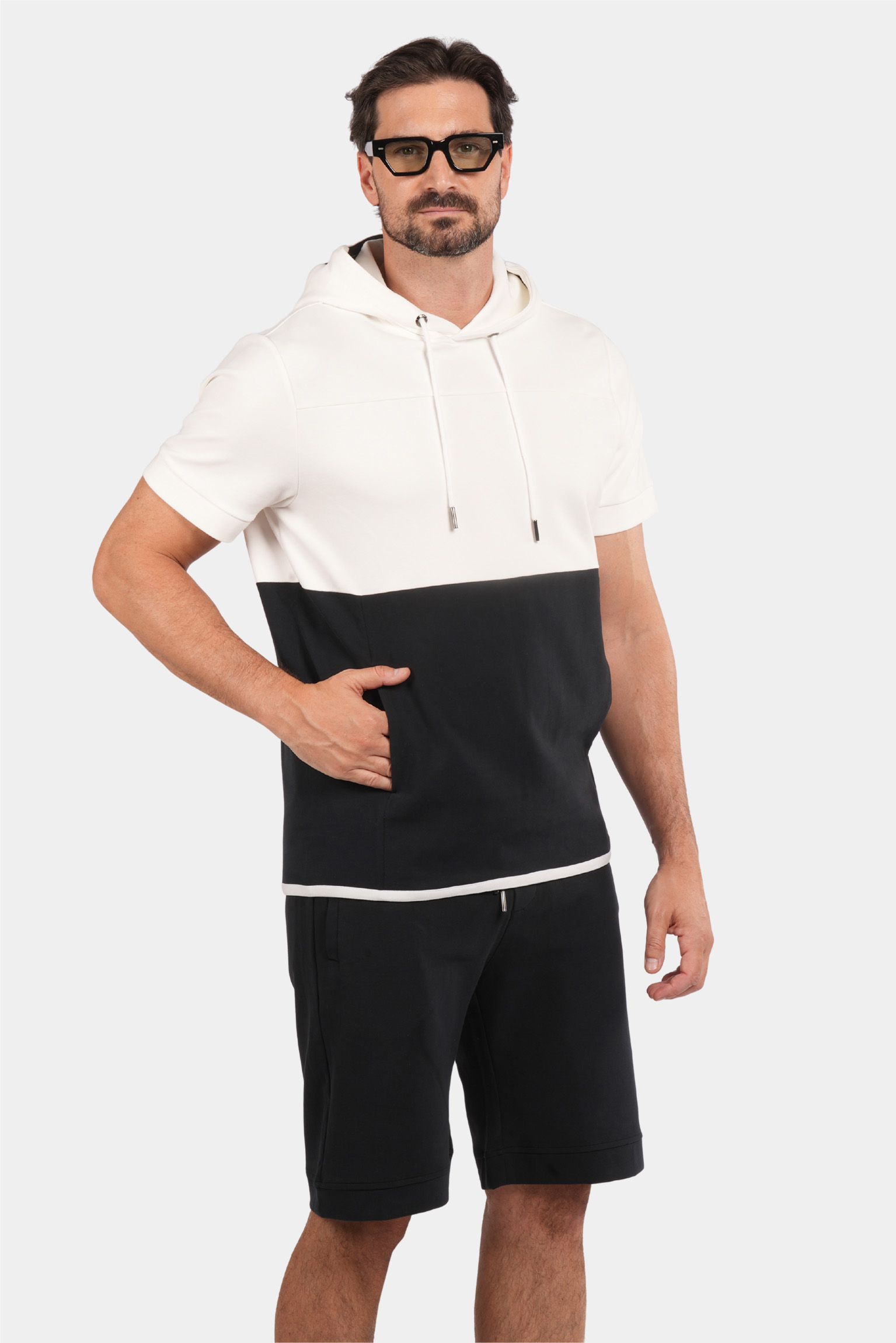 Dieser zweifarbige Trainingsanzug in Marineblau verkörpert lässige Eleganz und modernen Komfort. Hergestellt in der Türkei aus einer hochwertigen Mischung von 85 % Baumwolle und 15 % Polyamid, bietet er eine weiche Haptik, leichte Flexibilität und hervorragende Atmungsaktivität. Das kurzärmlige Hoodie in Kombination mit passenden Shorts schafft einen raffinierten, aber entspannten Look – ideal für Freizeit, Reisen und sommerliche Tage.